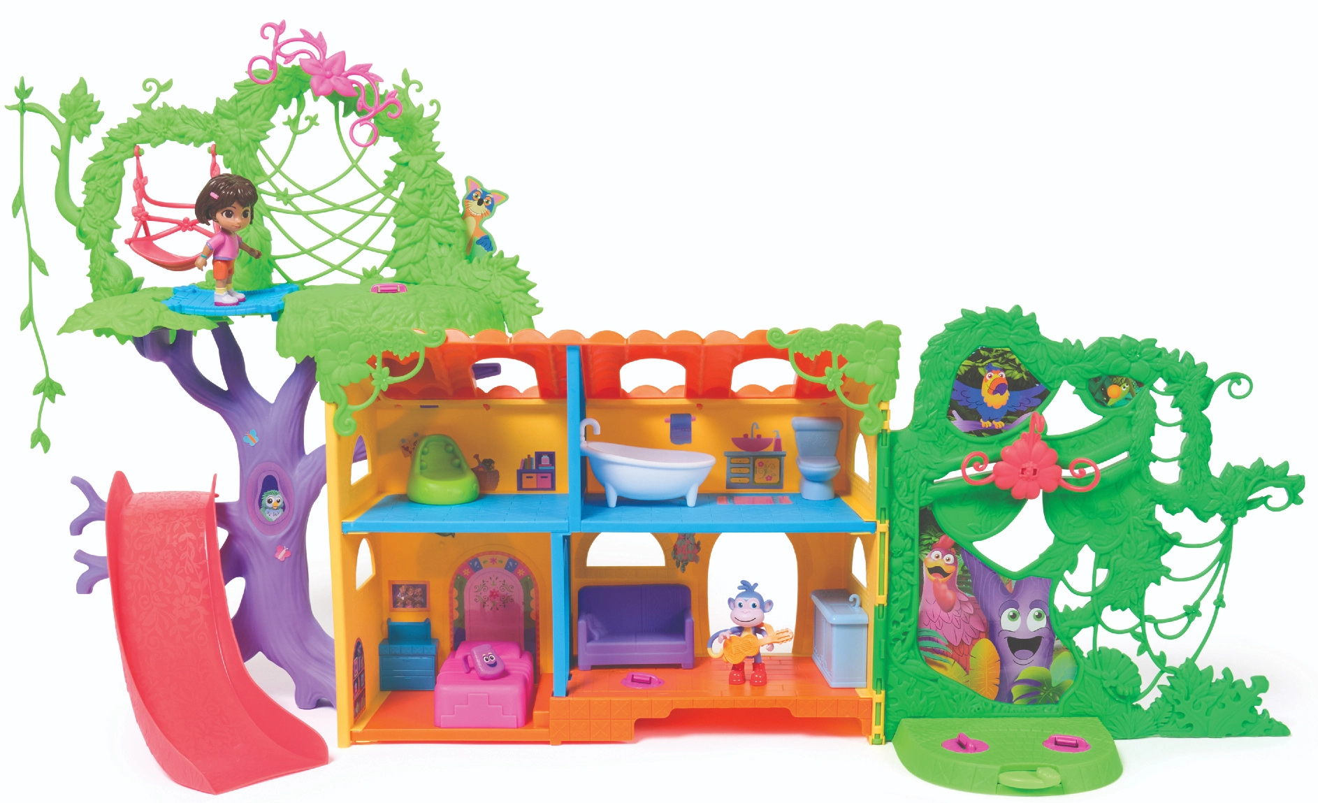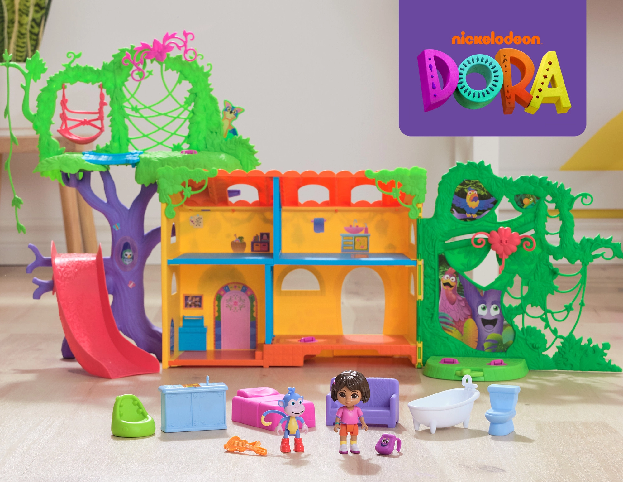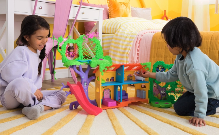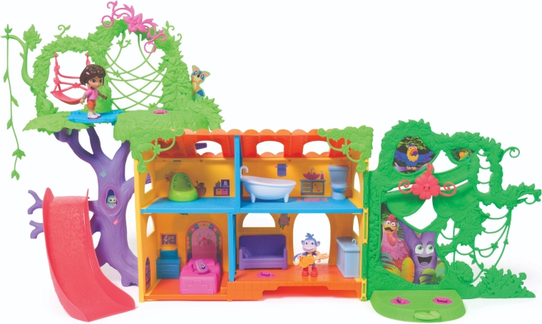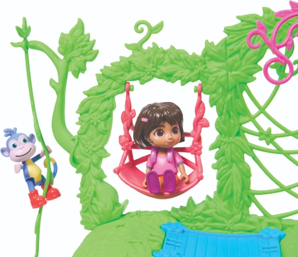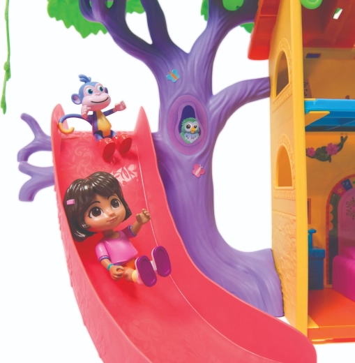Das Spielset unterstützt die Entwicklung der Vorstellungskraft, Rollenspiele und kreatives Denken. Kinder können klettern, rutschen, schaukeln und mit ihren Lieblingshelden eigene Geschichten erzählen. Im Set enthalten sind eine Dora-Figur, eine Boots-Figur, der ikonische Rucksack, 6 Möbelstücke und eine Sammelkarte.
