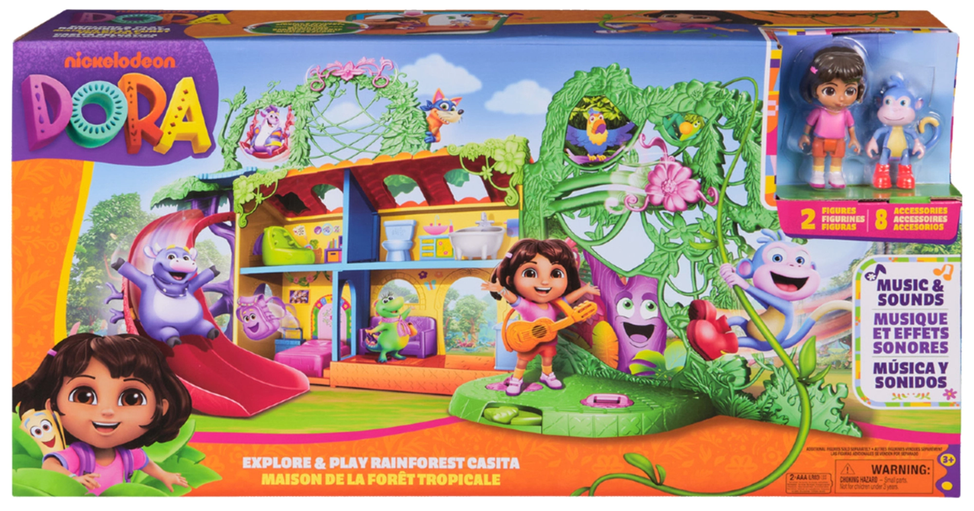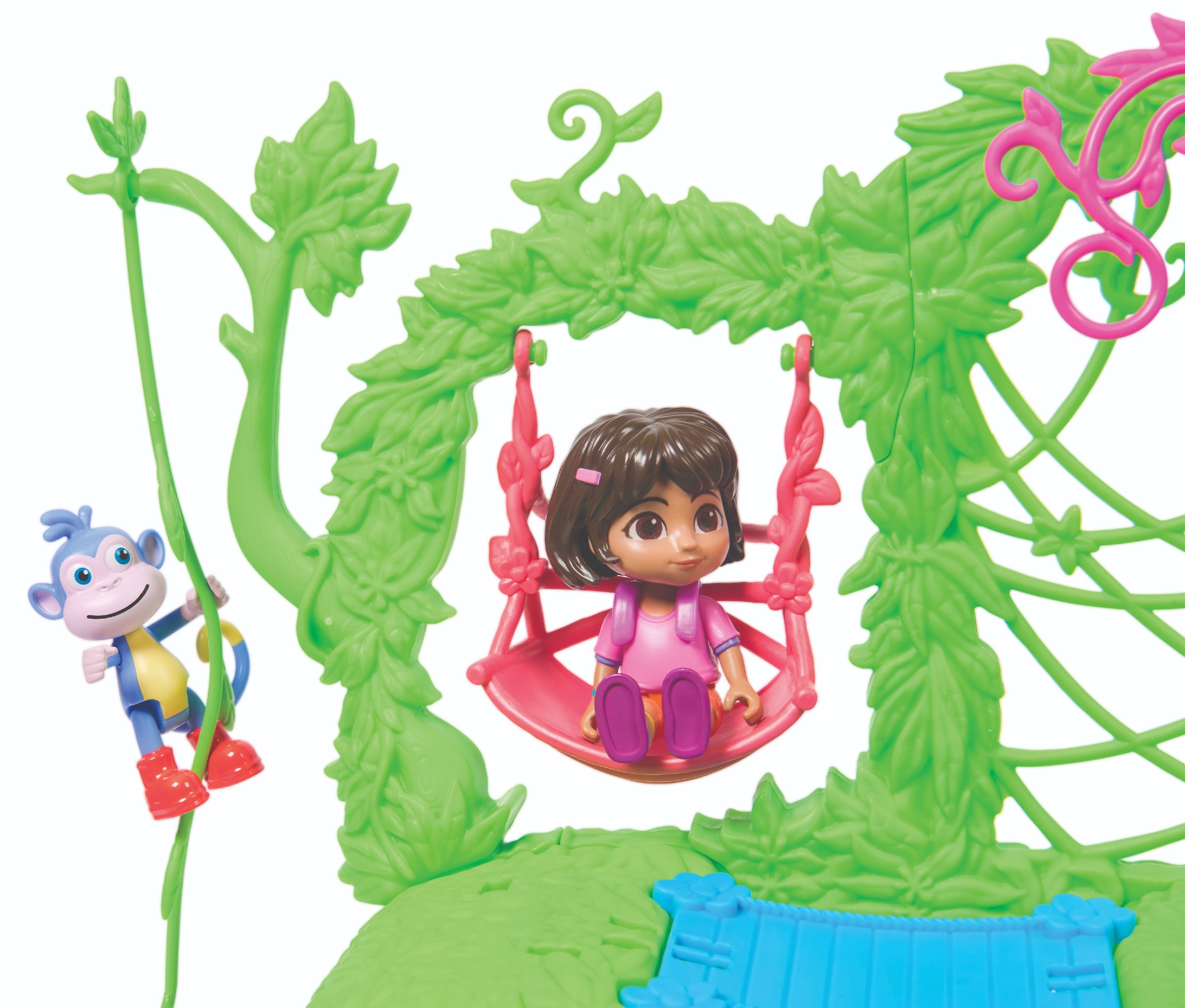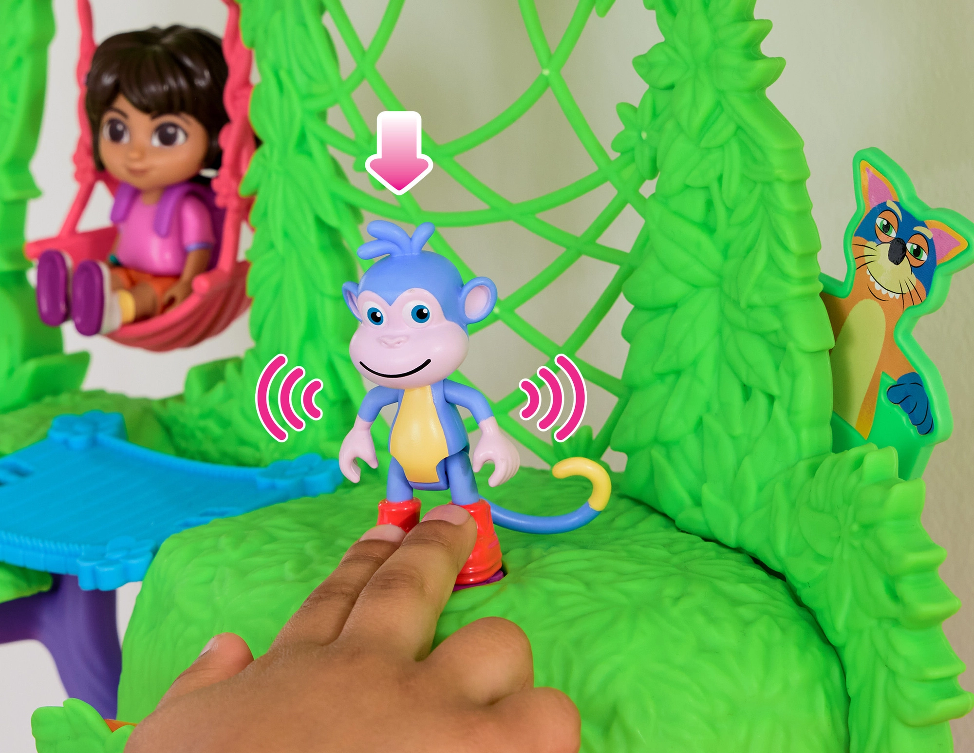 Das Spielset unterstützt die Entwicklung der Vorstellungskraft, Rollenspiele und kreatives Denken. Kinder können klettern, rutschen, schaukeln und mit ihren Lieblingshelden eigene Geschichten erzählen. Im Set enthalten sind eine Dora-Figur, eine Boots-Figur, der ikonische Rucksack, 6 Möbelstücke und eine Sammelkarte.