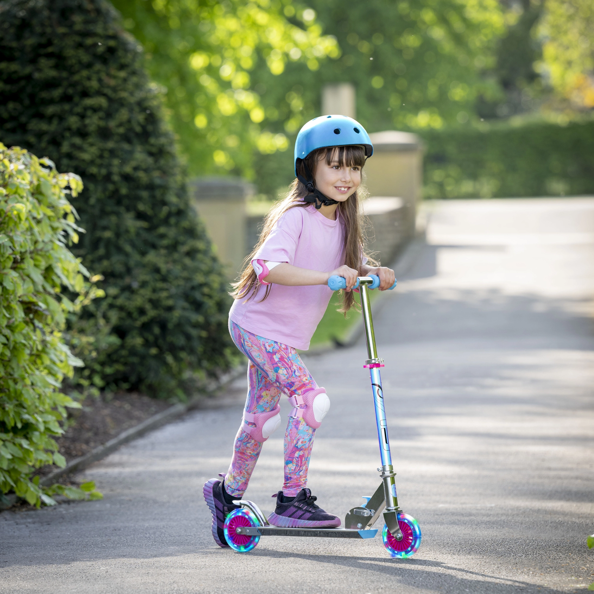 Der EVO Holographic Inline Roller verbindet Spaß und Sicherheit. Dank der leuchtenden LED-Räder ist jede Fahrt attraktiv, während die höhenverstellbare Lenkstange (ca. 67–77 cm) eine bequeme Anpassung an das Wachstum des Kindes ermöglicht. Die klappbare Konstruktion erleichtert den Transport und die Aufbewahrung zu Hause oder im Kofferraum.