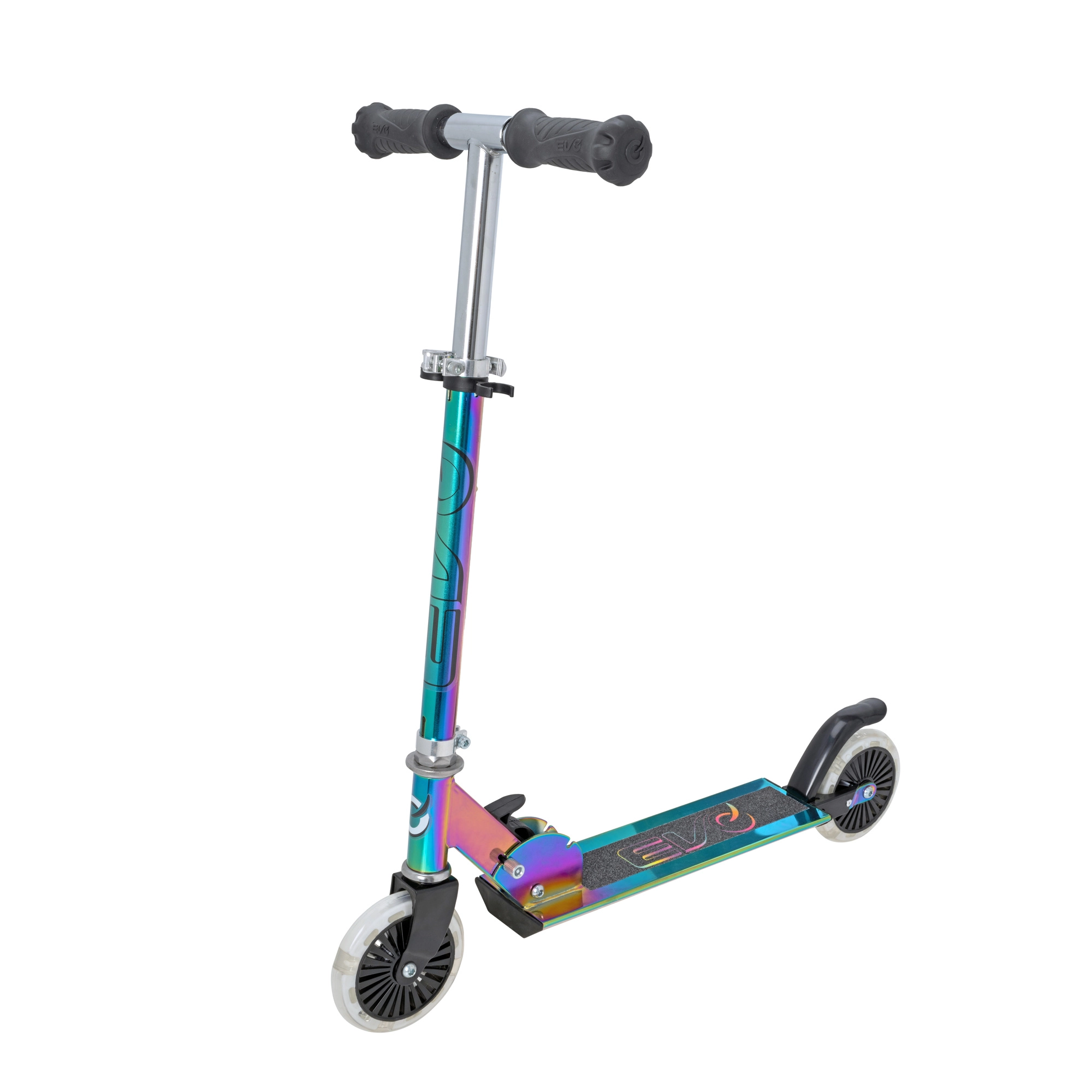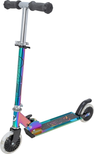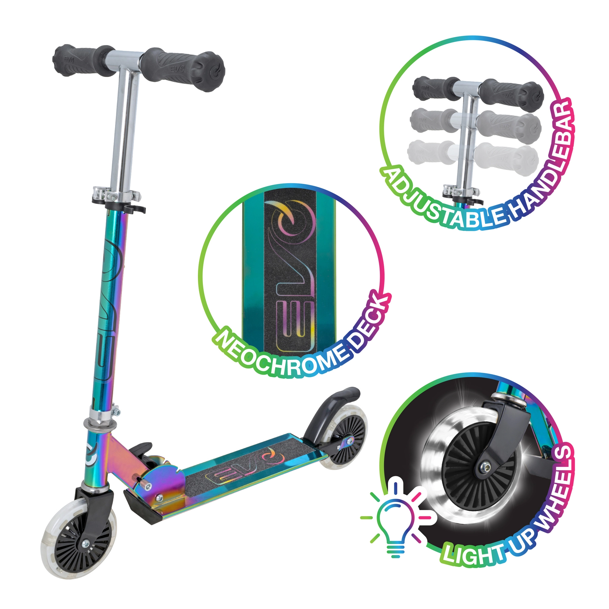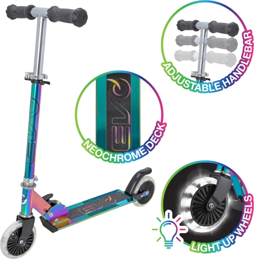 Der EVO Light Up Neochrome Roller ist eine tolle Wahl für kleine Fahrer, die auffallen möchten. Dank des höhenverstellbaren Lenkers (ca. 67–77 cm) wächst er mit dem Kind mit, der Klappmechanismus erleichtert Transport und Aufbewahrung und die robuste Metallkonstruktion mit rutschfester Trittfläche sorgt für Sicherheit beim Fahren.
