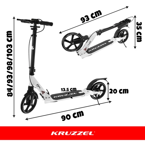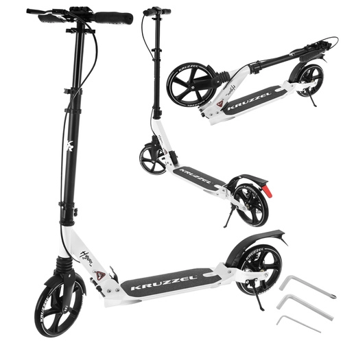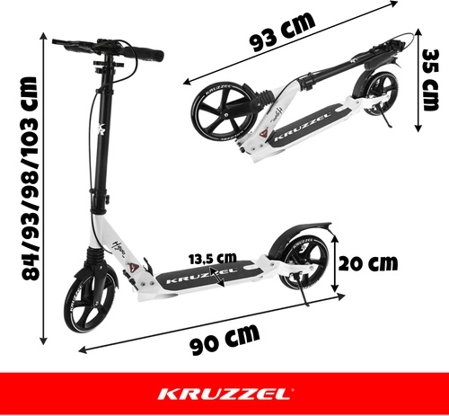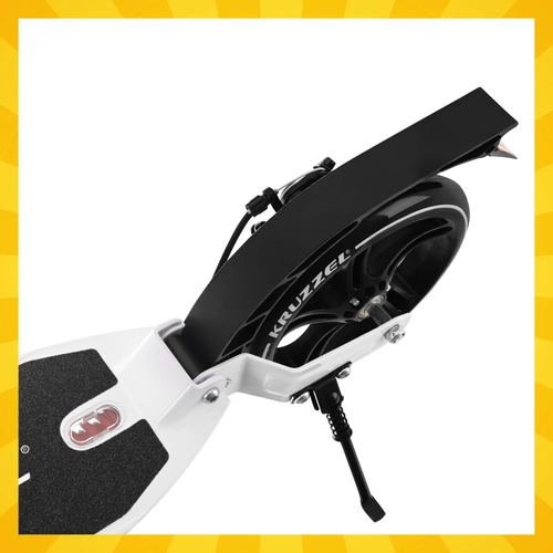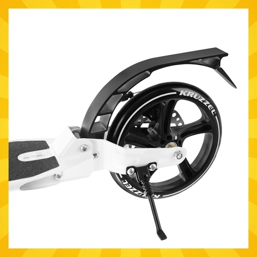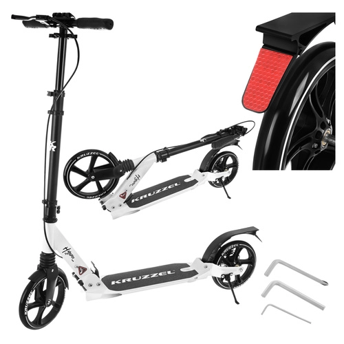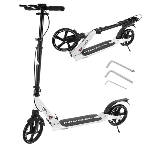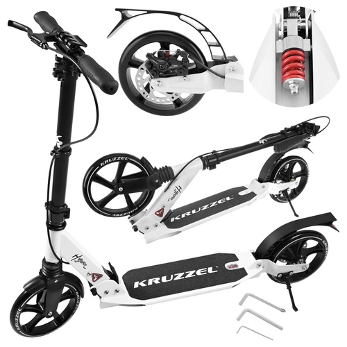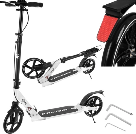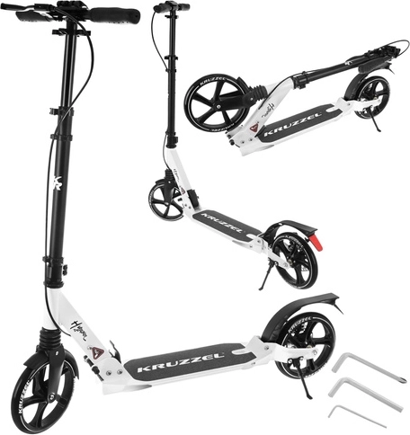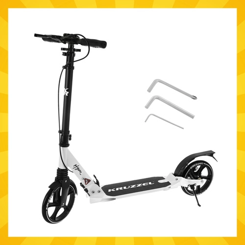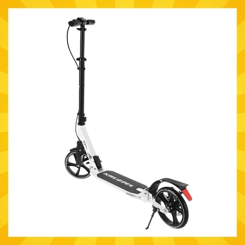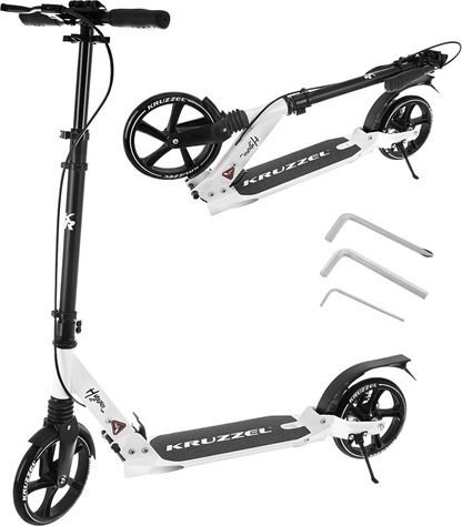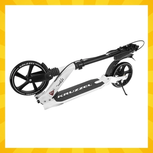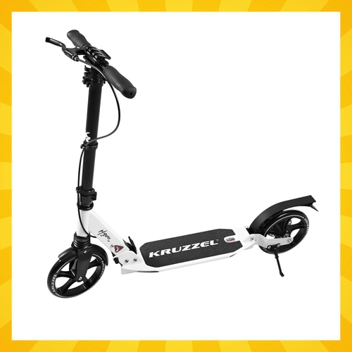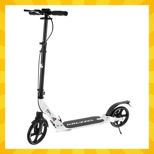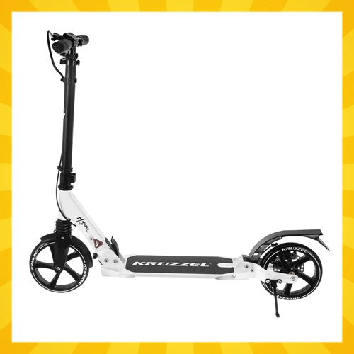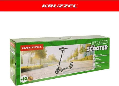 Entdecken Sie einen zuverlässigen City-Scooter, der Komfort, Sicherheit und einfache Transportfähigkeit vereint. Das Modell KRUZZEL Hyperion verfügt über 200-mm-Gummiräder für eine stabile Fahrt über Unebenheiten, hochwertige ABEC-9-Lager für leichtes Abrollen und eine Federung, die Vibrationen auf Pflaster und Asphalt reduziert.