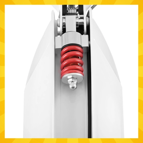 Der Scooter lässt sich leicht auf ein kompaktes Maß zusammenklappen. Die hintere Federung dämpft Stöße, und die 4-stufige Lenkerverstellung passt sich sowohl Kindern als auch Erwachsenen an.