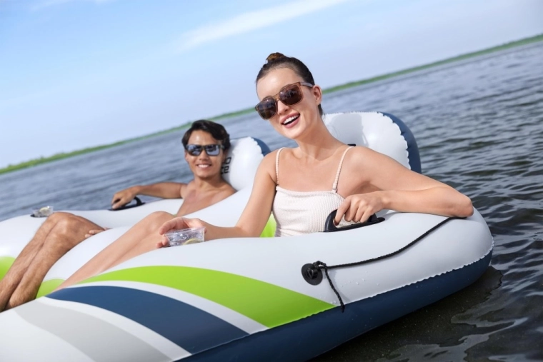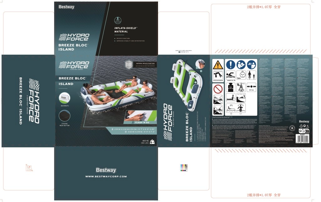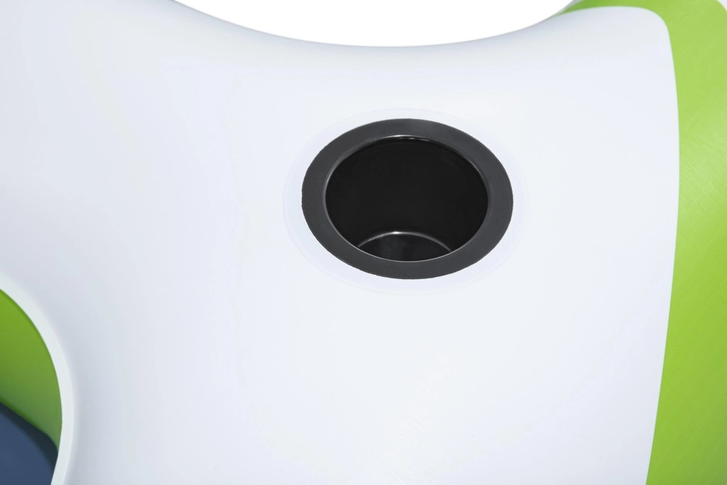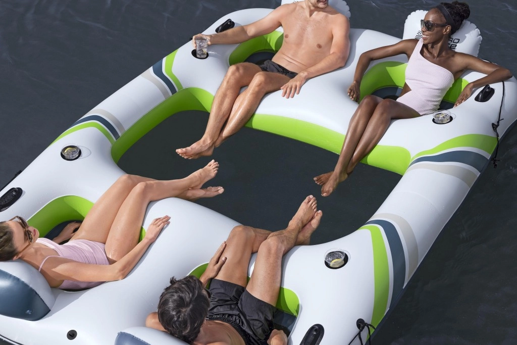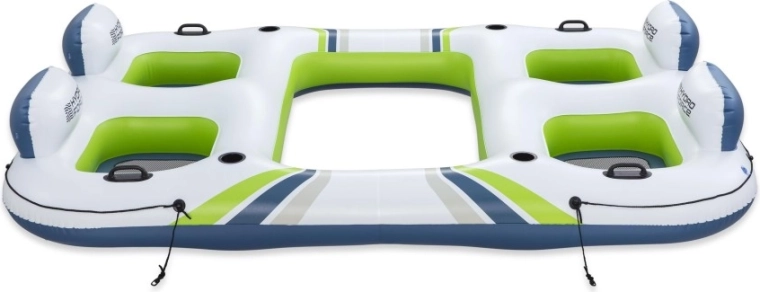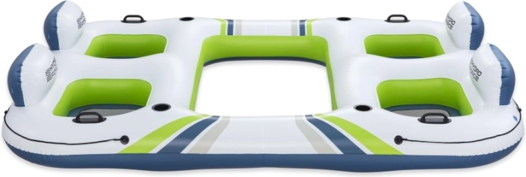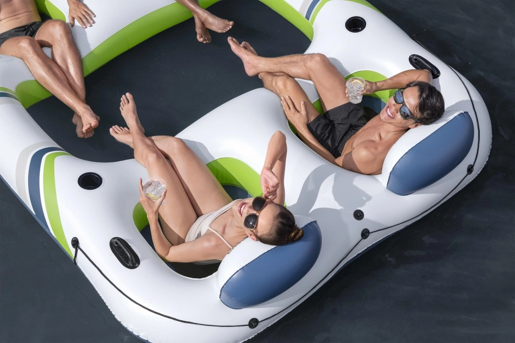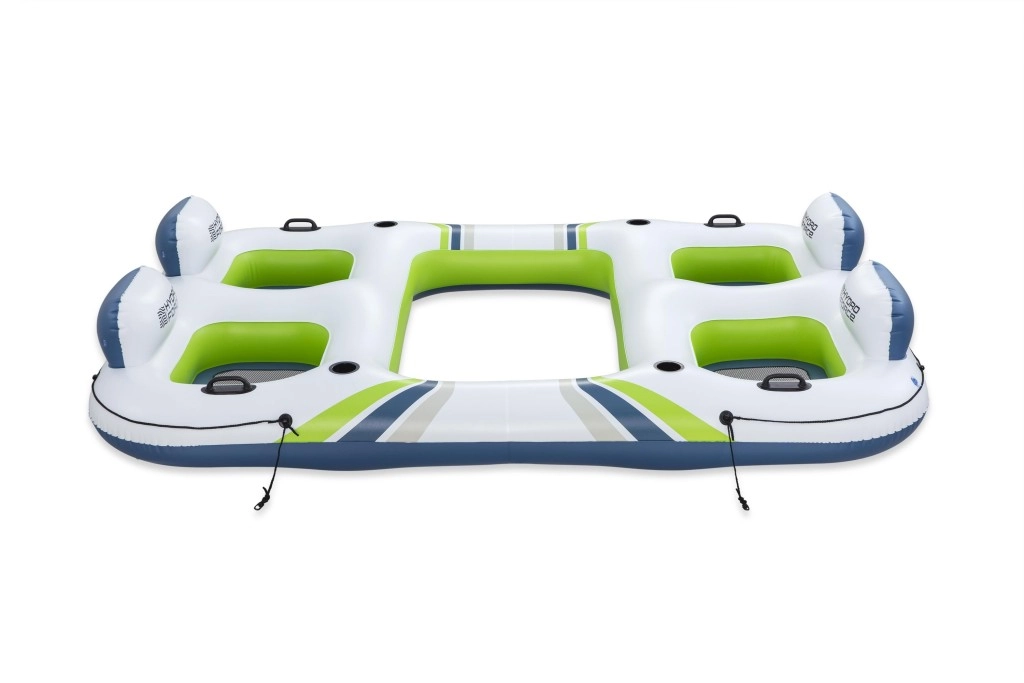 Die widerstandsfähige Inflata‑Shield™-Oberfläche minimiert das Risiko von Rissen und erhöht die Steifigkeit der gesamten Konstruktion. Schnellverschlussventile beschleunigen das Auf- und Ablassen der Luft, während vier integrierte Getränkehalter Ihre Erfrischung stets griffbereit halten. Zwei Clasp ’N Go™-Konnektoren erlauben das Verbinden der Insel mit weiteren Schwimmkörpern und schaffen eine größere Relax‑Zone auf dem Wasser.