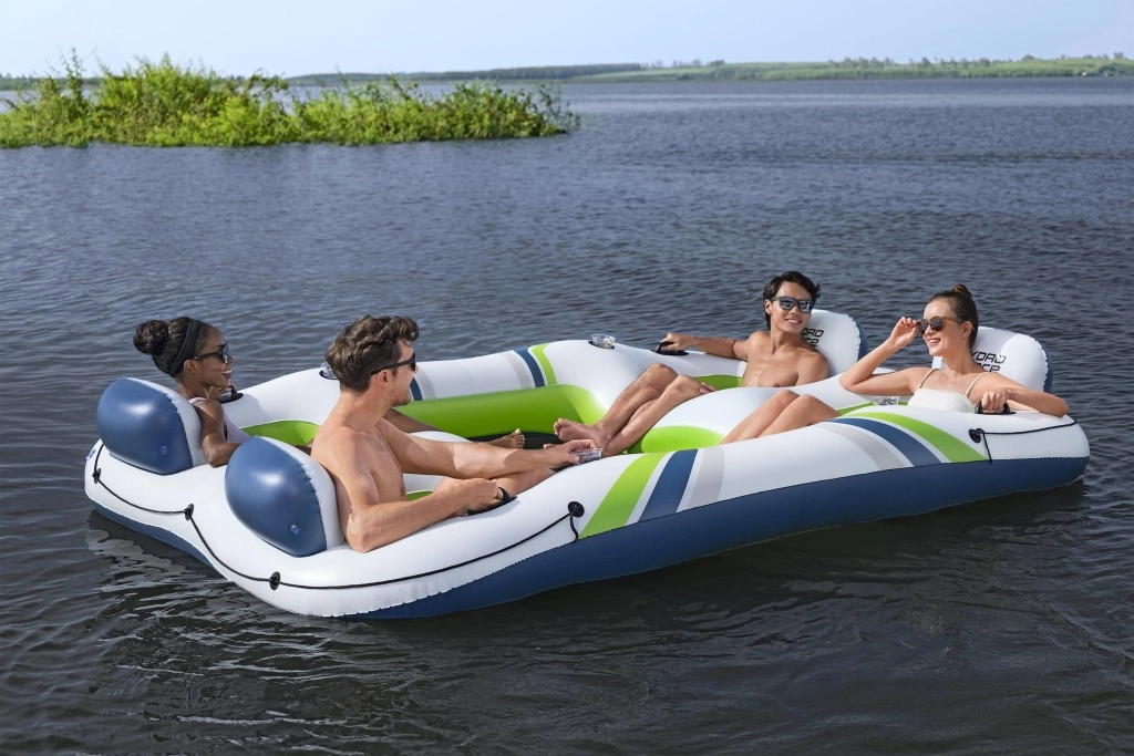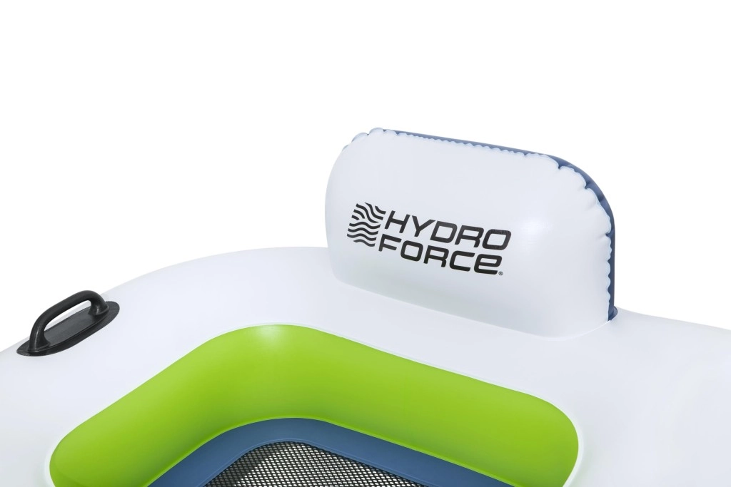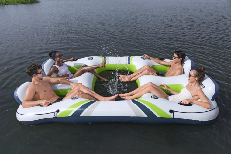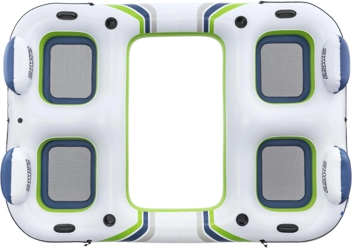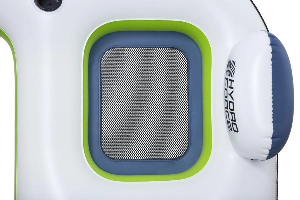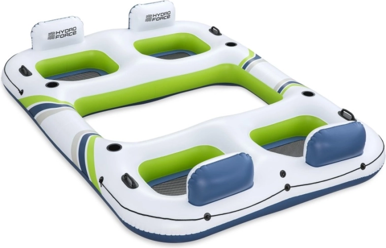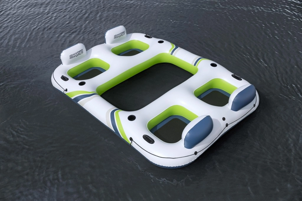 Die große aufblasbare HYDRO‑FORCE Insel ist ideal zum Relaxen am See, am Meer oder im Pool. Vier ergonomische Sitze mit Netz kühlen die Füße angenehm, und eine zentrale Öffnung ermöglicht jederzeit Erfrischung. Dank mehrerer Luftkammern, stabiler Griffe und eines umlaufenden Seils sind Einsteigen und Handhabung im Wasser einfach und sicher.