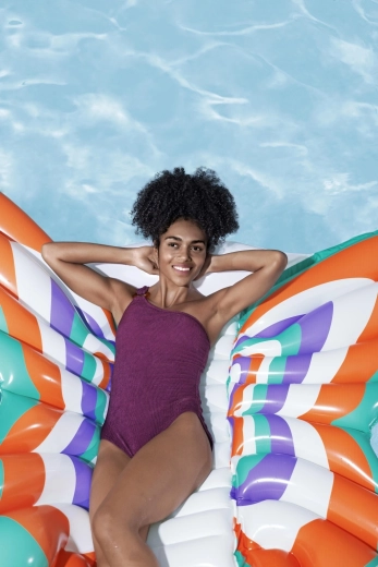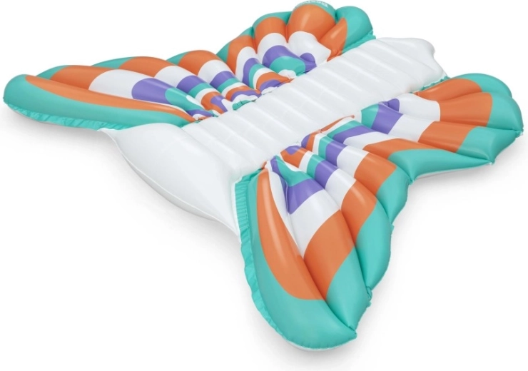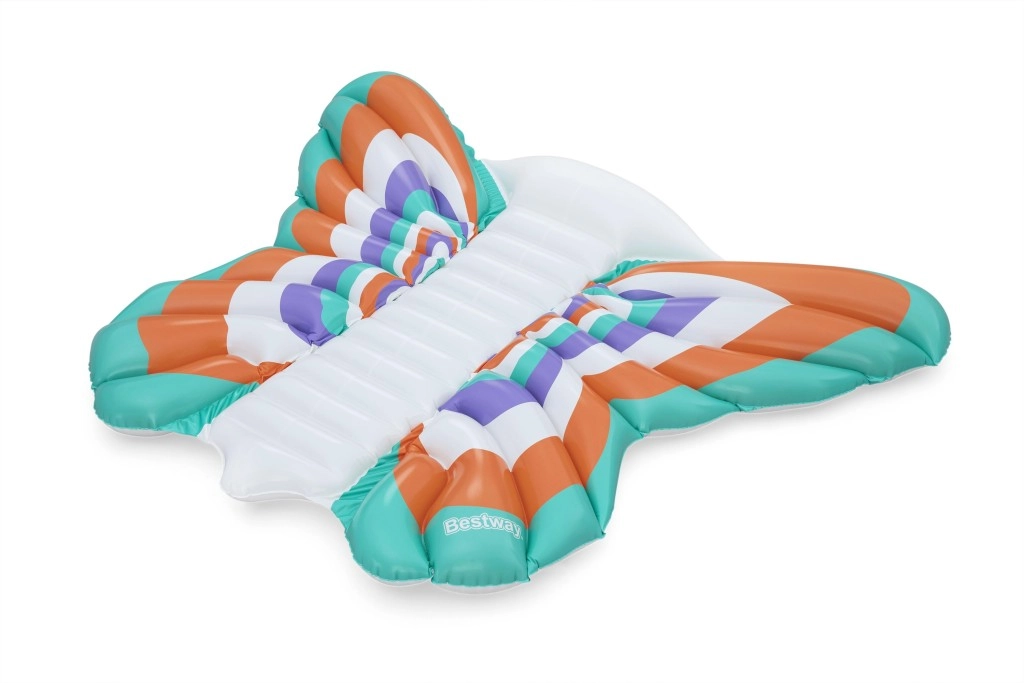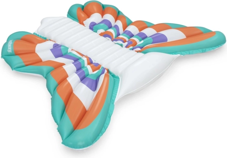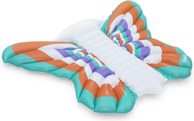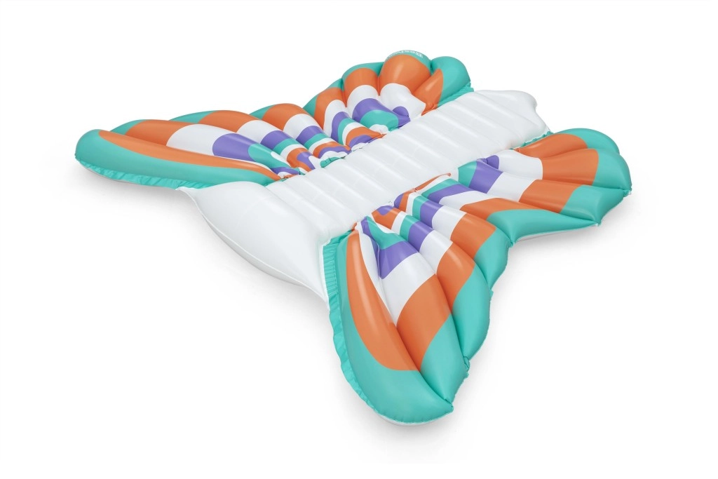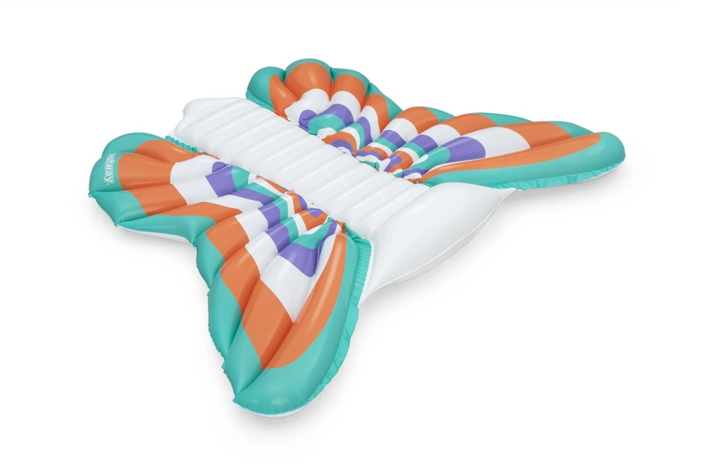 Diese stylische aufblasbare Matratze im Design von Schmetterlingsflfcgeln bietet eine gelungene Kombination aus Komfort und Spadf. Farbige Paneele in Orange, Tfcrkis, Violett und Weidf sorgen ffcr einen auffe4lligen Look, we4hrend der gerippte Mittelstreifen eine bequeme Rfcckenstfctze und eine entspannte Position auf dem Wasser bietet.