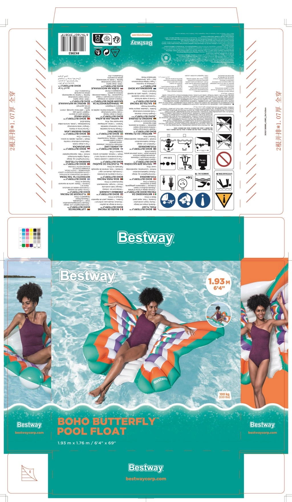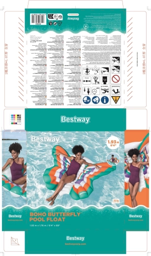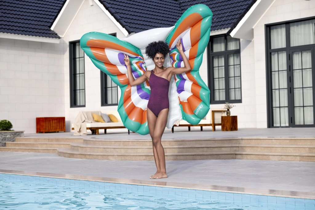 Genießen Sie den Sommer auf dem Wasser mit der aufblasbaren Matratze in Schmetterlingsform mit den Maßen 193 × 176 cm. Sie bietet viel Platz und bequemes Liegen, Stabilität auf der Wasseroberfläche und robustes Material mit Color Shield-Technologie, das die Farben leuchtend hält und keine Farbabgabe auf nasser Haut verursacht. Dank der maximalen Tragfähigkeit von 100 kg und dem Schnellaufblasventil ist sie ideal für Pool, See und Meer.