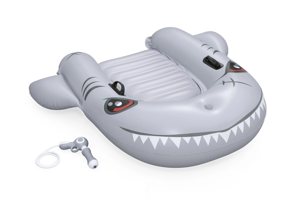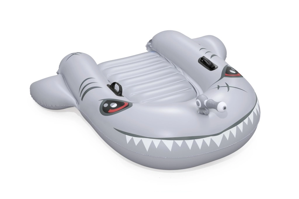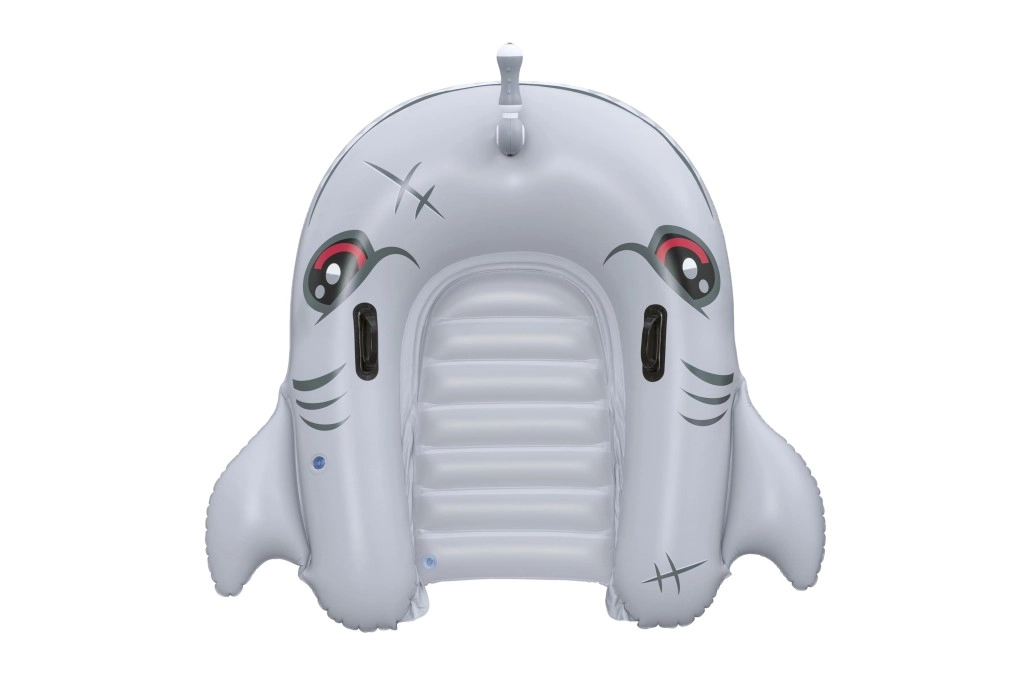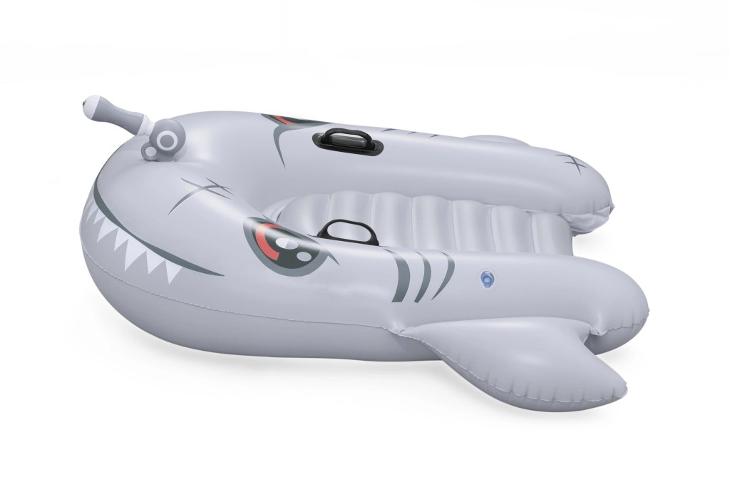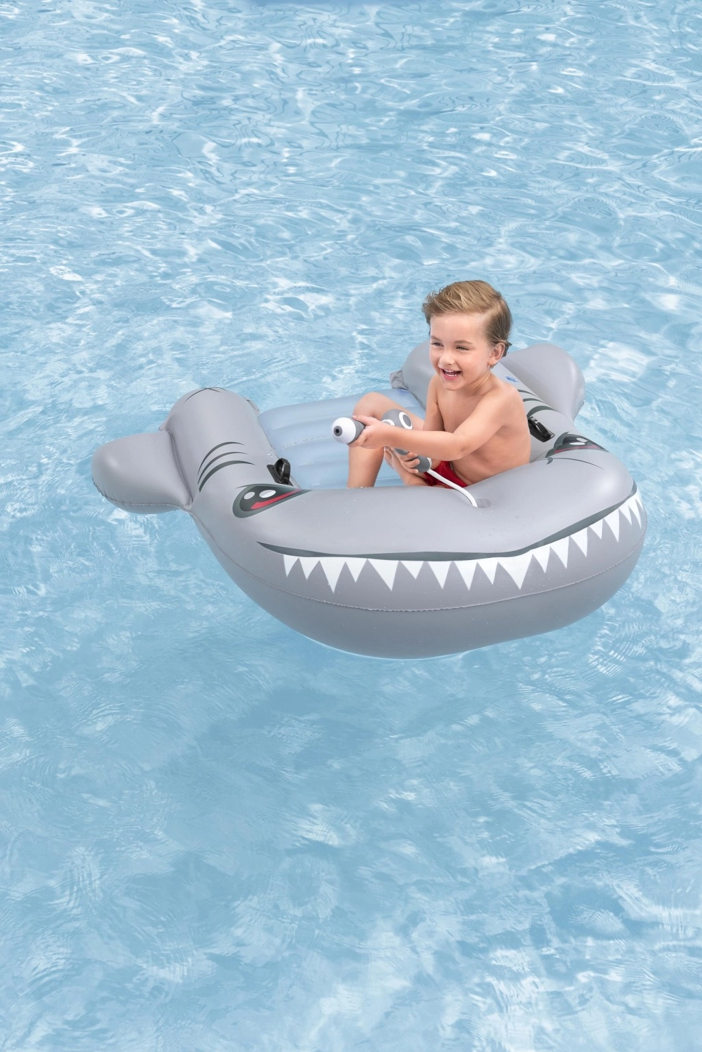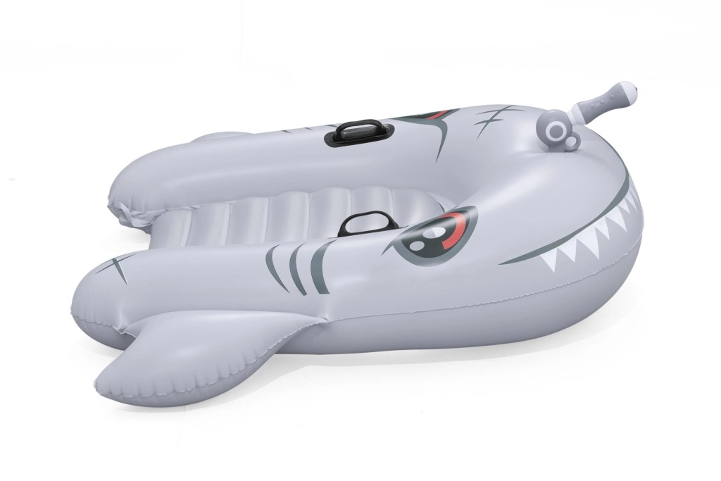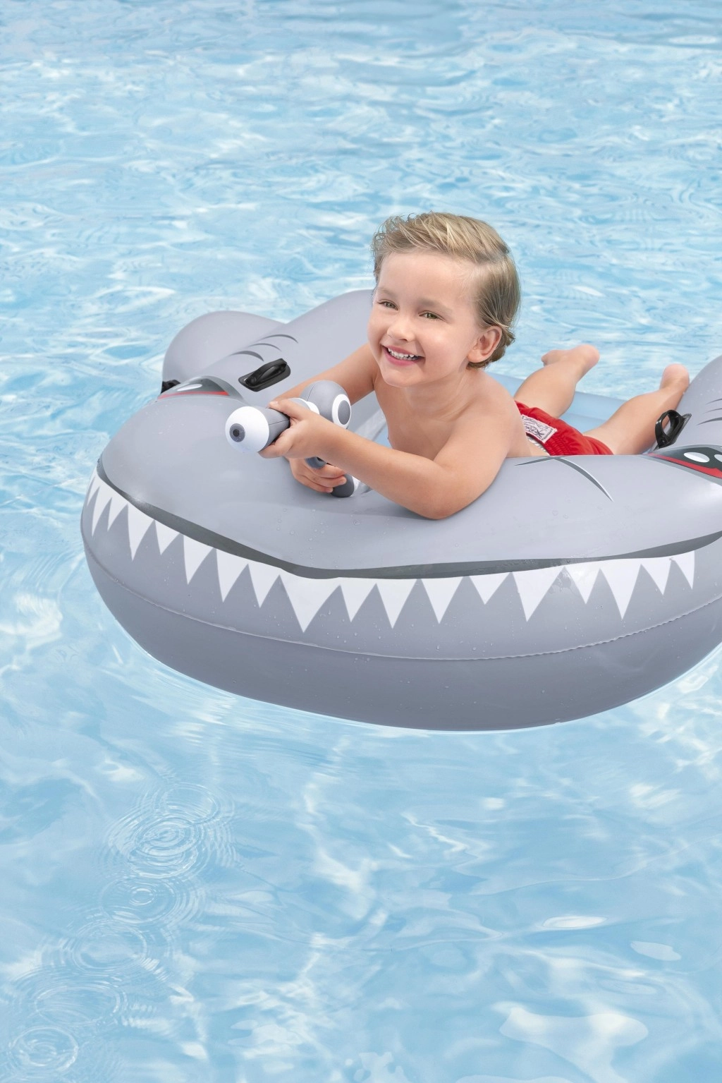 Das aufblasbare Fahrzeug in Hai-Form bringt Spaß und Komfort in den Pool. Das realistische grau-silberne Design mit Augen und Zähnen fällt sofort ins Auge, während die gerippte Sitzfläche und die erhöhten Seiten für einen stabilen und bequemen Sitz sorgen. Zwei stabile Haltegriffe helfen Kindern, das Gleichgewicht zu halten und einfach zu manövrieren.