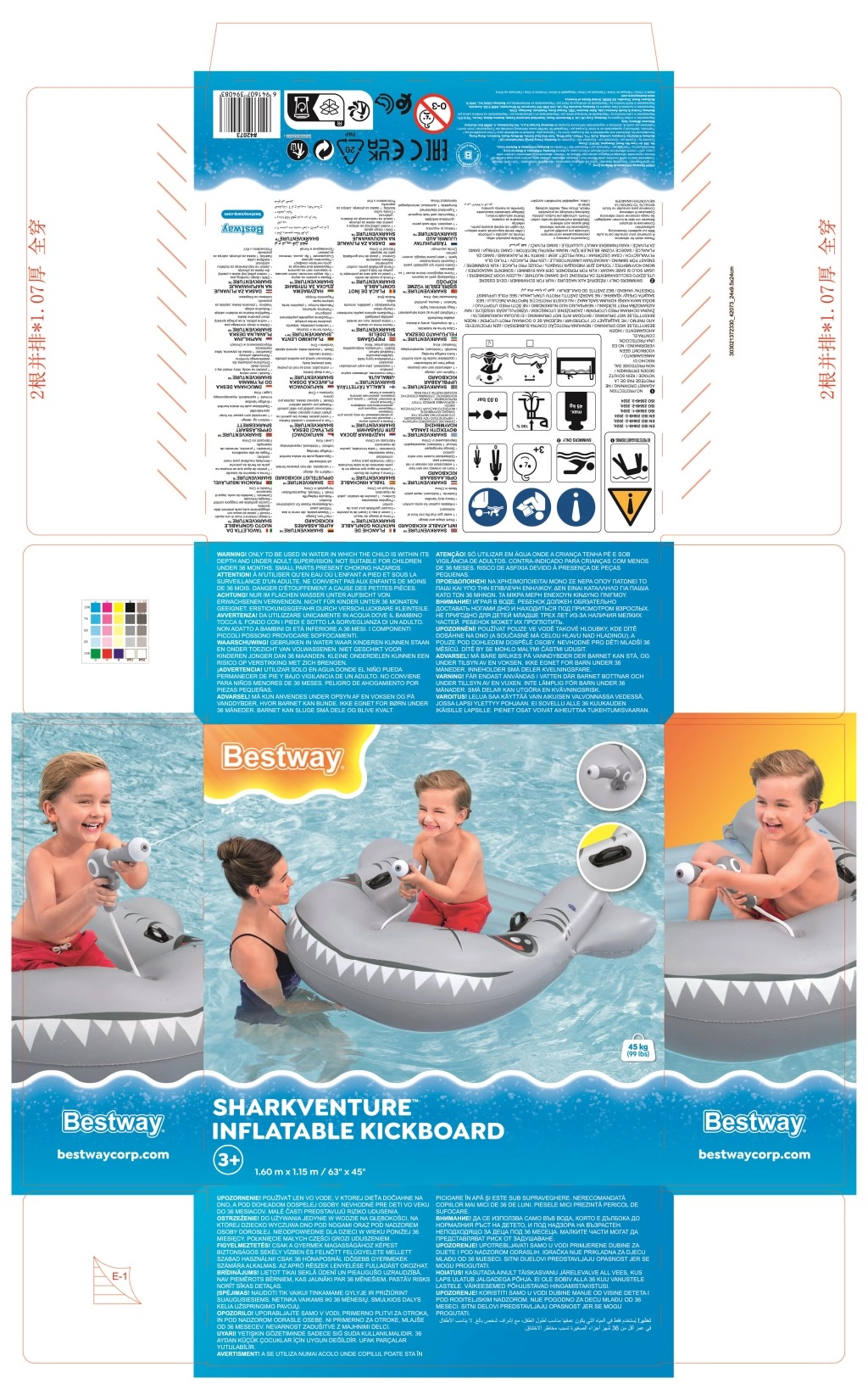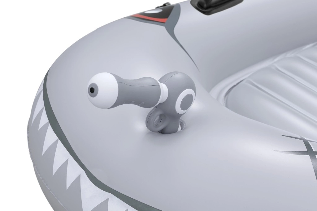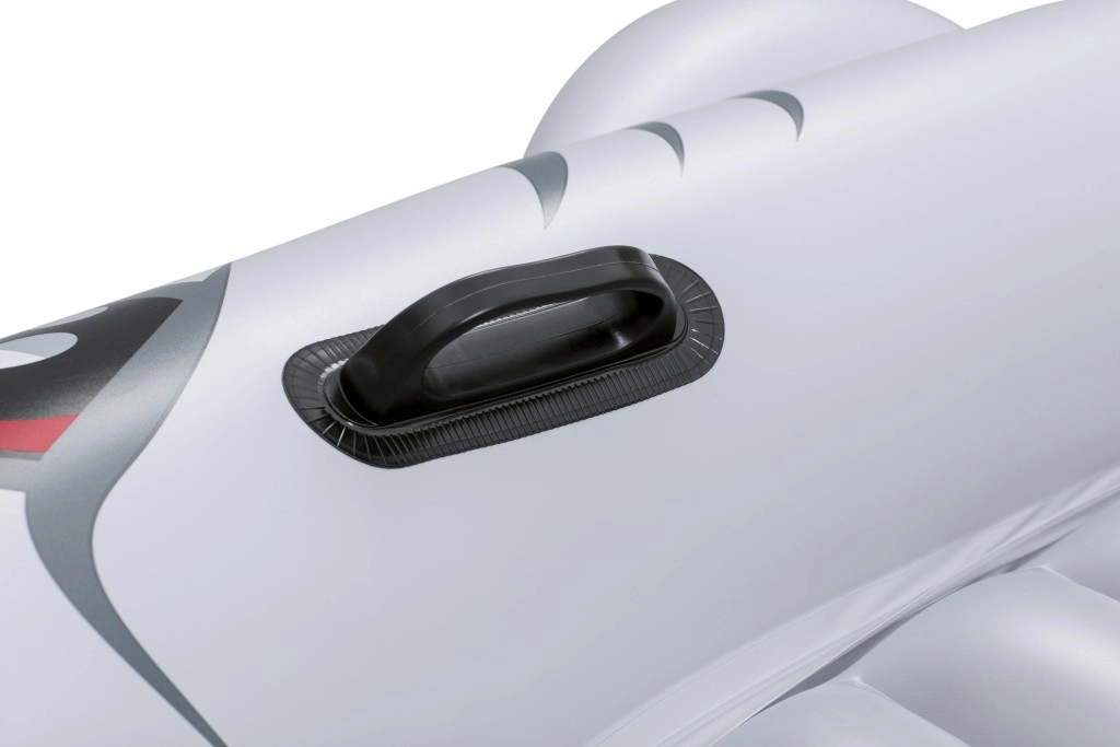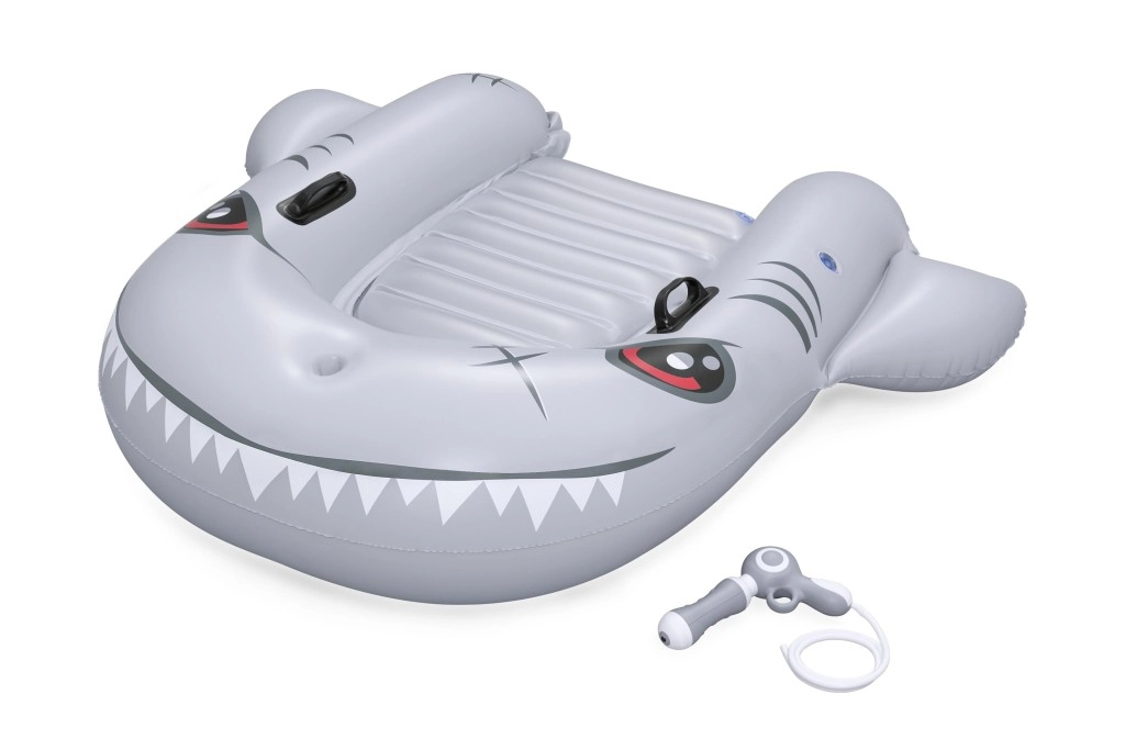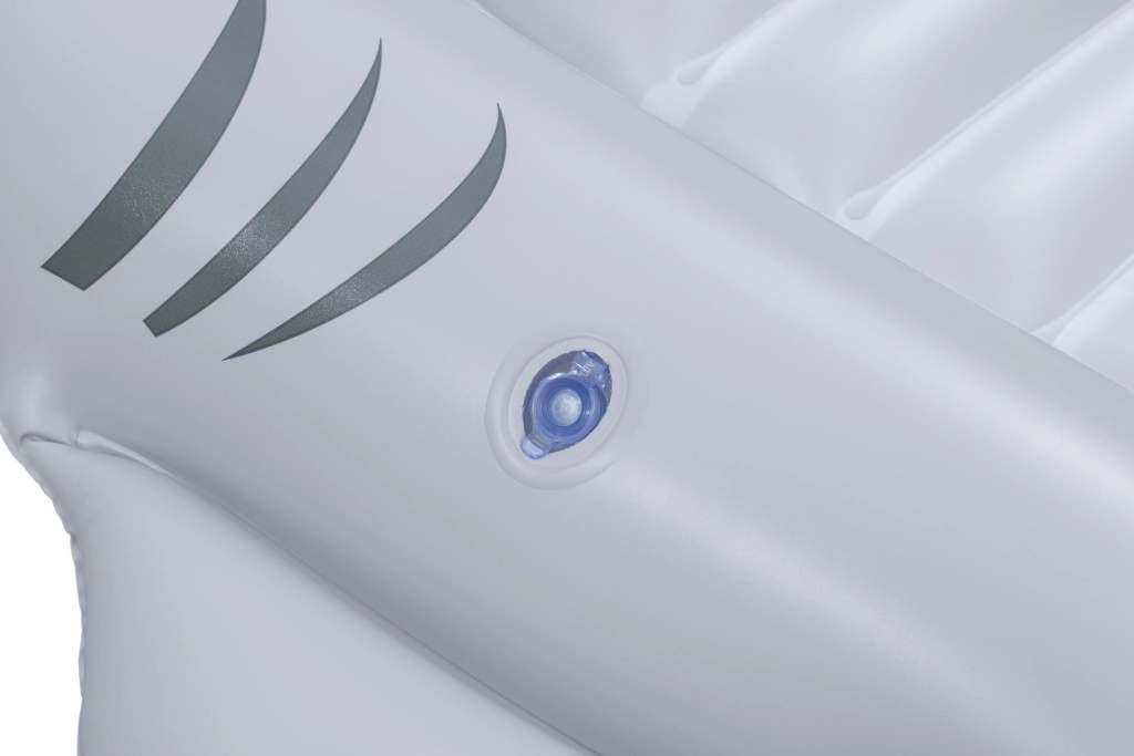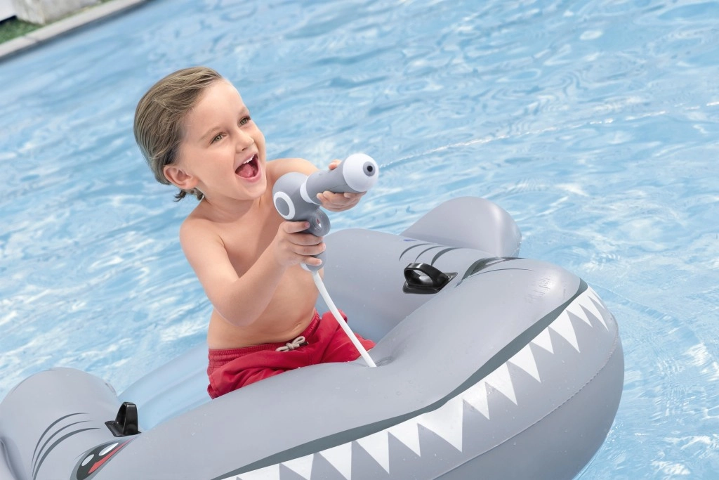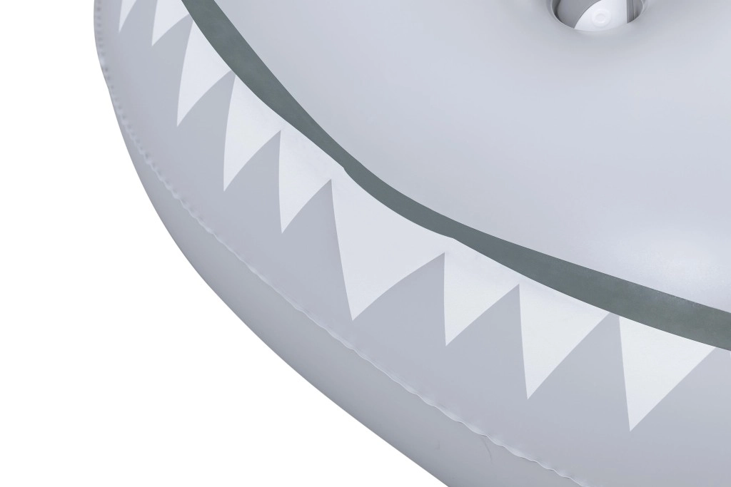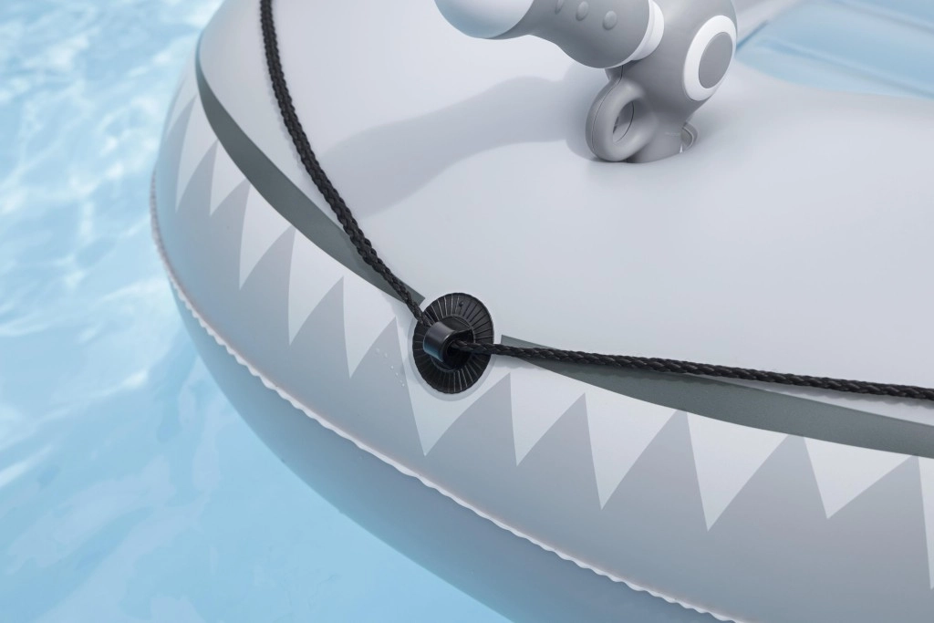 Das aufblasbare Fahrzeug in Hai-Form bringt Spaß und Komfort in den Pool. Das realistische grau-silberne Design mit Augen und Zähnen fällt sofort ins Auge, während die gerippte Sitzfläche und die erhöhten Seiten für einen stabilen und bequemen Sitz sorgen. Zwei stabile Haltegriffe helfen Kindern, das Gleichgewicht zu halten und einfach zu manövrieren.