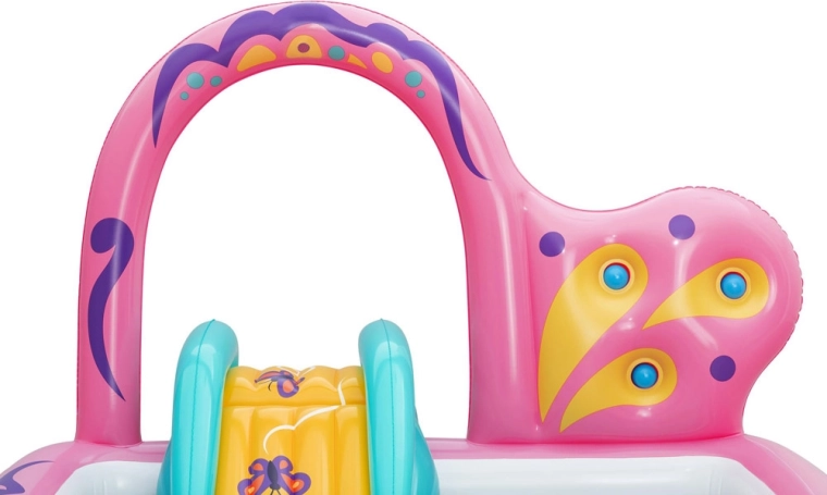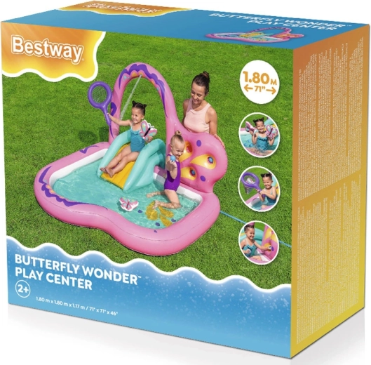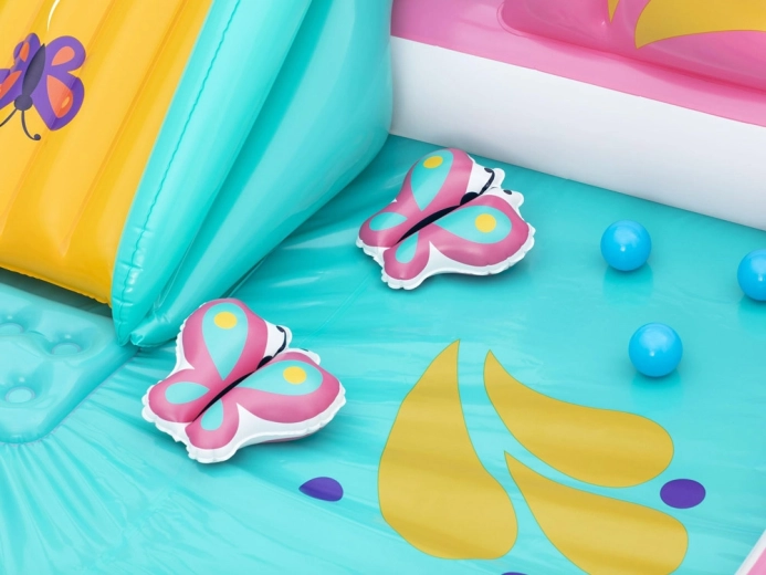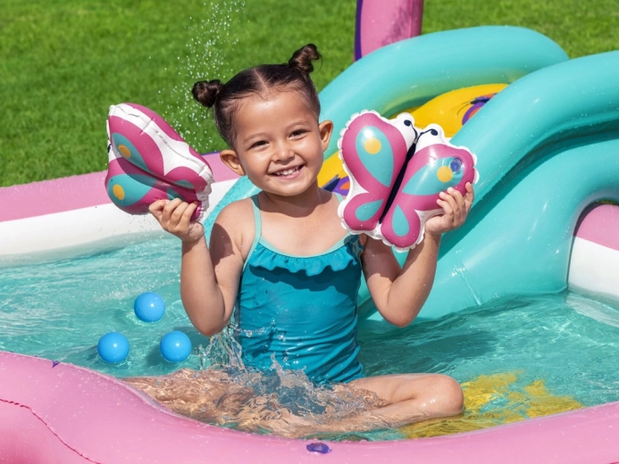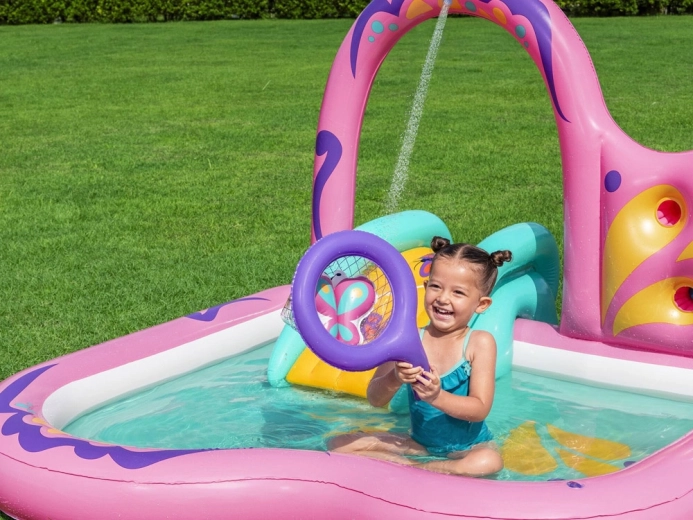 Das aufblasbare Wasser-Spielcenter Bestway Schmetterling verwandelt den Garten in einen sicheren Ort voller Freude. Dank der kompakten Maße 180 × 180 × 117 cm passt es auch in kleinere Bereiche und bietet dennoch viele Aktivitäten: Rutschen in die flache Planschzone, einen Sprüher im Bogen mit Anschluss an den Gartenschlauch und Öffnungen zum Werfen und Sortieren von Bällen, die die Feinmotorik fördern.