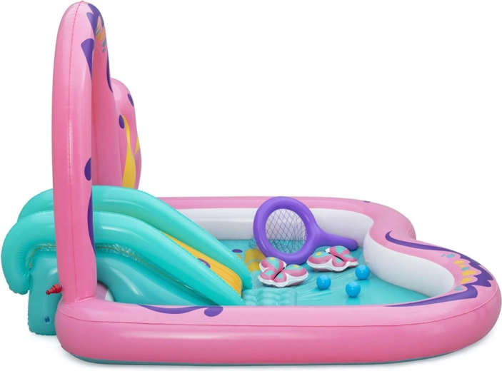Dazu kommen lustige schwimmende Spielzeuge und aufblasbare Elemente in Schmetterlings- und Ringform. Weiche Wände und gepolsterte Landungen erhöhen Komfort und Sicherheit. Das strapazierfähige Vinyl ist leicht zu reinigen, und das beiliegende Reparaturflicken verlängert die Lebensdauer. Einfach Schlauch anschließen, aufpumpen – und der Spaß kann beginnen.