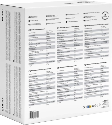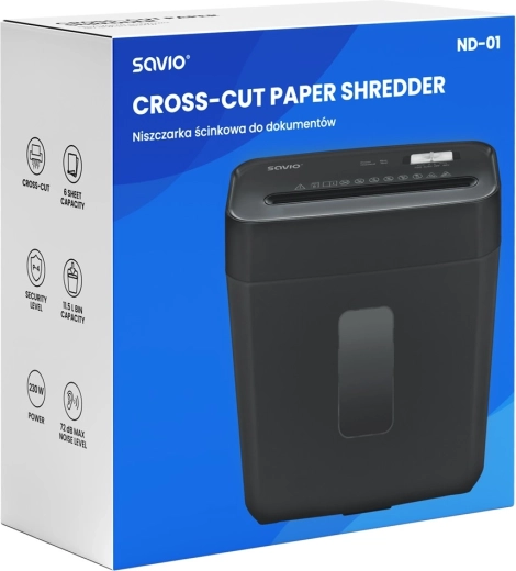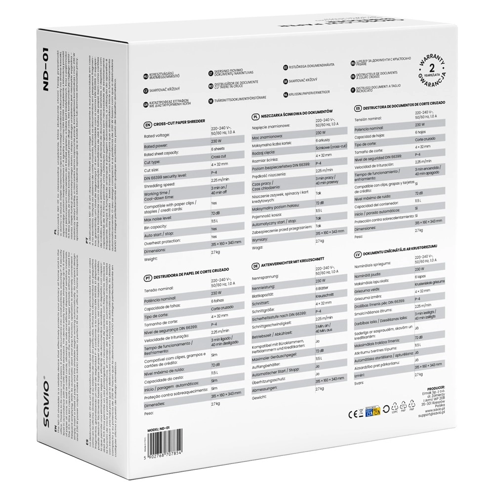 Der ND-01 Schredder ist eine zuverlässige Lösung für den täglichen Schutz sensibler Daten. Dank Kreuzschnitt 4 × 32 mm und DIN 66399, Stufe P-4 werden private und geschäftliche Dokumente sicher vernichtet. Die kompakten Abmessungen passen leicht unter den Schreibtisch, und das Sichtfenster am Behälter hilft, die Füllung im Blick zu behalten.