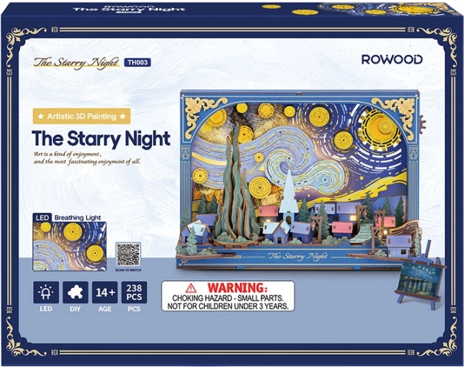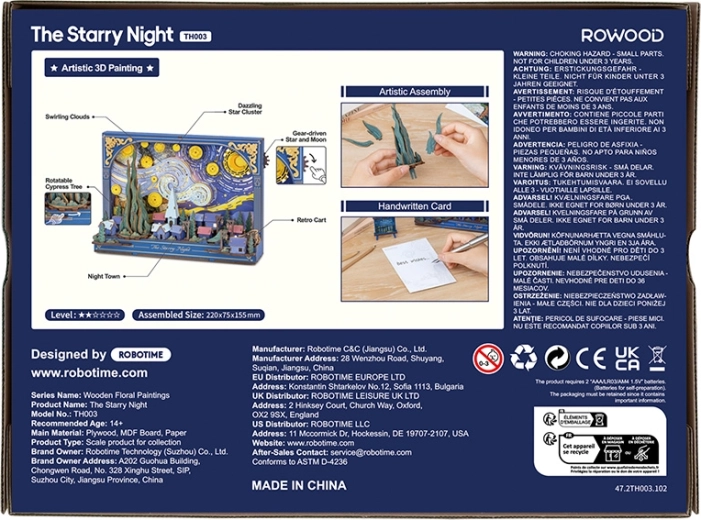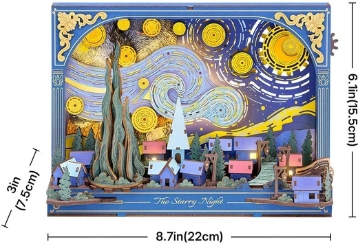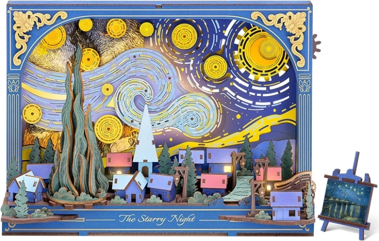 Dieses detailreich ausgearbeitete 3D-Holzpuzzle bringt die Atmosphäre einer ruhigen Nacht mit einer dynamischen, geschichteten Darstellung von Dorf und Himmel in Ihr Zuhause. Nach dem Zusammenbau setzen sich die von Zahnrädern angetriebenen mechanischen Elemente in Bewegung und verleihen der Szene Tiefe und einen Hauch Magie. Durch die sanfte LED-Beleuchtung im Hintergrund wird das Puzzle zu einer eindrucksvollen Dekoration und gemütlichen Nachtlampe.
