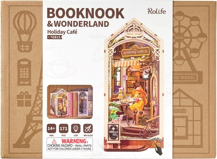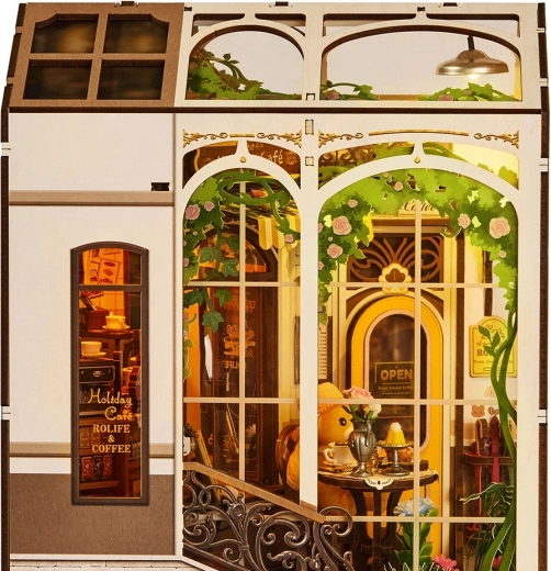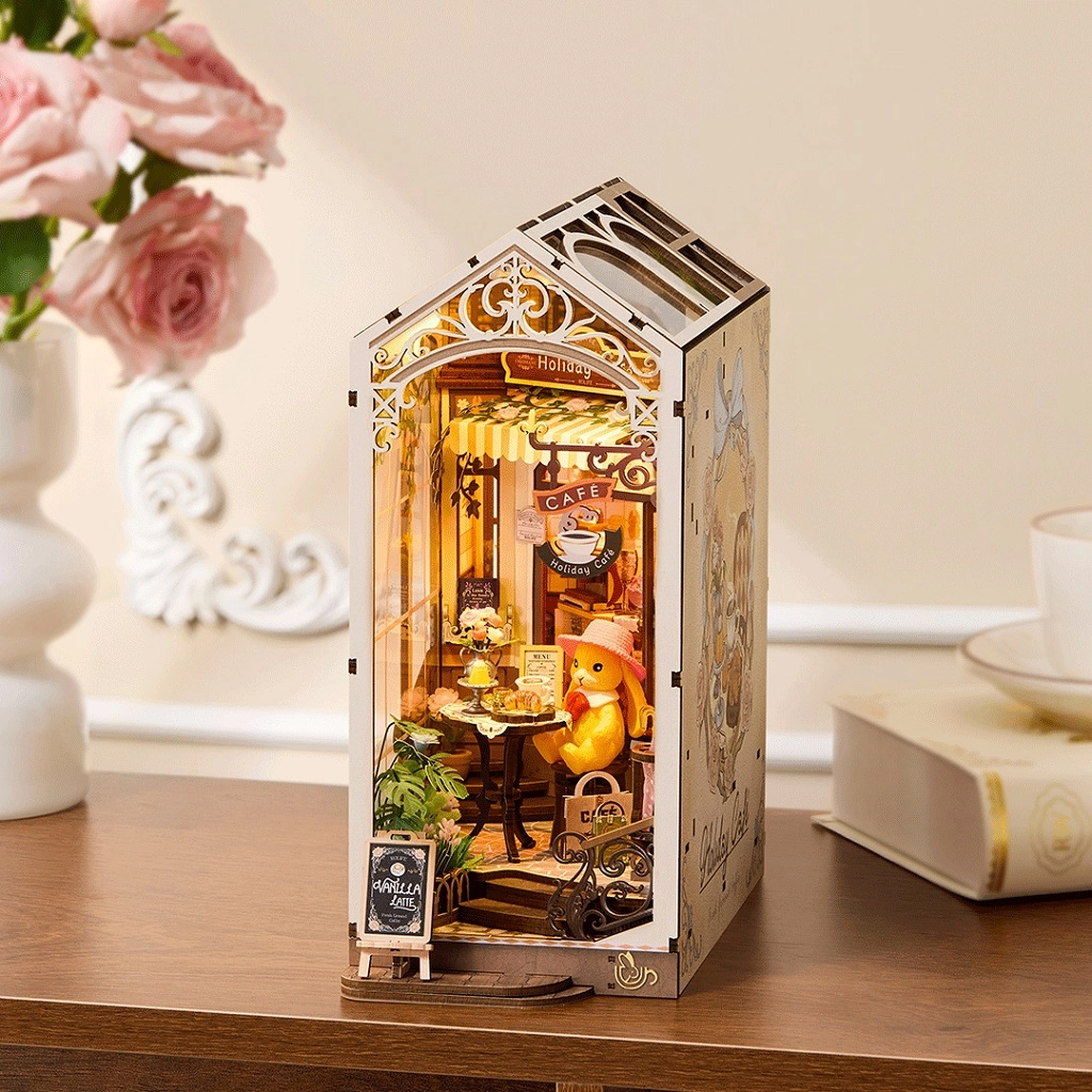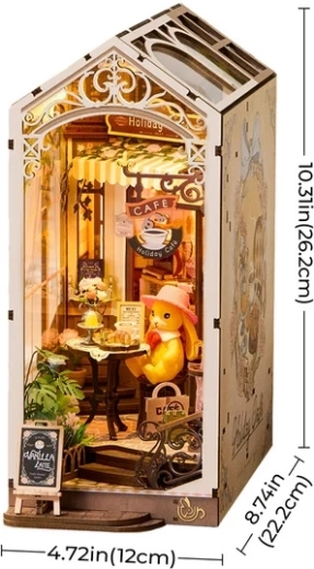 Diese detailreich gestaltete Miniatur bringt die Atmosphäre eines gemütlichen Feriencafés direkt in Ihr Bücherregal. Die offene Konstruktion mit breiten Seitenfenstern, realistischen Accessoires und warmer LED-Hintergrundbeleuchtung verwandelt Ihr Regal in eine kleine Welt voller Ruhe und Nostalgie. Das Modell eignet sich zugleich hervorragend als stabile Buchstütze und stilvolle Deko für Tisch oder Regal.