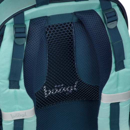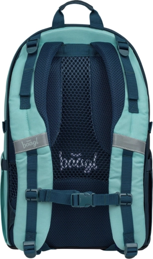 BAAGL Skate Petrol GRS vereint modernes Design, Ergonomie und nachhaltige Herstellung. Anatomisch geformter Rücken mit Lendenstütze und atmungsaktiver Polsterung sorgen für ganztägigen Komfort. Dank vollständig verstellbarer Kompressionsriemen passt sich der Rucksack optimal an die Statur an und hält die Last stabil.