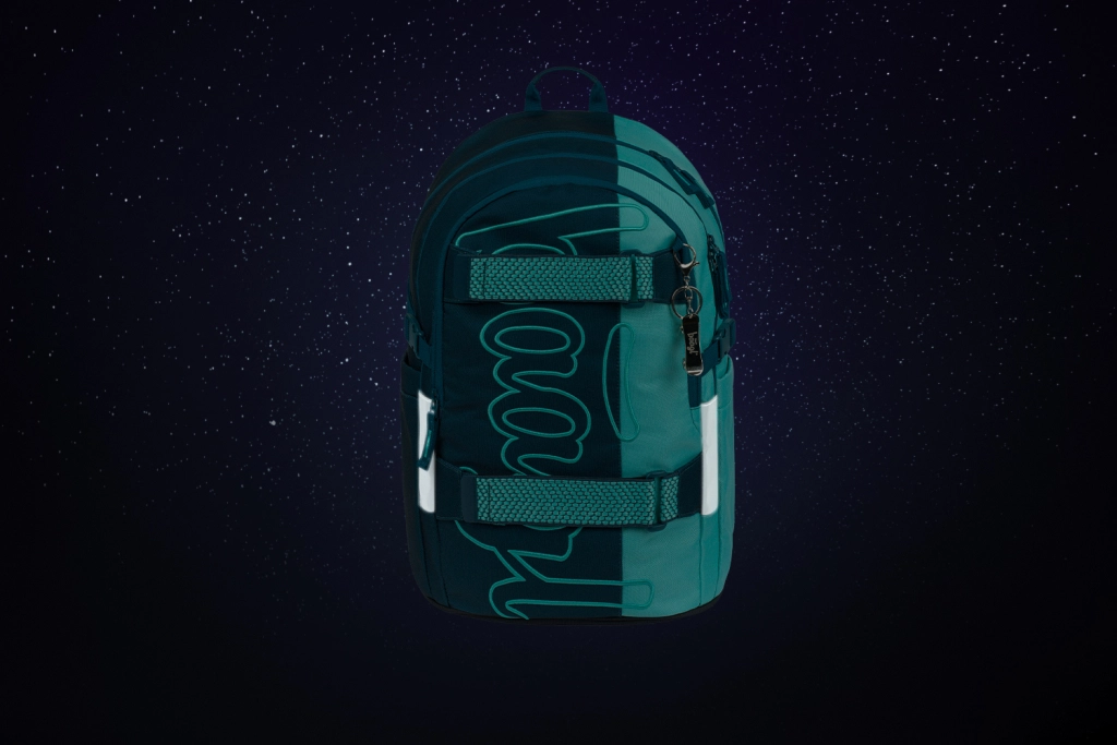 Wasserabweisendes, recyceltes Material mit GRS-Zertifikat, reflektierende Elemente für bessere Sichtbarkeit und erstklassige YKK-Reißverschlüsse für lange Lebensdauer. Vordere Riemen fixieren das Skateboard zuverlässig.