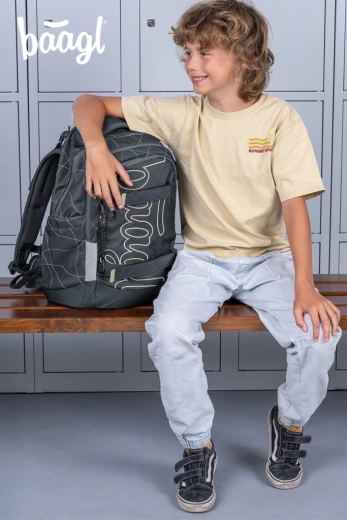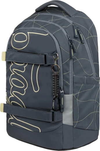 Im Inneren bietet ein Drei-Fächer-Organizer eine samtige Laptop-Tasche, die Elektronik vor Kratzern schützt. Stabile Seitentaschen fassen BAAGL-Trinkflaschen aus Tritan, die vordere Kompression fixiert einen Hoodie oder ein Skateboard und der stylische Anhänger verleiht dem Rucksack eine individuelle Note.