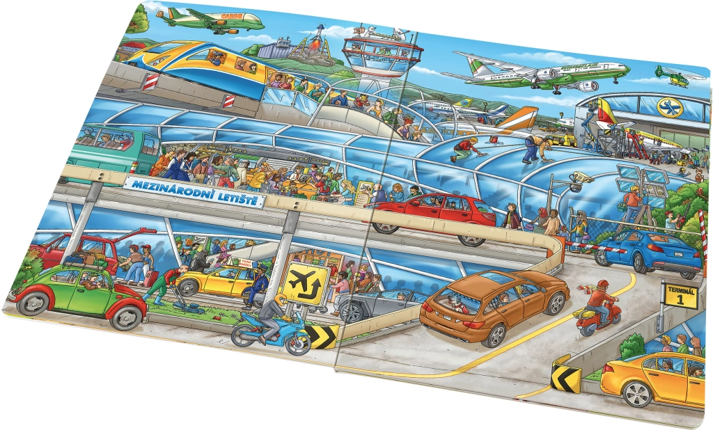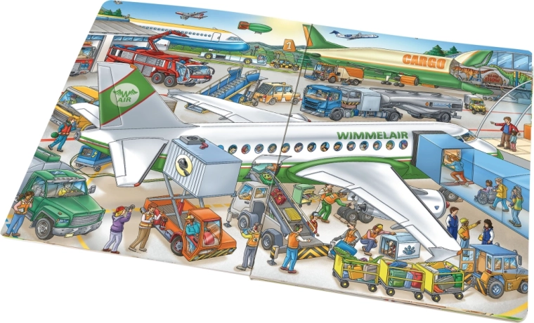 Dieses große Wimmelbuch führt Kinder durch die geschäftige Umgebung eines Flughafens – von der Ankunft am Terminal bis zur Landung am Meer. Auf jeder Seite finden sich zahlreiche detailreiche Illustrationen und Geschichten, dank derer Kinder verstehen, was am Flughafen passiert – von der Gepäckaufgabe bis zum Start in die Wolken.