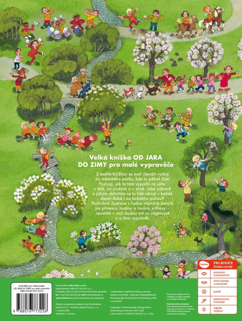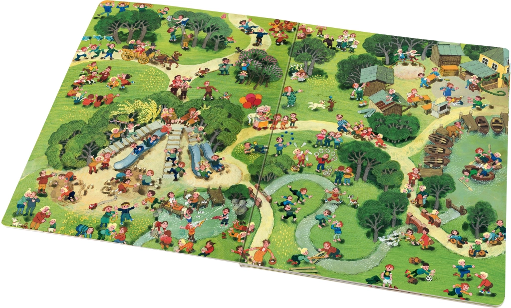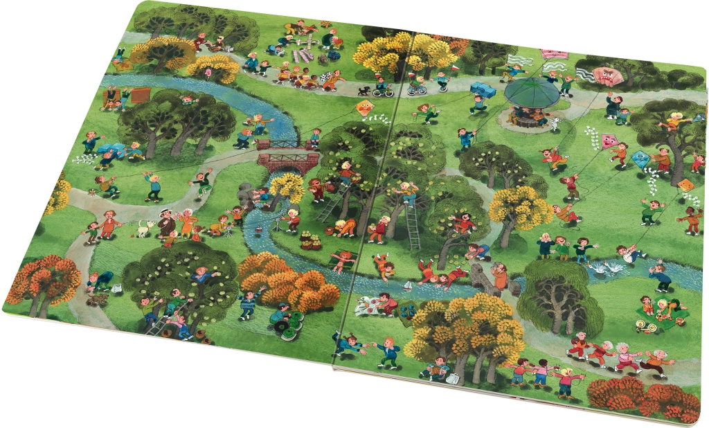 Dieses großformatige Wimmelbuch führt Kinder durch einen lebhaften Stadtpark im Wandel der vier Jahreszeiten – Frühling, Sommer, Herbst und Winter. Jede Seite ist voller kleiner Geschichten, Aktivitäten und Figuren, die sich je nach Tageszeit und Wetter verändern. Dank der reichen Illustrationen entdecken Kinder stets neue Zusammenhänge und schulen ihre Beobachtungsgabe.