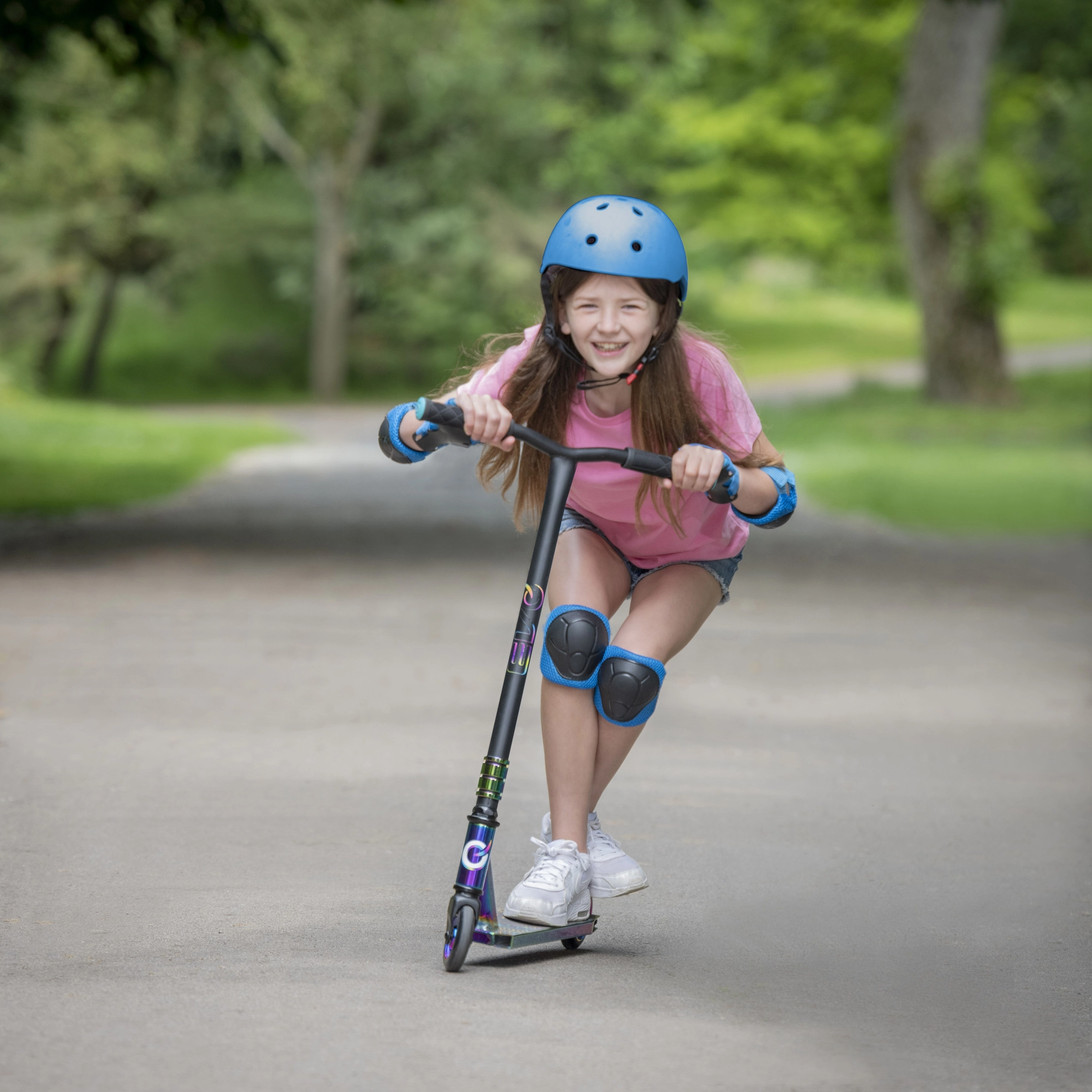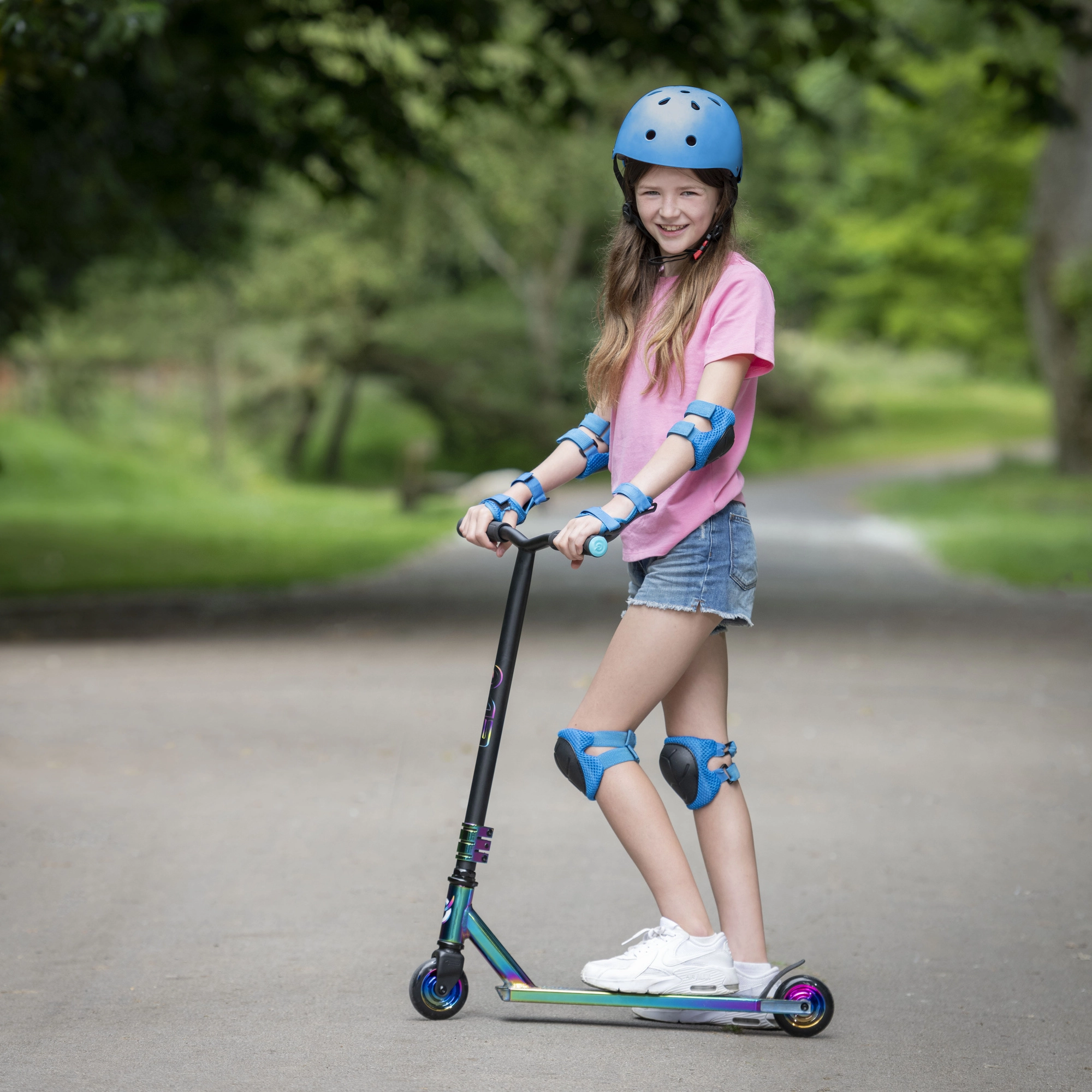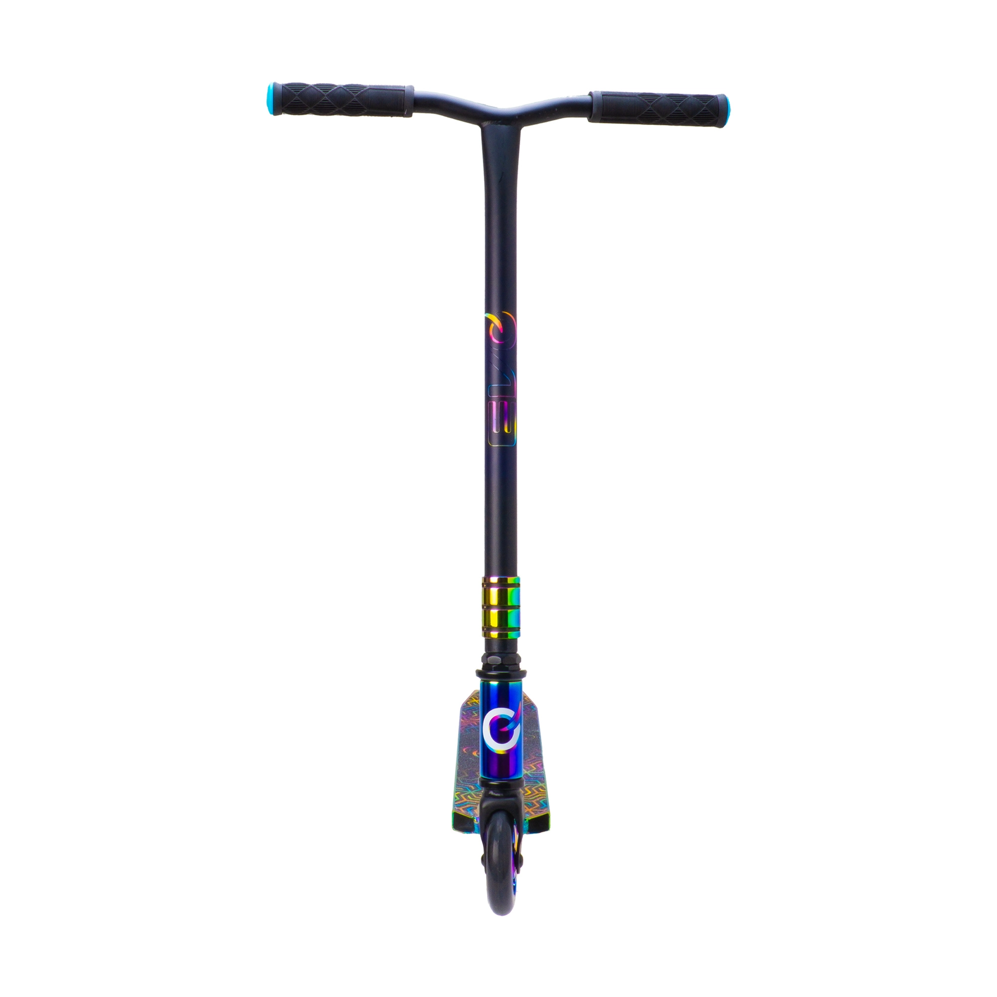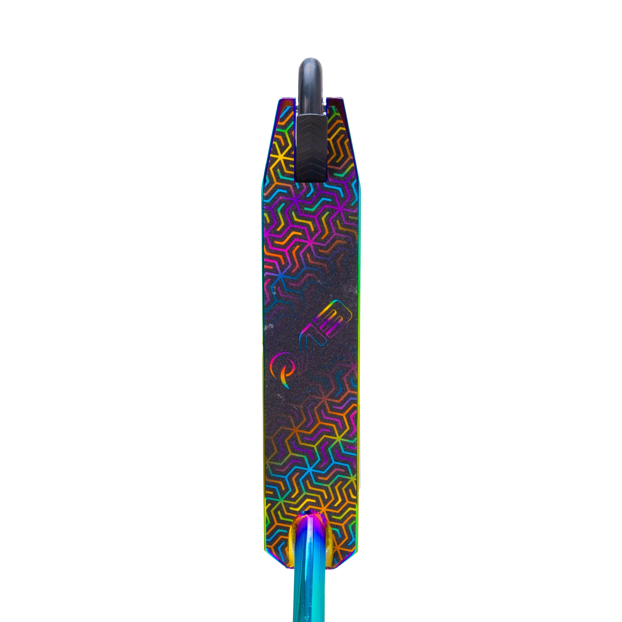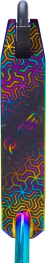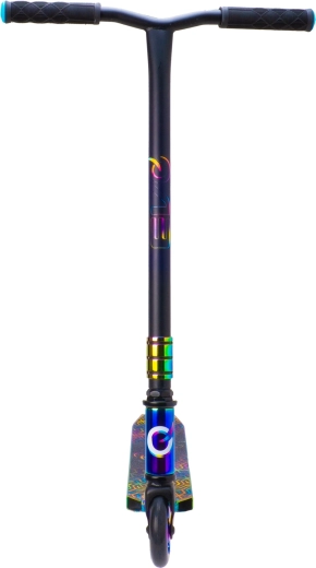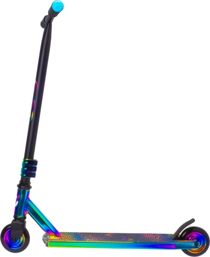 Schillernde (regenbogenfarbene) Ausführung von Deck, Gabel und Klemme verleiht dem Scooter einen unverwechselbaren Look und motiviert zum Fahren.