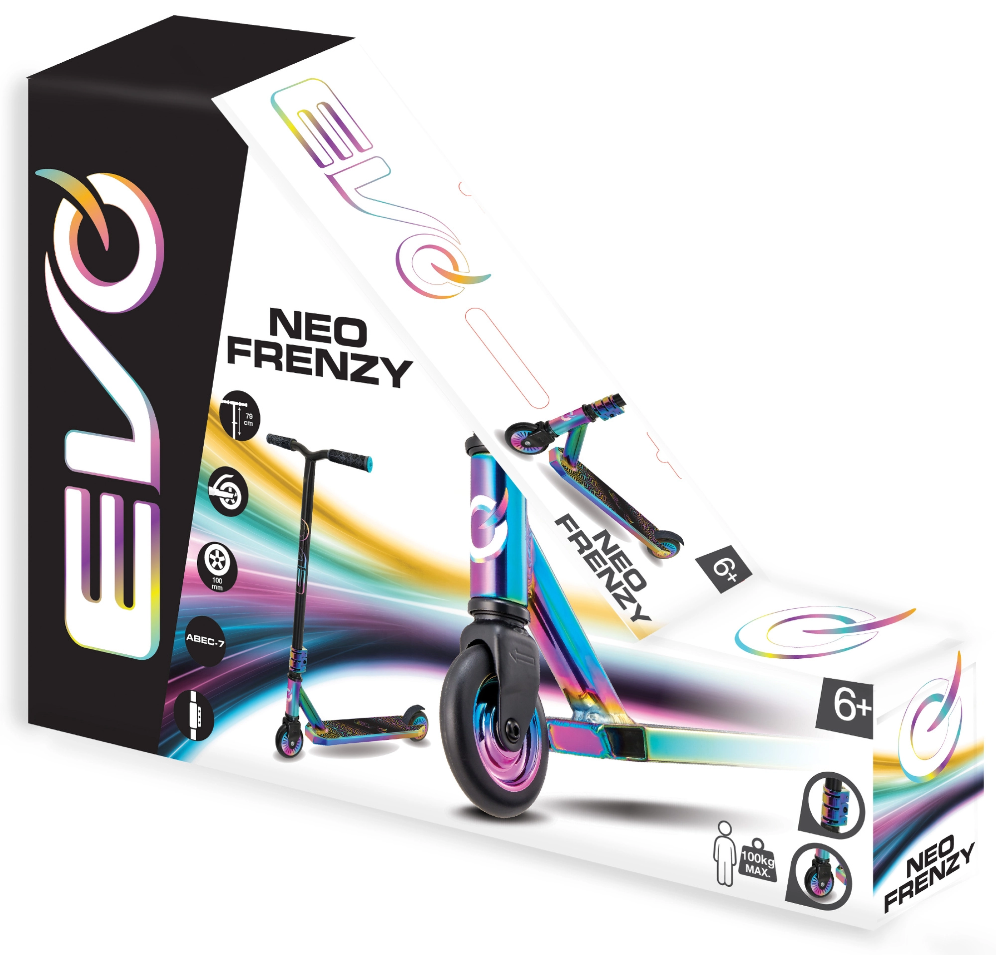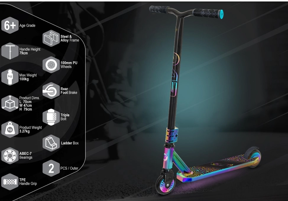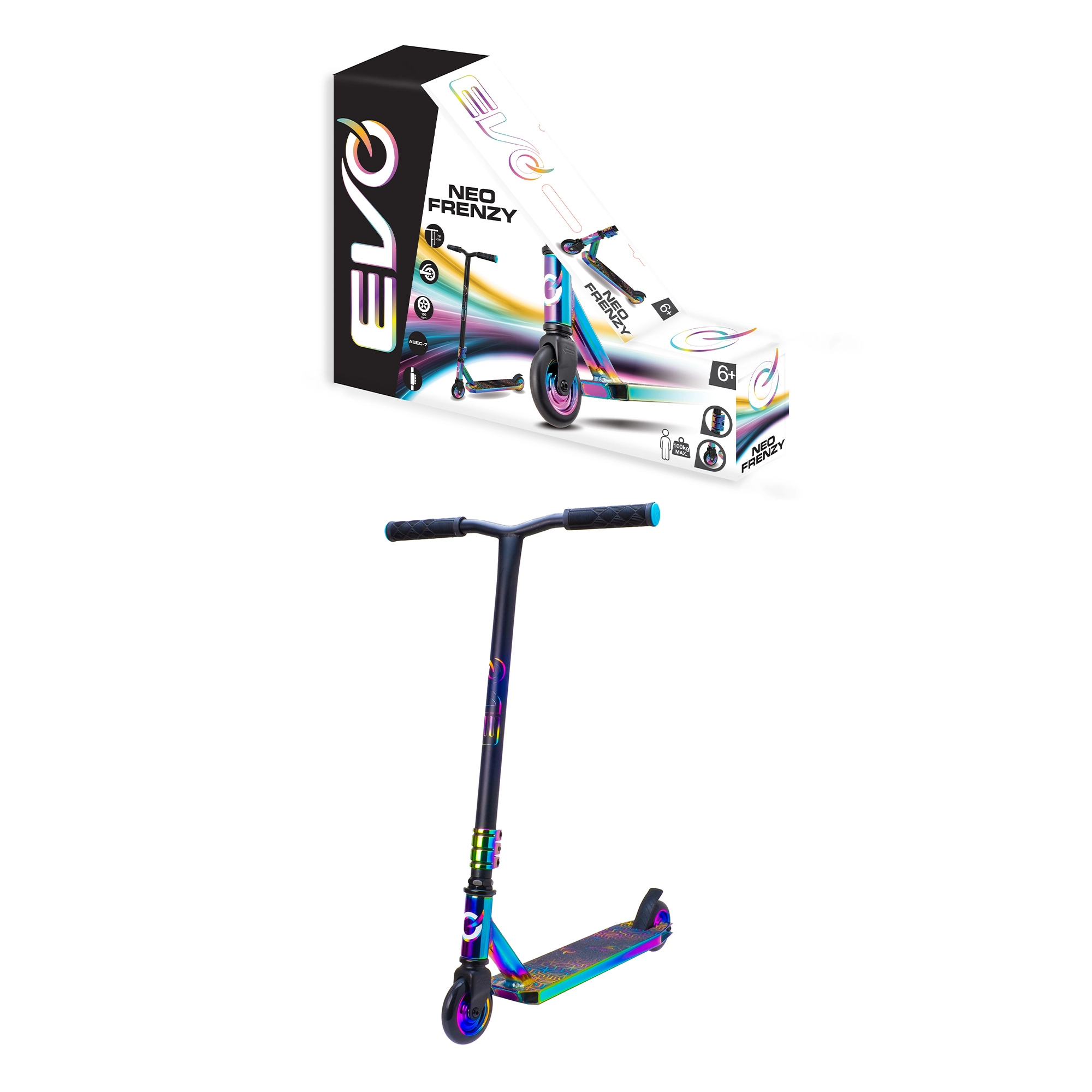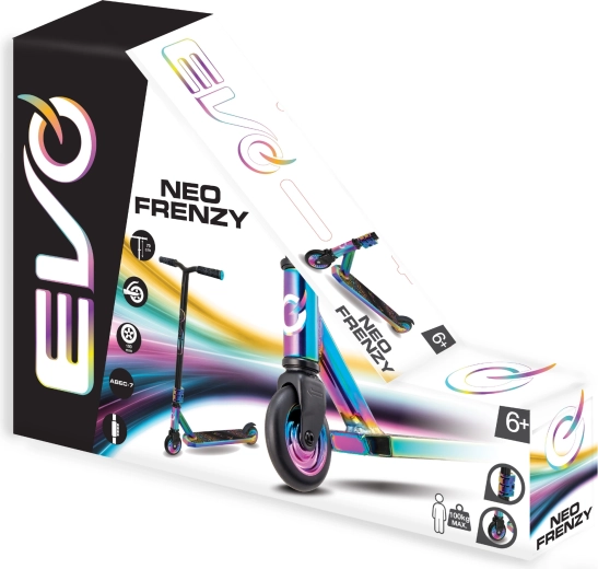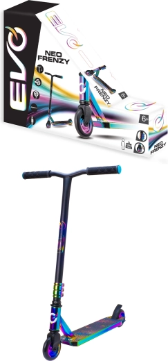 Der EVO Neo Frenzy ist ein Kinder-Stuntscooter, entwickelt zum Erlernen des Gleichgewichts und der ersten Tricks. Das stabile Metall-Deck mit rutschfester Griptape und die robuste Gabel sorgen für Stabilität, während die kleinen harten Rollen mit ABEC-7-Lagern für schnelle Beschleunigung und eine geschmeidige Fahrt sorgen. Markante Neo-Chrome-Details ziehen die Blicke auf sich und geben dem Scooter einen einzigartigen Stil.
