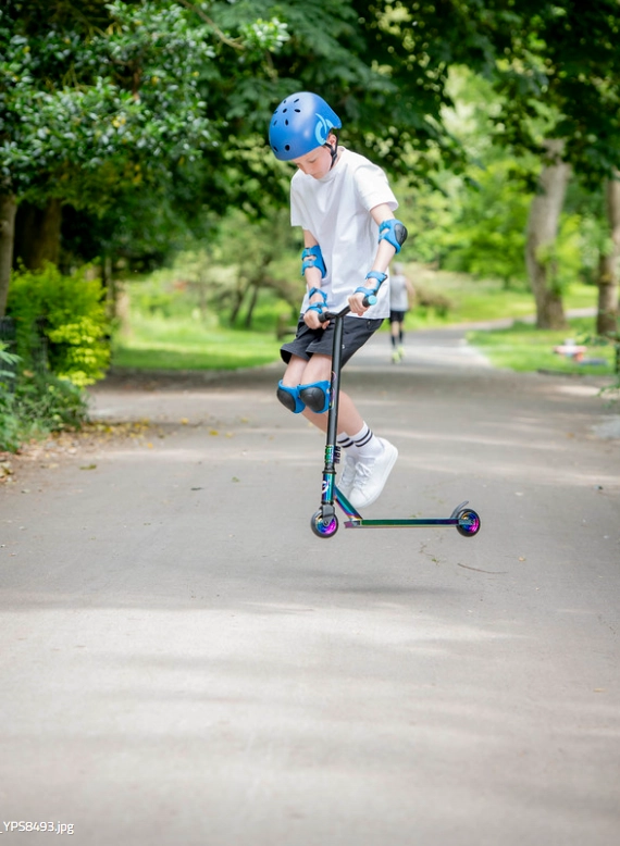 Der fixe T-Bar-Lenker in einer Höhe von ca. 79 cm bietet präzise Kontrolle, die dreifache Klemme erhöht die Steifigkeit des Setups und die hintere Schutzblech-/Bremseinheit ermöglicht ein sicheres und intuitives Anhalten. Der Scooter ist ideal für Einsteiger, die bereits erste Erfahrungen haben und ihre Fähigkeiten im Skatepark sowie auf ebenen städtischen Oberflächen ausbauen möchten.