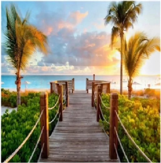 Beruhigendes Kreativprojekt und eindrucksvolles Ergebnis in einem. Diamantmalerei besteht darin, kleine Steinchen mithilfe von Stift und Wachs auf markierte Stellen der Leinwand zu kleben. Der Ablauf ist intuitiv und sowohl für Anfänger als auch für Kinder unter Aufsicht von Erwachsenen geeignet. Das fertige Bild mit dem exotischen Motiv einer Brücke und Palmen wird zu einer wunderschönen Dekoration für Ihr Zuhause.