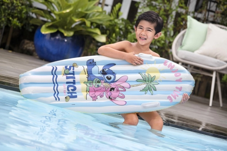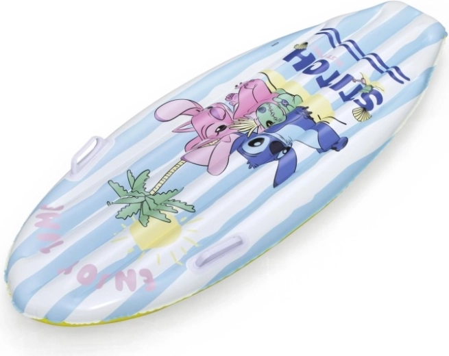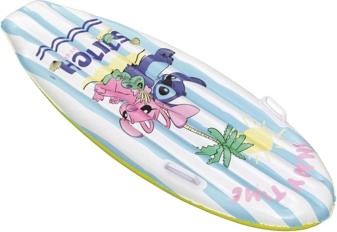 Das aufblasbare Surf-Board mit DISNEY Stitch begeistert Kinder mit fröhlicher Grafik mit Palmen, Sonne und Muscheln. Blau-weiße Streifen auf der Oberseite und ein gelber Boden erhöhen die Sichtbarkeit auf dem Wasser, während das geringe Gewicht das Tragen und Handling erleichtert.
