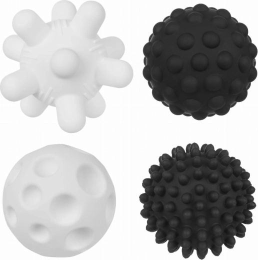 Das Set sensorischer Bälle mit einem Durchmesser von ca. 6,5 cm motiviert Kinder zum Greifen, Drücken und Erforschen verschiedener Texturen. Das kontrastreiche schwarz‑weiße Design zieht die Aufmerksamkeit von Babys natürlich an und unterstützt die Entwicklung des Sehvermögens sowie die Hand‑Augen‑Koordination.