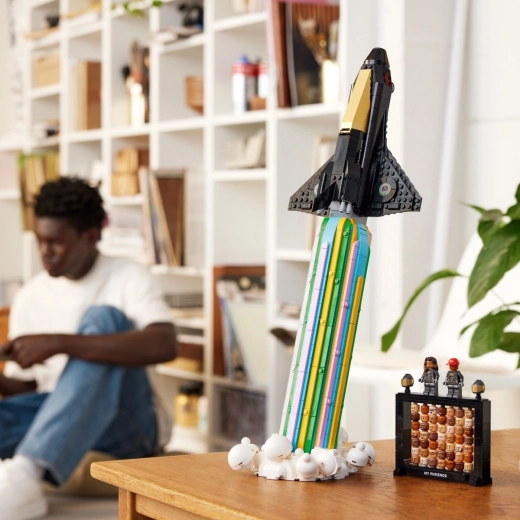 Bauen Sie ein beeindruckendes Space Shuttle auf dem Weg zu den Sternen und bringen Sie eine Portion Inspiration und Freude in Ihr Zuhause. Dieses Sammlermodell LEGO Icons fängt den Startmoment auf einer farbenfrohen Wolke aus Flammen und Rauch ein, ergänzt durch exklusive Minifiguren von PHARRELL und HELEN WILLIAMS.