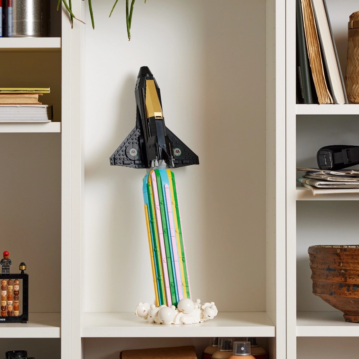 Raffinierte Details erfreuen jeden Baumeister: öffnendes Cockpit, abnehmbares Fahrwerk sowie zwei Raumfahrt-Helme mit goldenen Visieren. Das Shuttle lässt sich dank des soliden Sockels mit Triebwerksschubeffekt mühelos in einer dynamischen „Launch“-Pose ausstellen – die perfekte Dekoration für Regal oder Tisch.