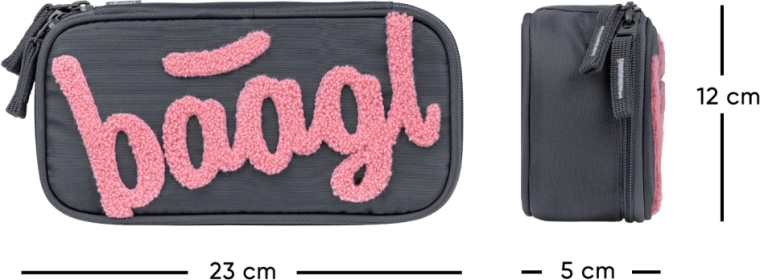 Praktisches BAAGL-Etui in elegantem Dunkelgrau mit rosa Logo, das modernes Design und clevere Aufteilung kombiniert. Die Hauptkammer bietet ausreichend Platz für Schreibutensilien und Kleinigkeiten, während die doppelte Klappflappe mit elastischen Schlaufen alles übersichtlich an Ort und Stelle hält. Ein Innenfach und ein transparentes Fenster für den Stundenplan erleichtern die schnelle Orientierung im Schulalltag.