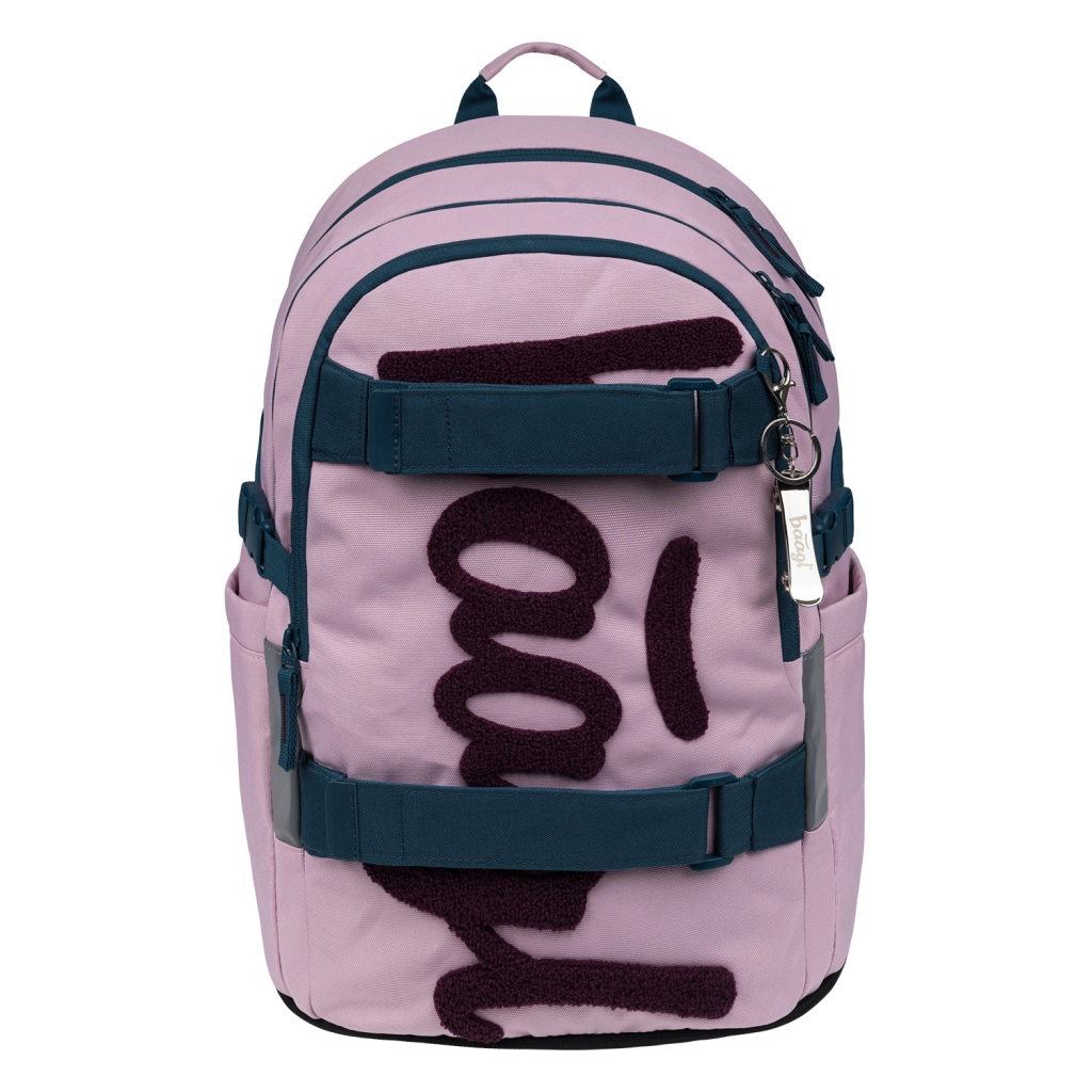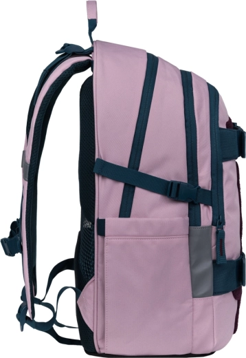 Das Set Skate Rose ist für angenehmes Tragen und clevere Organisation von Schul- und Freizeitbedarf konzipiert. Der bis zu 900 g leichte Rucksack hat anatomisch geformte Rückenpartie, Lendenstütze, drei Fächer mit Organizer und ein gepolstertes Fach für 15"-Laptops. Seitentaschen für Flaschen, Kompressionsriemen sowie Riemen zur Befestigung eines Skateboards sind ebenfalls vorhanden. Das recycelte, wasserabweisende Material wird durch reflektierende Elemente und zuverlässige YKK-Reißverschlüsse ergänzt.
