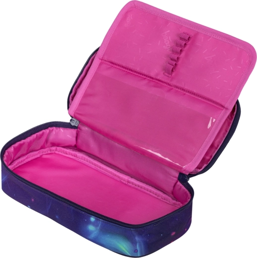 Geräumiges Federmäppchen mit aufklappbaren Flügeln, Kordelzug-Turnbeutel für Sport, praktische Gürteltasche und Textilhülle – alles im gleichen NOVA-„Galaxy“-Stil.