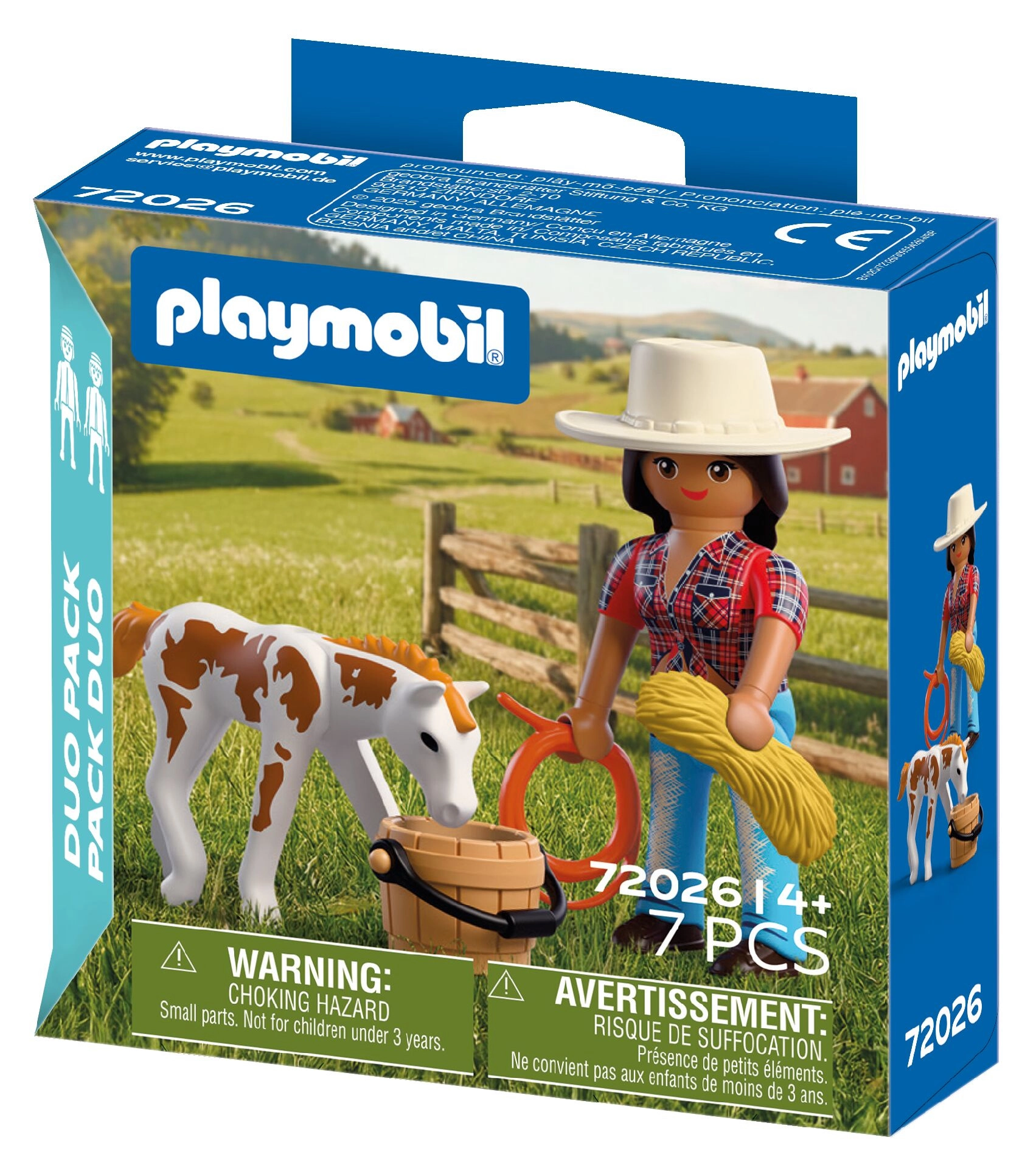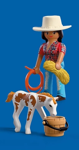 Im Lieferumfang enthalten sind eine Reiterinnen-Figur (ca. 7,5 cm), ein Fohlen, ein Lasso, ein Cowboyhut, ein Wassereimer und ein Heuballen. Das Set lässt sich mit weiteren PLAYMOBIL-Sets kombinieren, was die Spielmöglichkeiten erweitert und für langanhaltenden Spielspaß sorgt.