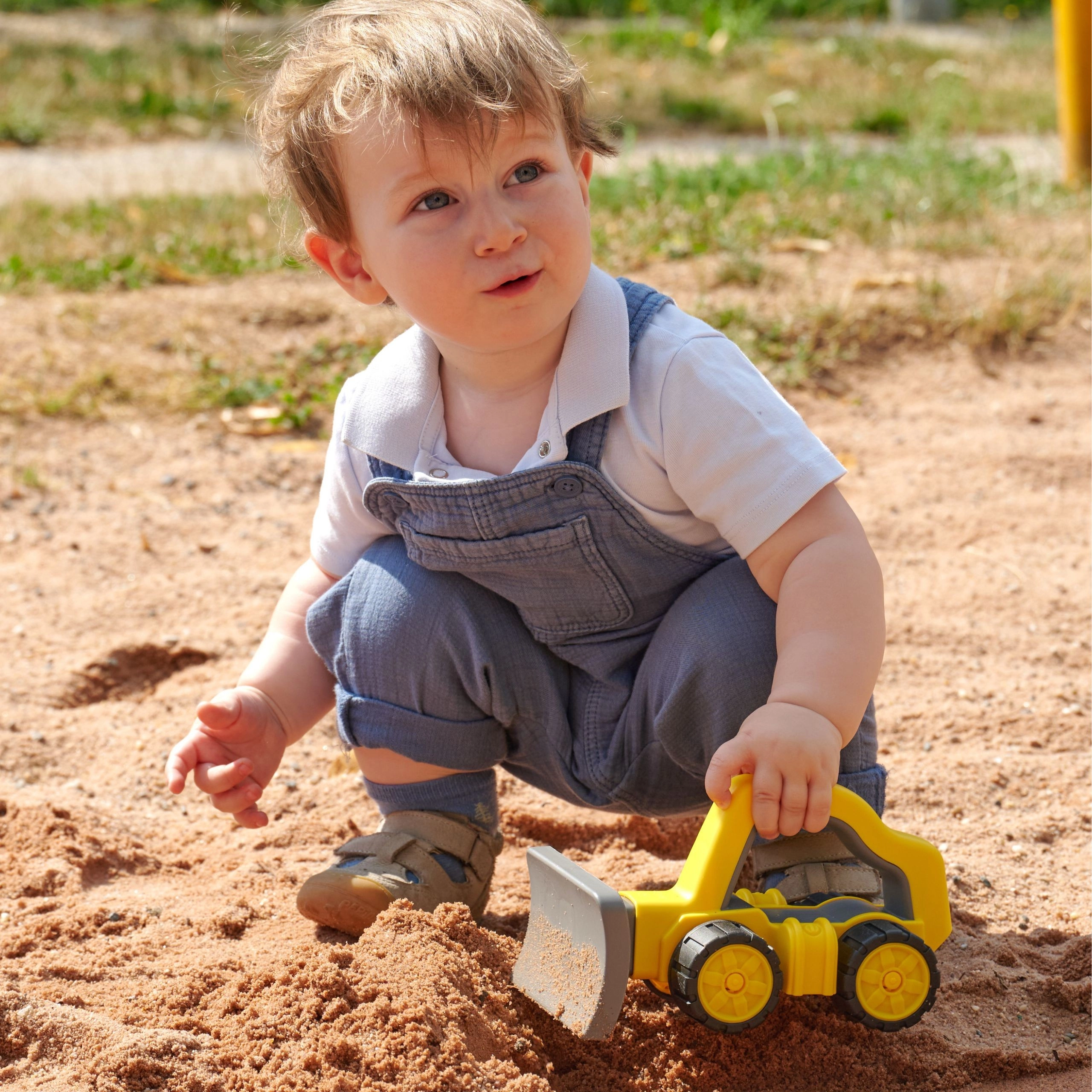 Die stabile Konstruktion und die vordere Schaufel laden zum Schieben von Sand und Erde ein und fördern Motorik, Koordination und Vorstellungskraft.