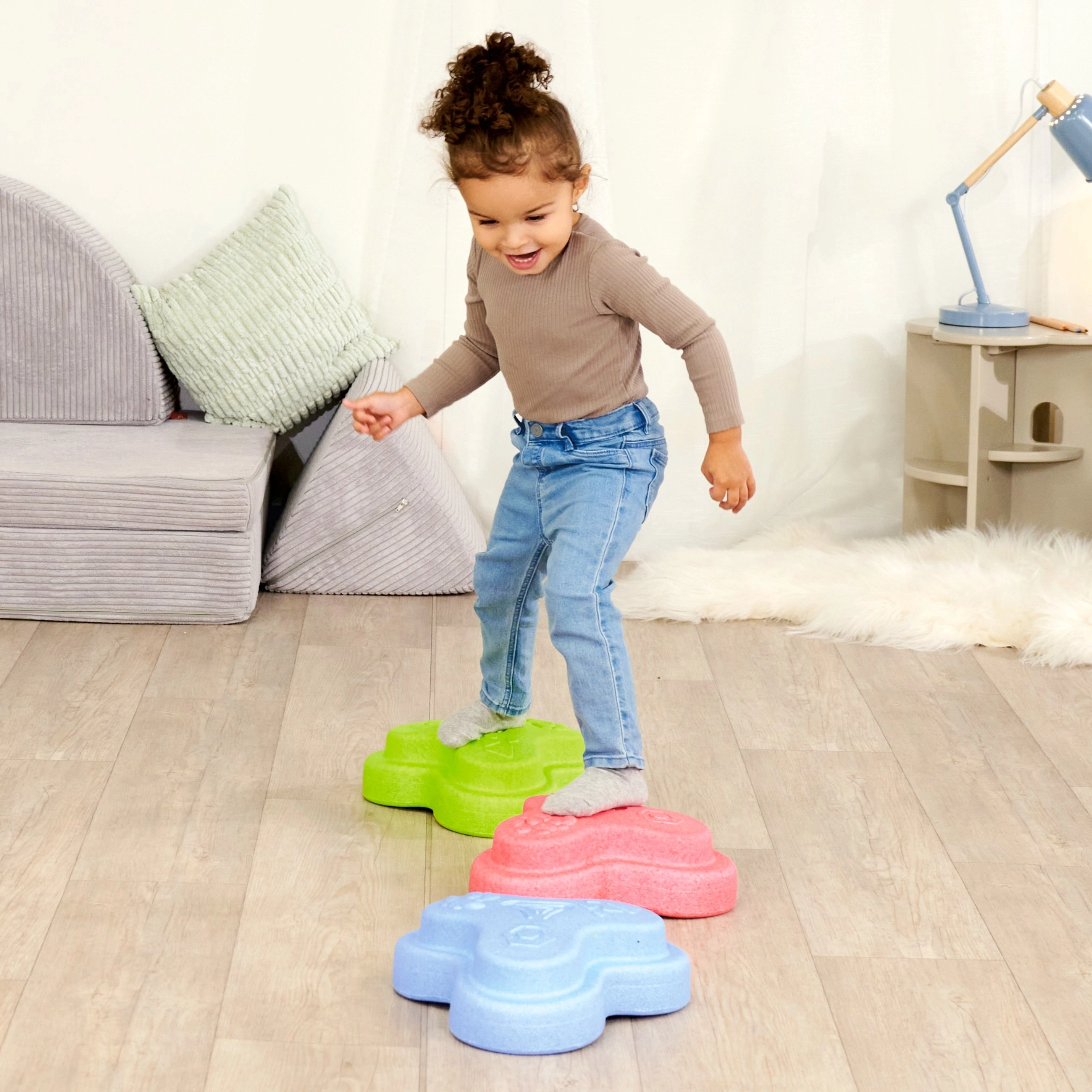 Jeder Stein wiegt etwa 120 g und trägt dennoch bis zu 120 kg. Die perfekte Kombination für sicheres Hüpfen, Balancieren und Bauen.