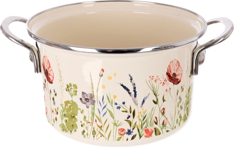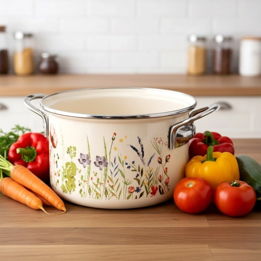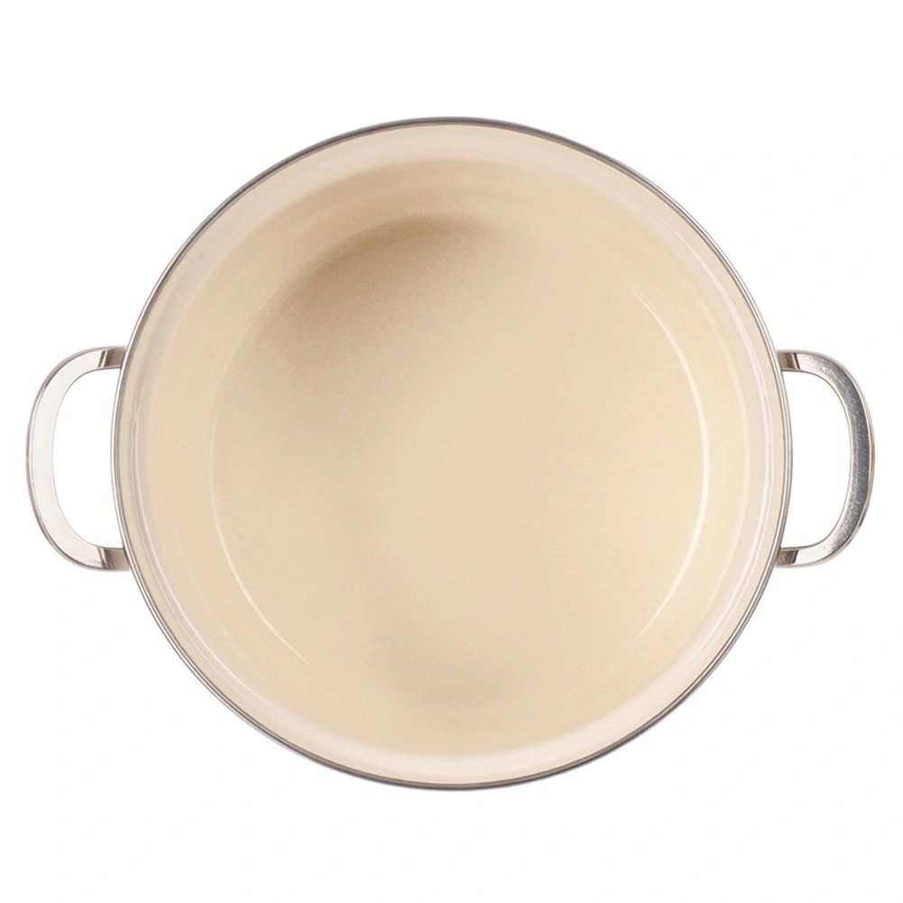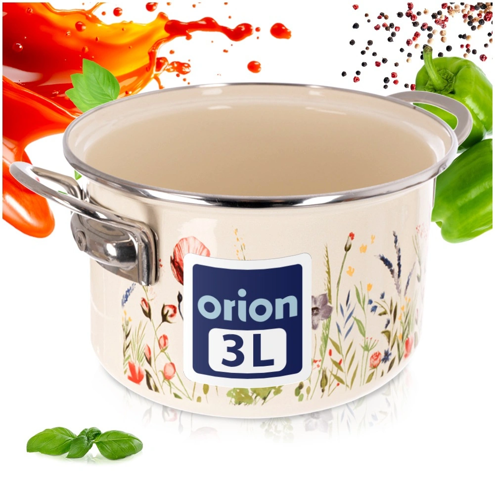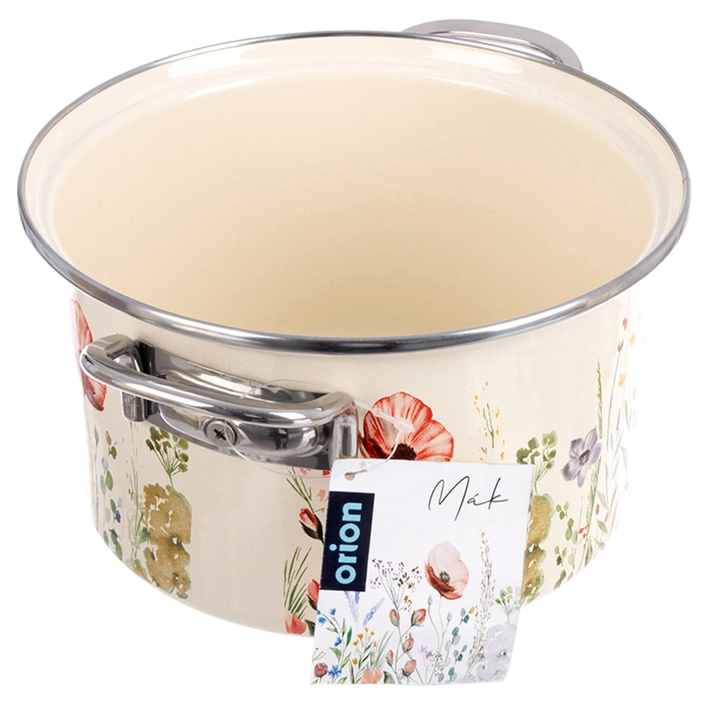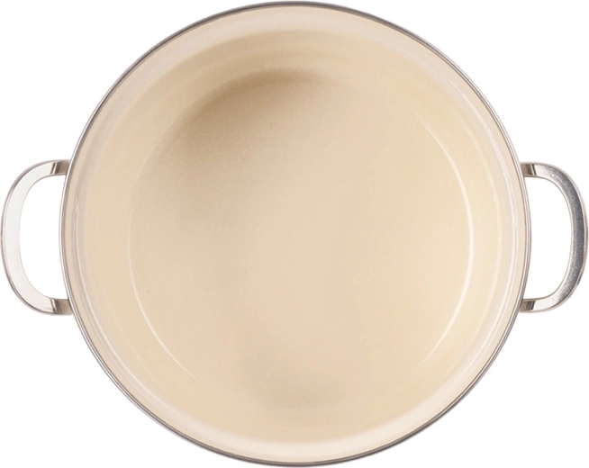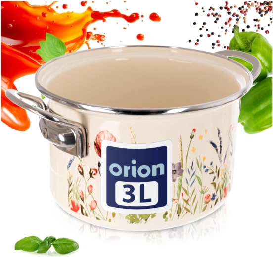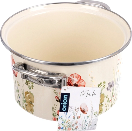 Der cremefarbene Emaille-Topf ORION Maki mit 20 cm Durchmesser und 3 l Volumen verbindet zeitloses Design mit Alltagstauglichkeit. Die hochwertige Emaille auf Stahl ist hygienisch, strapazierfähig und lebensmittelschonend; der Edelstahlrand und die Metallgriffe sorgen für Langlebigkeit und eine sichere Handhabung.