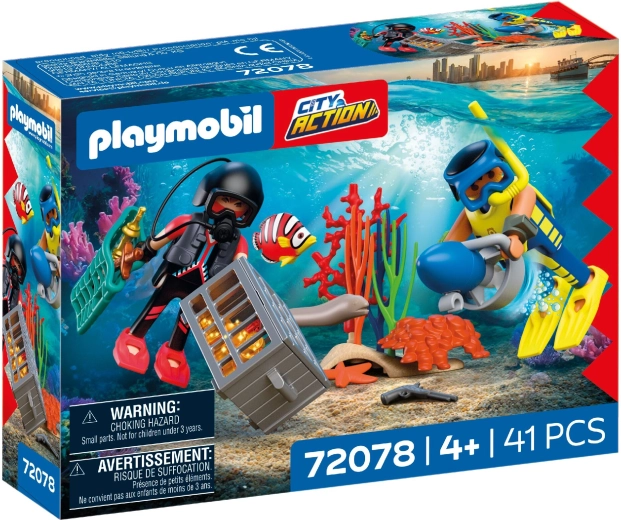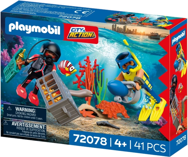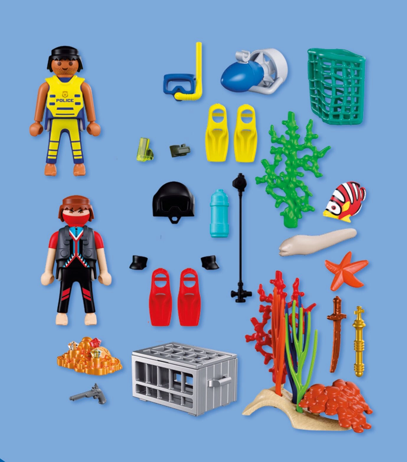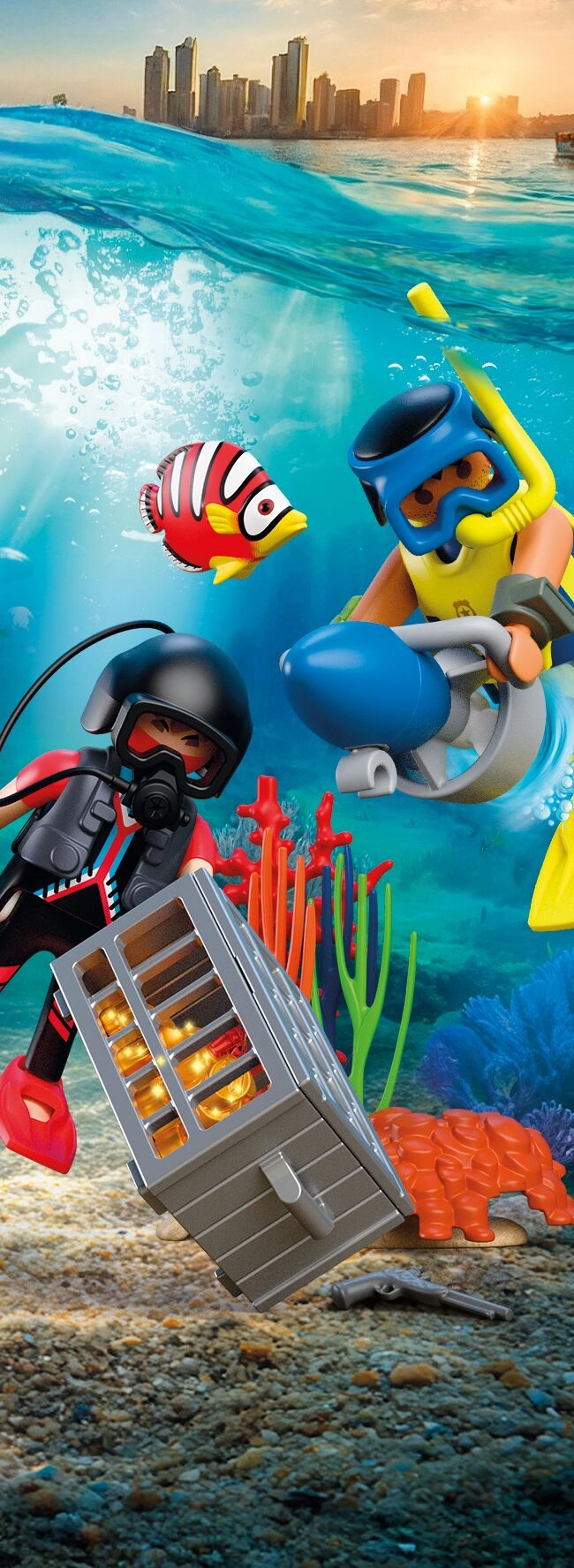 Dieses Set bietet eine actiongeladene Verfolgungsjagd in den Tiefen des Meeres: Ein wachsamer Polizeitaucher verfolgt einen Dieb, der versucht, die Schatzkiste zwischen Algen und Korallen zu verstecken. Dank Unterwasserscooter, Ausrüstung und realistischen Accessoires warten viele spannende Missionen und freies Erkunden der Unterwasserwelt auf die Kinder.