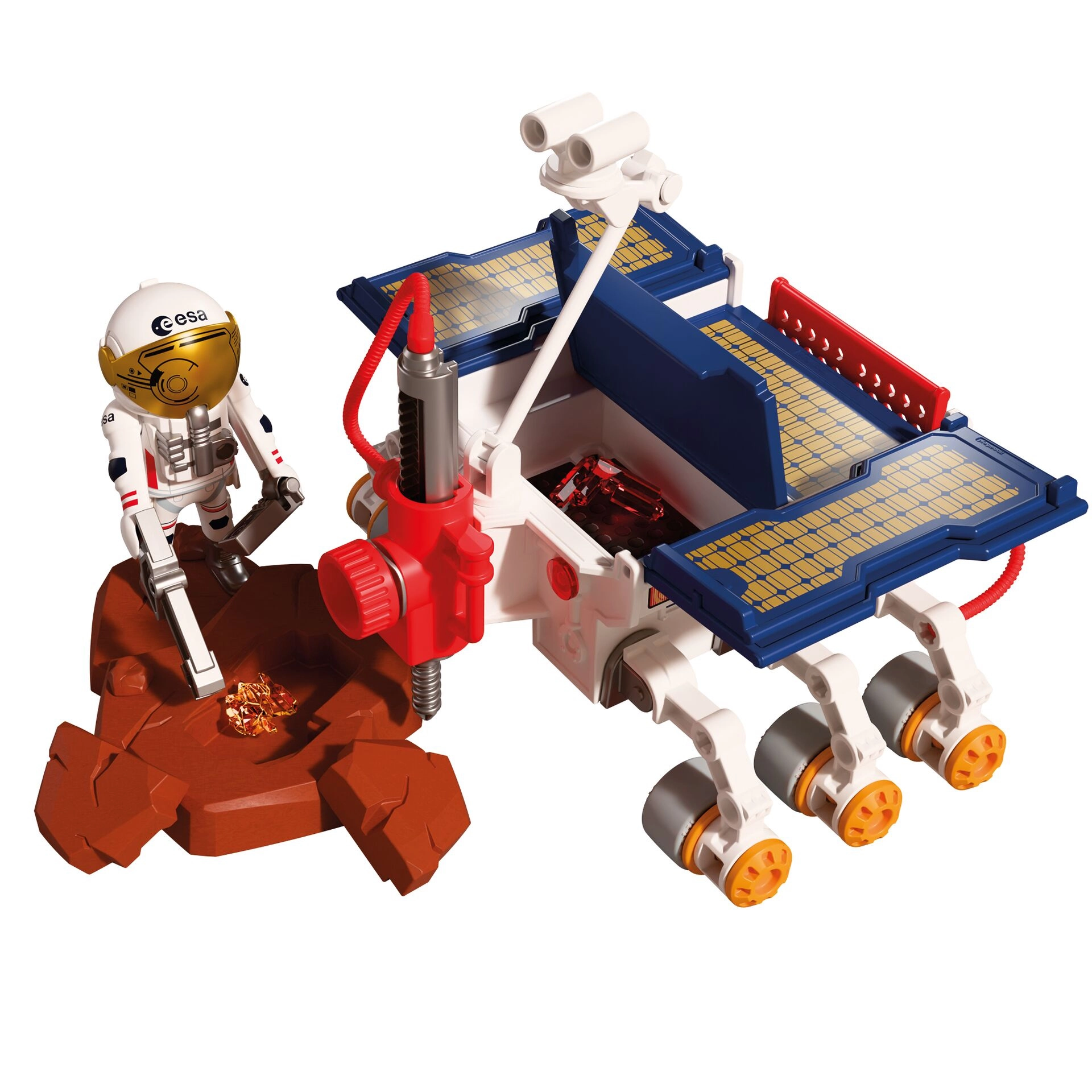 Ein sechsrädriger Rover mit drehbarem Bohrarm und Stauraum für Proben sorgt für ein authentisches Erlebnis bei der Planetenforschung. Ideal für thematisches Spiel und wissenschaftliche Missionen.
