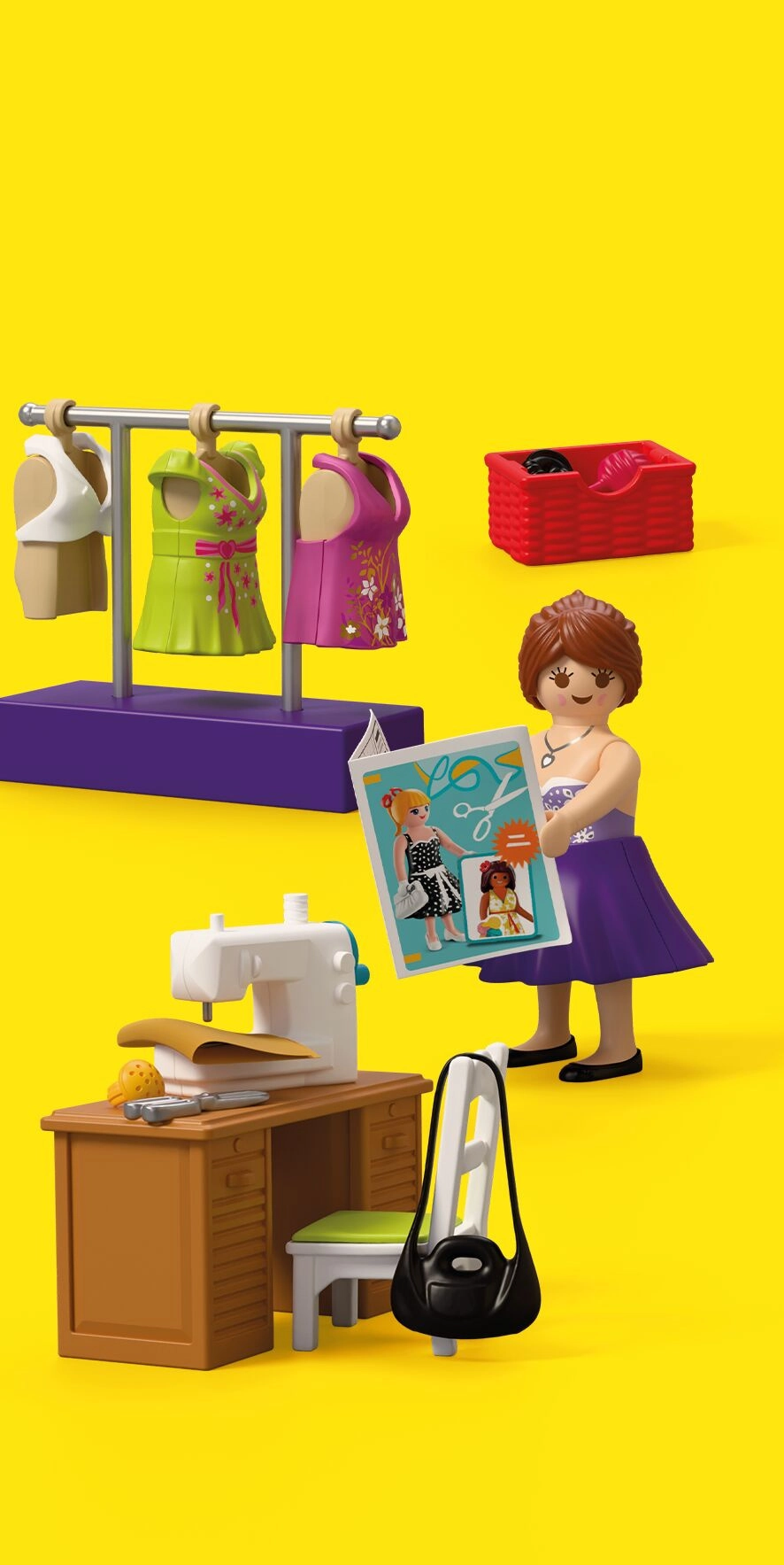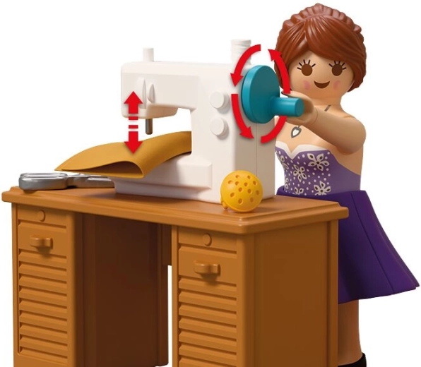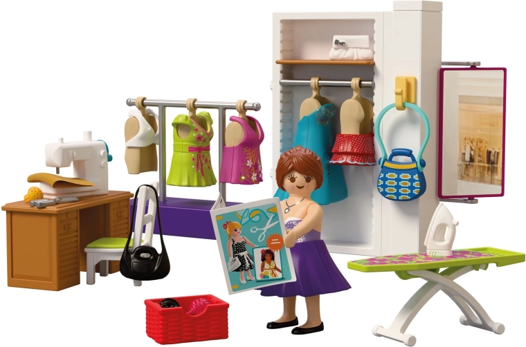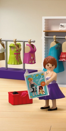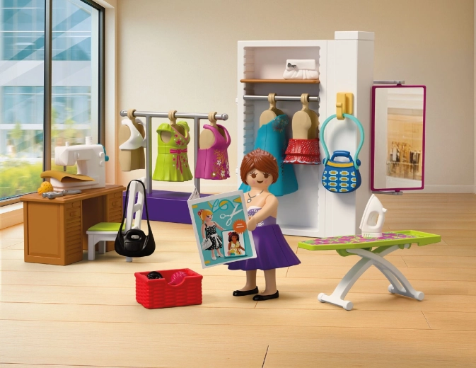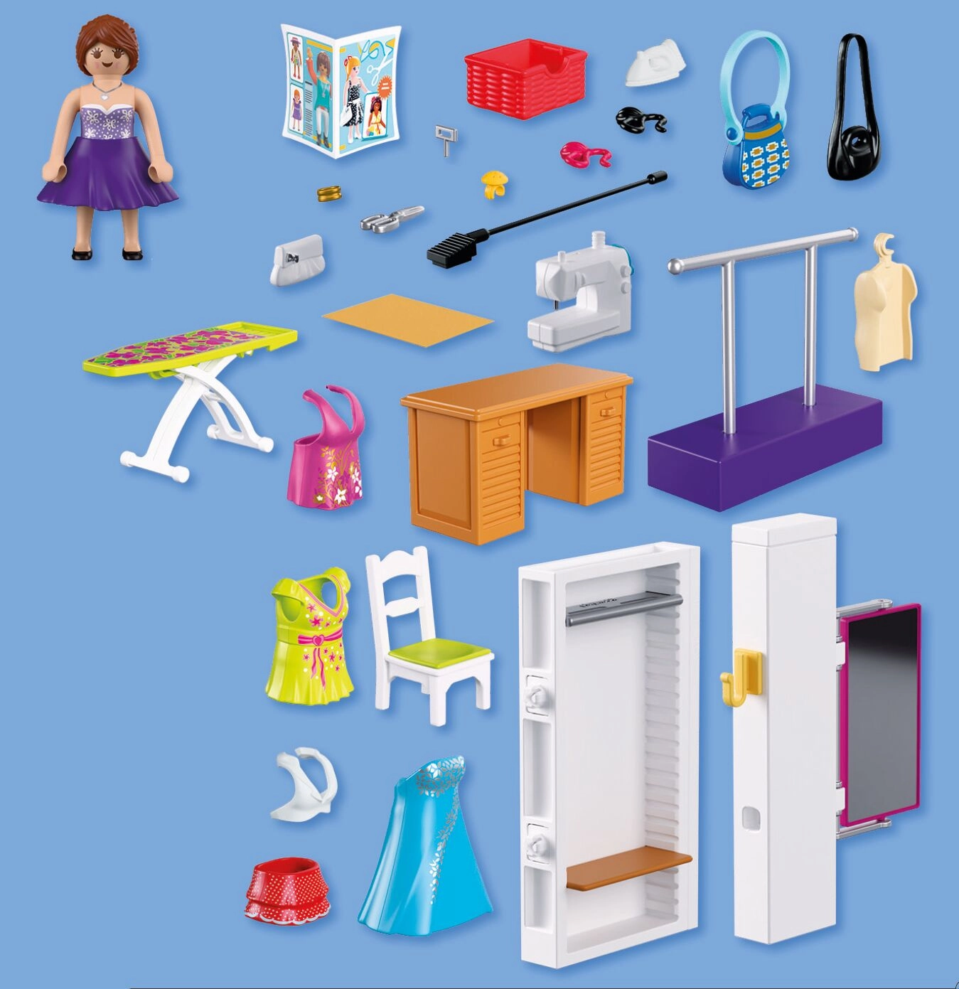 Enthalten ist alles für ein komplettes Modeatelier: Tisch, Stuhl, Stoffe, Schere, Nadelkissen, Wollknäuel, Handtaschen und weitere Kleinigkeiten. Das Set besteht aus 64 Teilen und lässt sich mit weiteren PLAYMOBIL-Sets kombinieren für noch umfangreichere Geschichten.