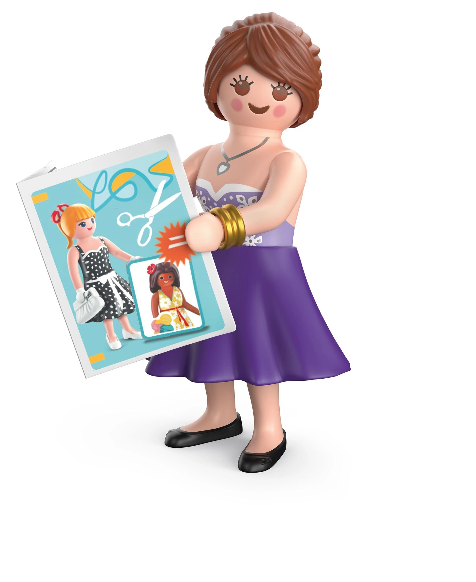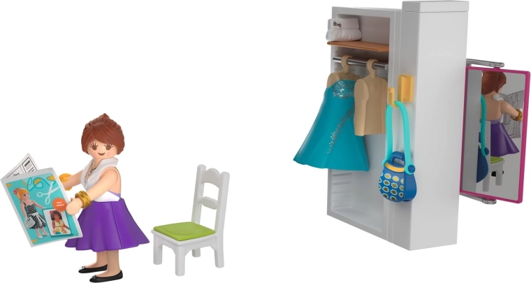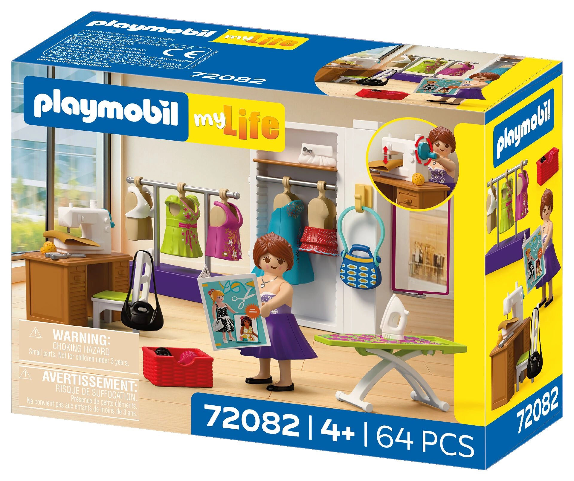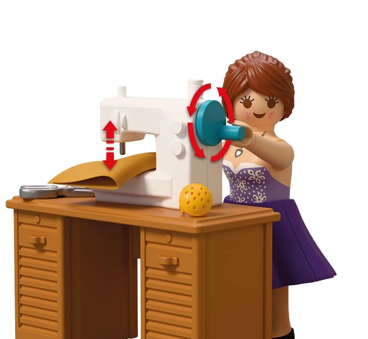 Enthalten ist alles für ein komplettes Modeatelier: Tisch, Stuhl, Stoffe, Schere, Nadelkissen, Wollknäuel, Handtaschen und weitere Kleinigkeiten. Das Set besteht aus 64 Teilen und lässt sich mit weiteren PLAYMOBIL-Sets kombinieren für noch umfangreichere Geschichten.