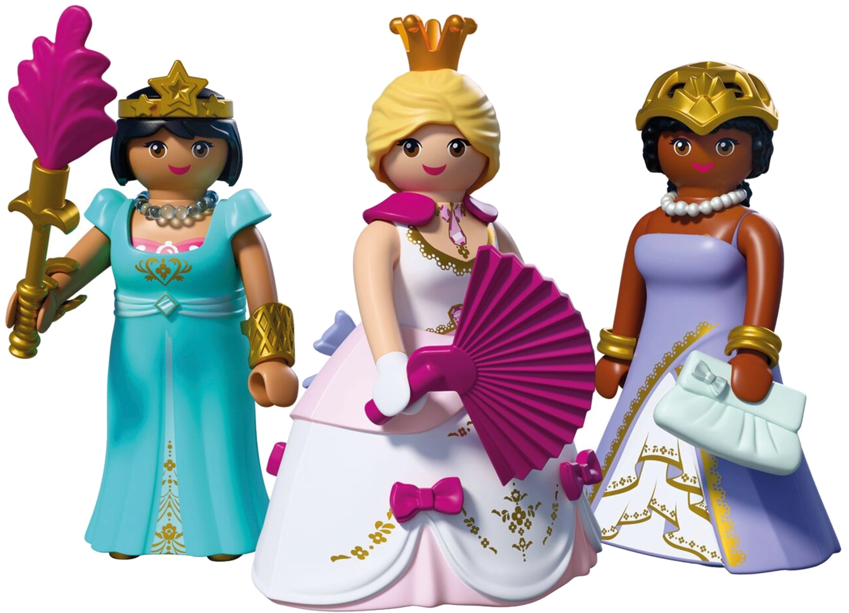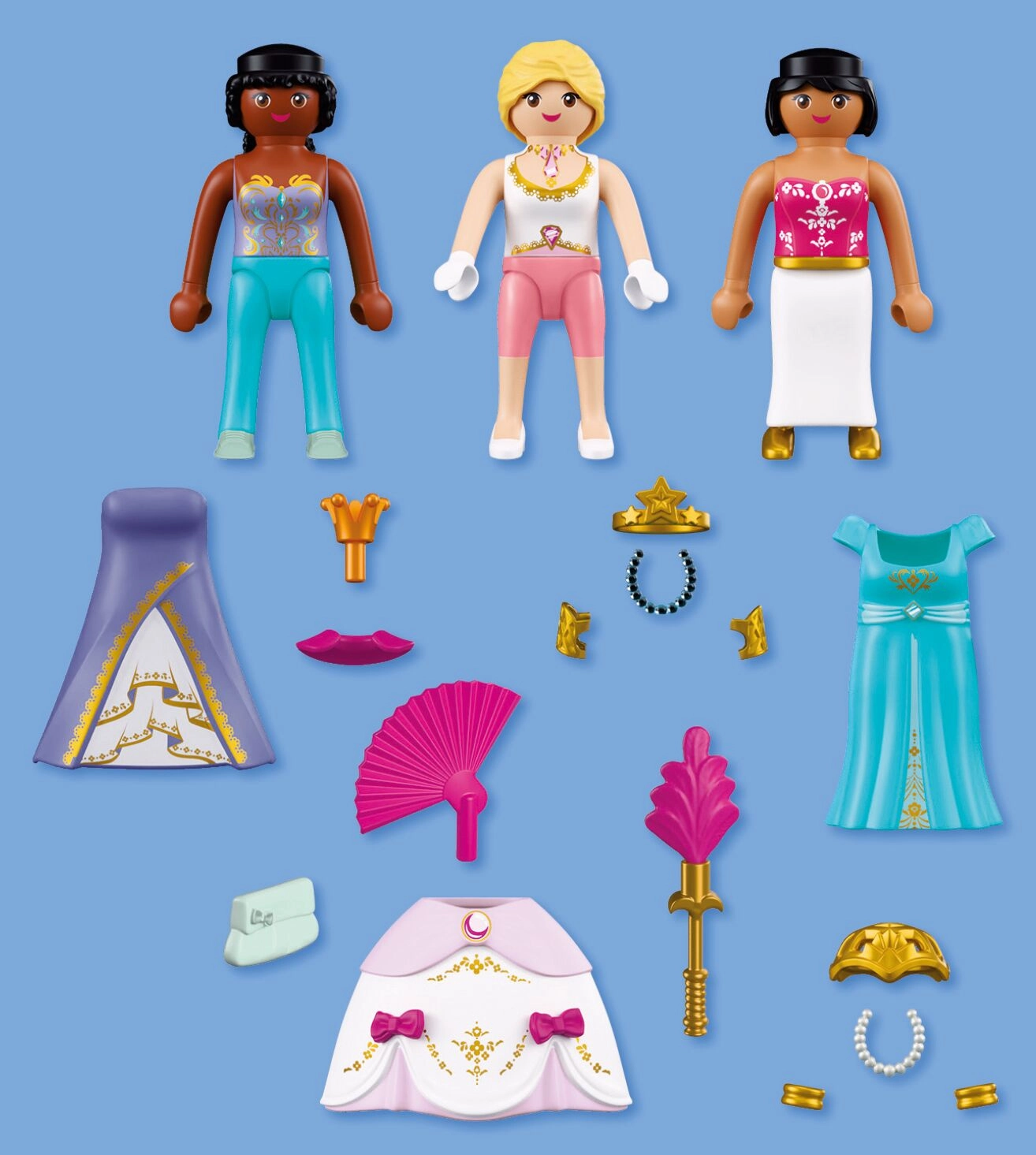 Drei bezaubernde Prinzessinnen laden Kinder in eine Welt königlicher Abenteuer ein. Dank der wechselbaren Kleider, Röcke und Schmuckstücke können kleine Kreative das Aussehen der Figuren im Handumdrehen verändern und immer neue Geschichten erfinden – vom großen Ball bis zu Spaziergängen in den Schlossgärten.