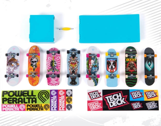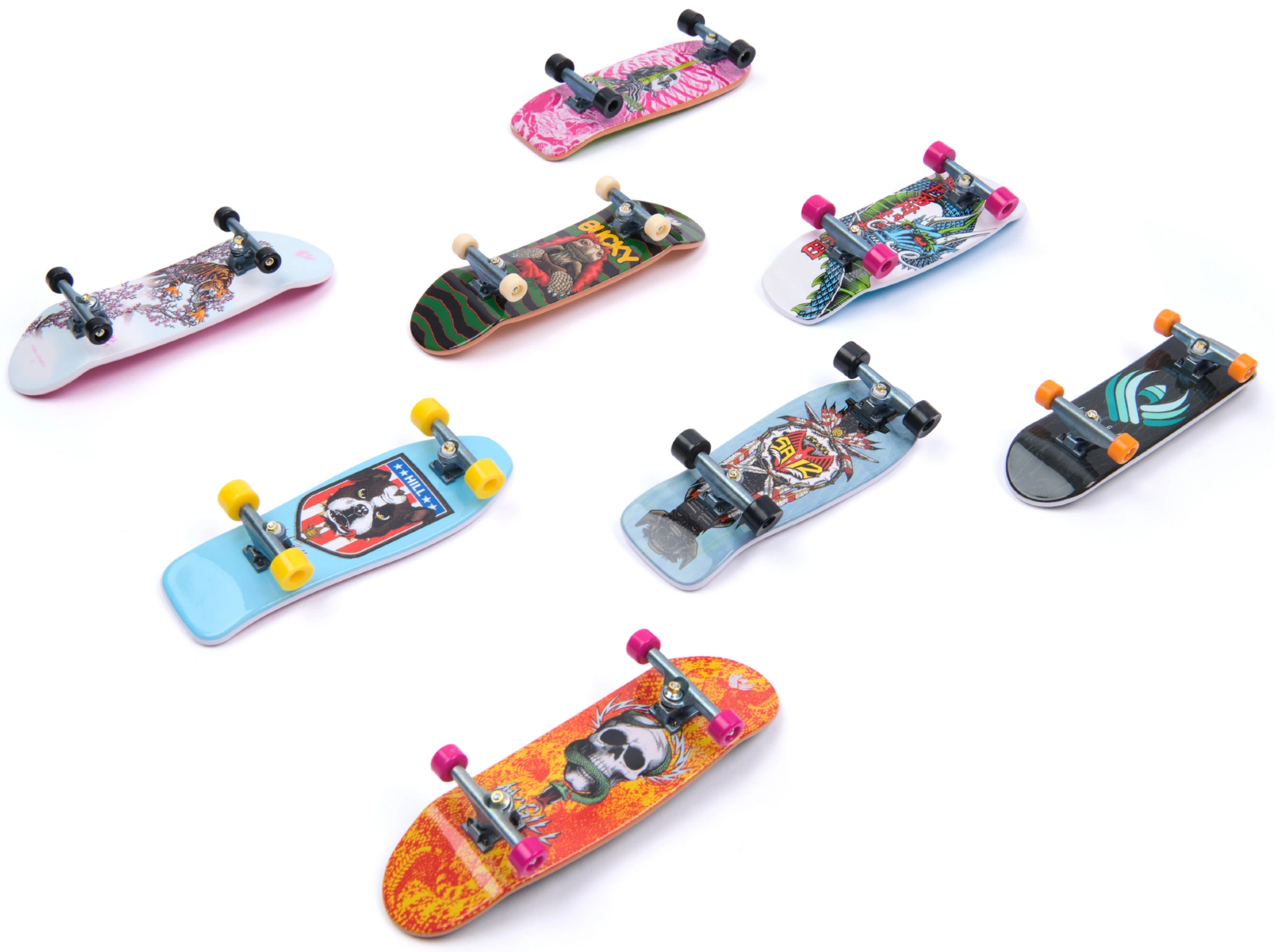 Das Set enthält acht komplette Fingerboards mit auffälligen, farbenfrohen Prints sowie realistischen Trucks und Rollen. Perfekt für die Sammlung und für tägliches Fahren.