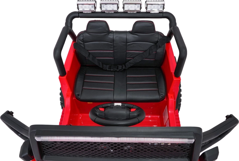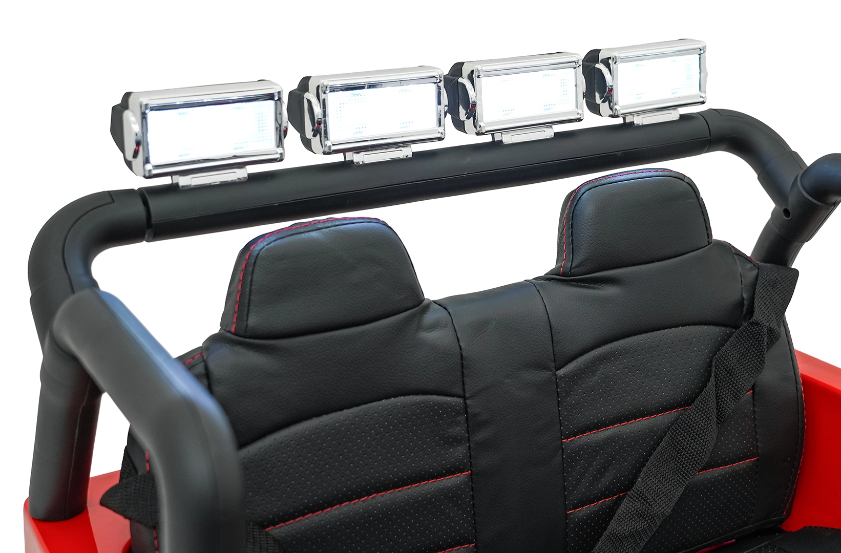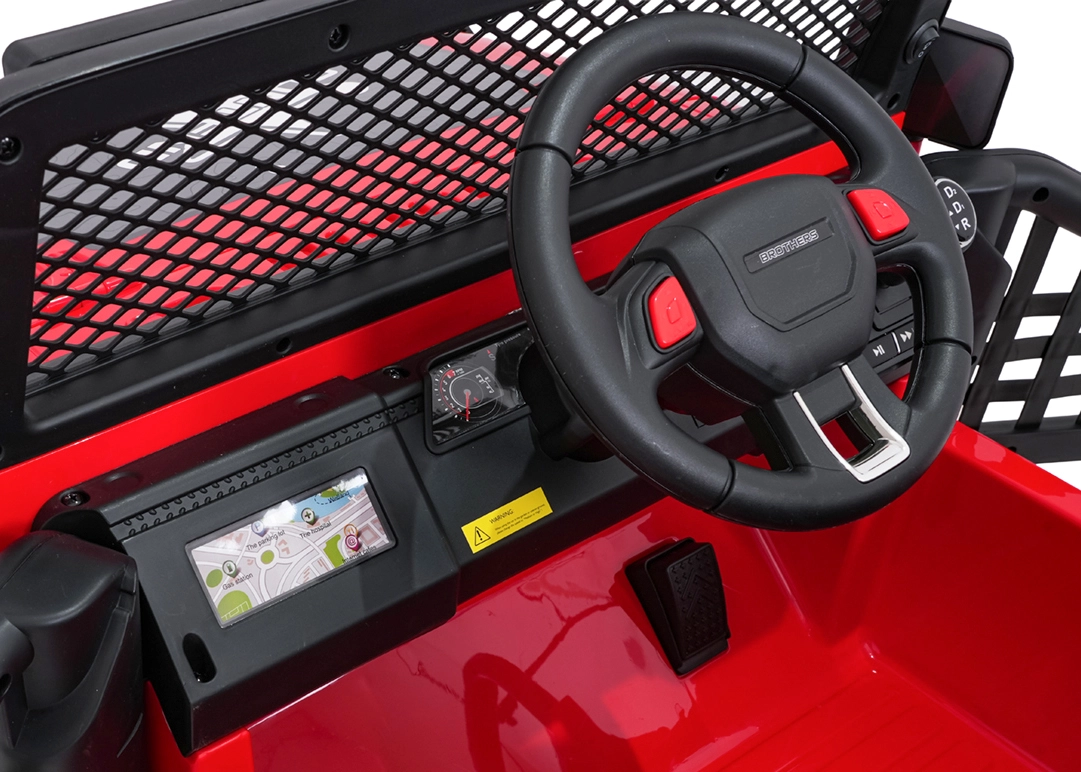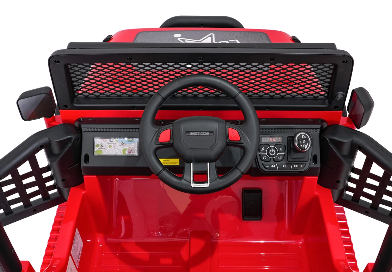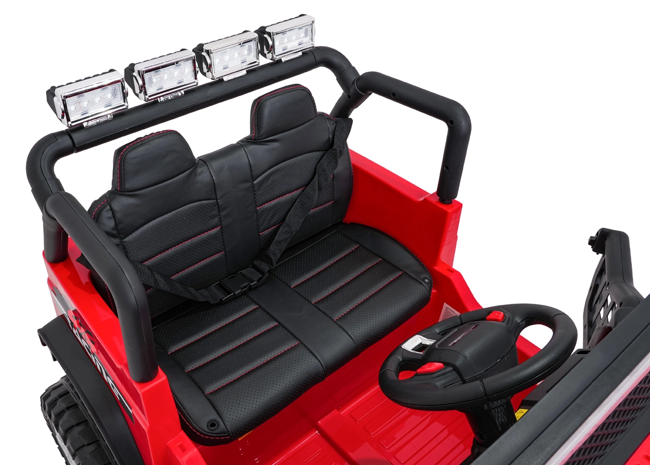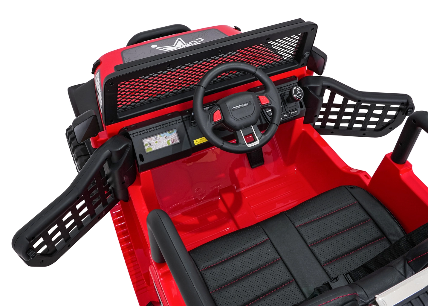 Dieser robuste Kinder-Jeep BEAST 4x4 in Rot ist für kleine Abenteurer gemacht. Vier 45-W-Motoren sorgen auch abseits befestigter Wege für genügend Kraft, während der Doppelakku 2× 12 V 7 Ah Ausflüge maximal verlängert. Weiche EVA-Räder, Federung vorn und hinten sowie sanftes Anfahren gewährleisten eine komfortable und sichere Fahrt.