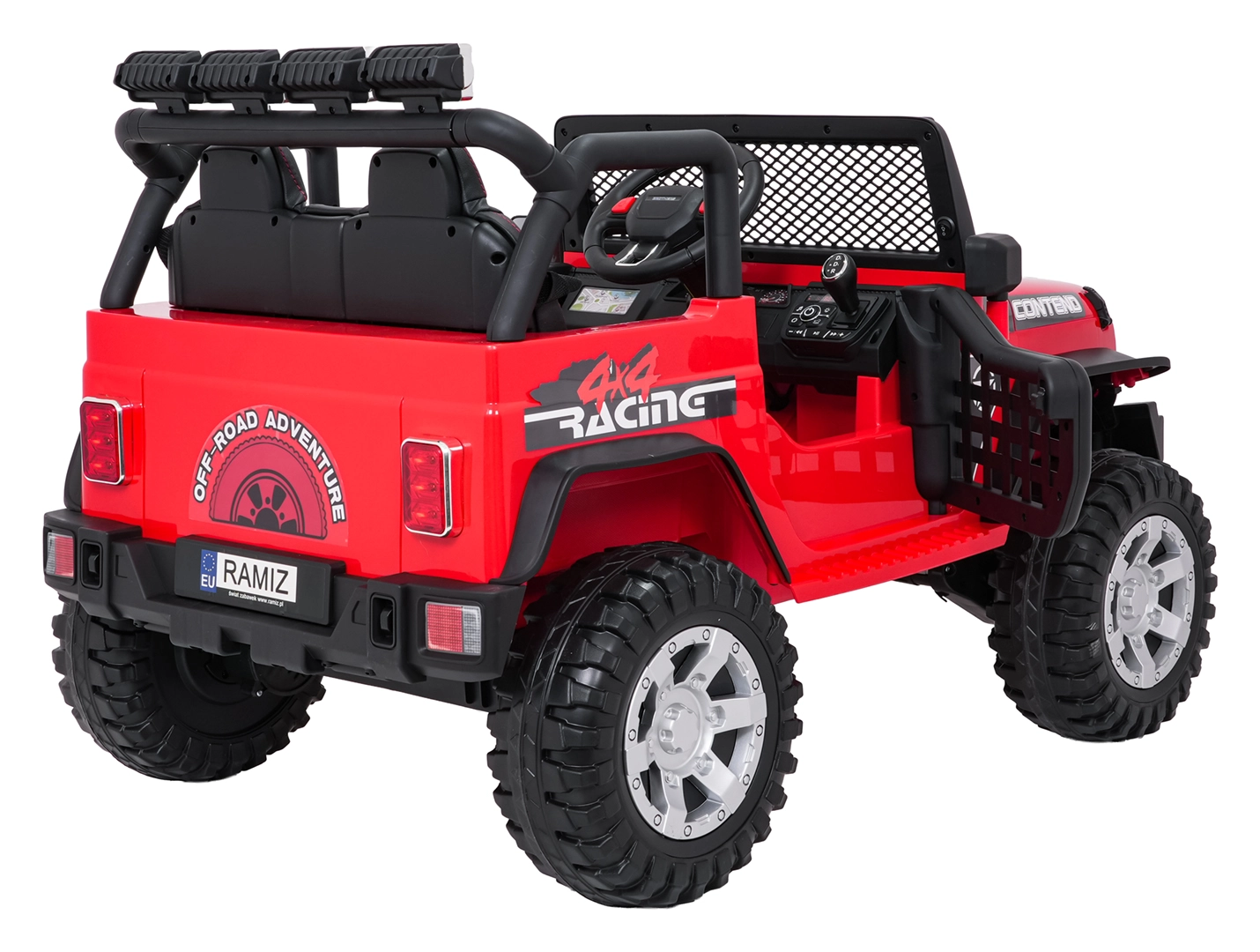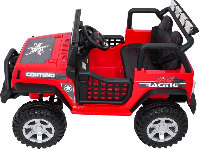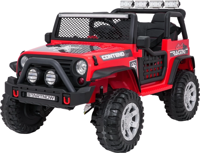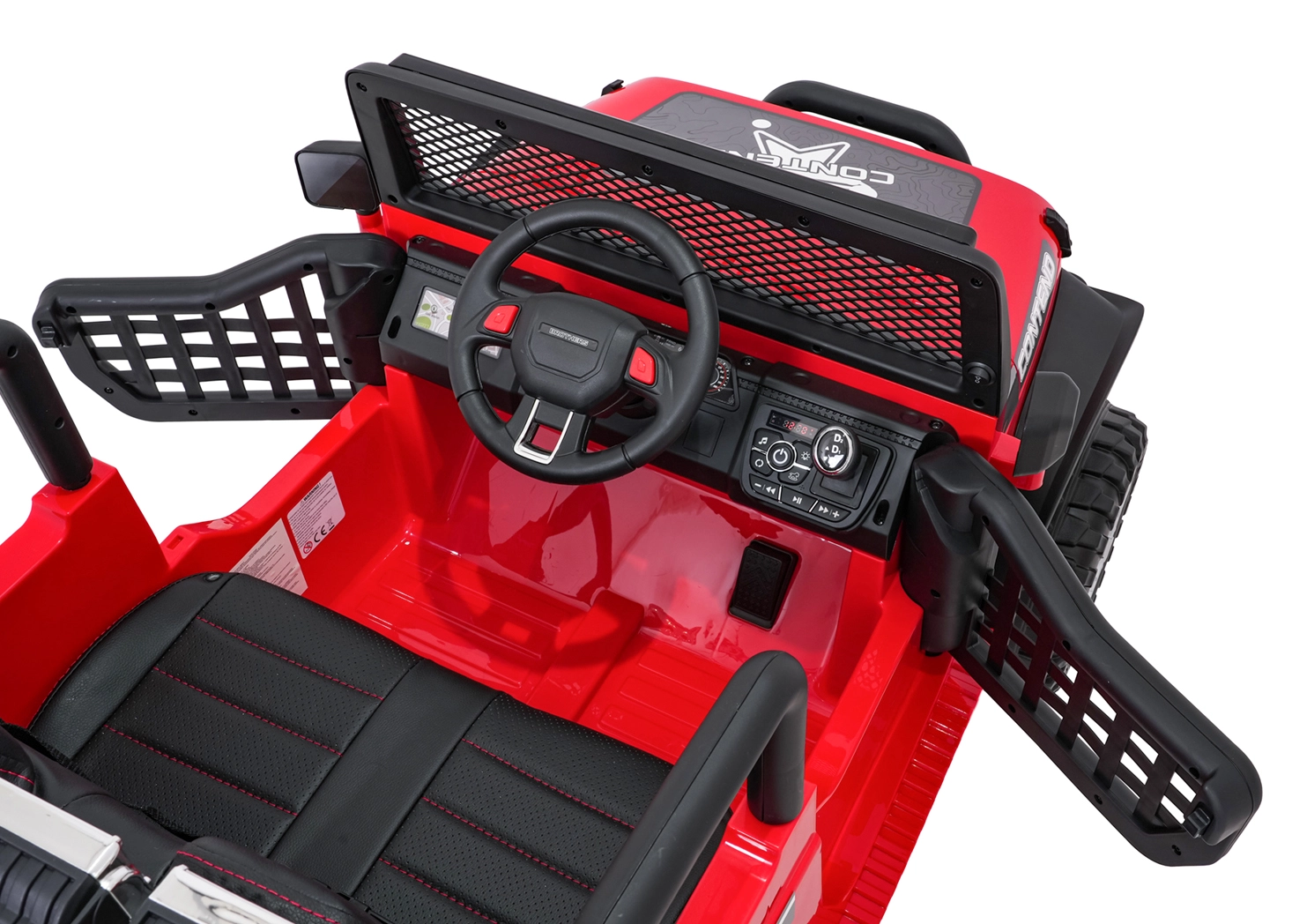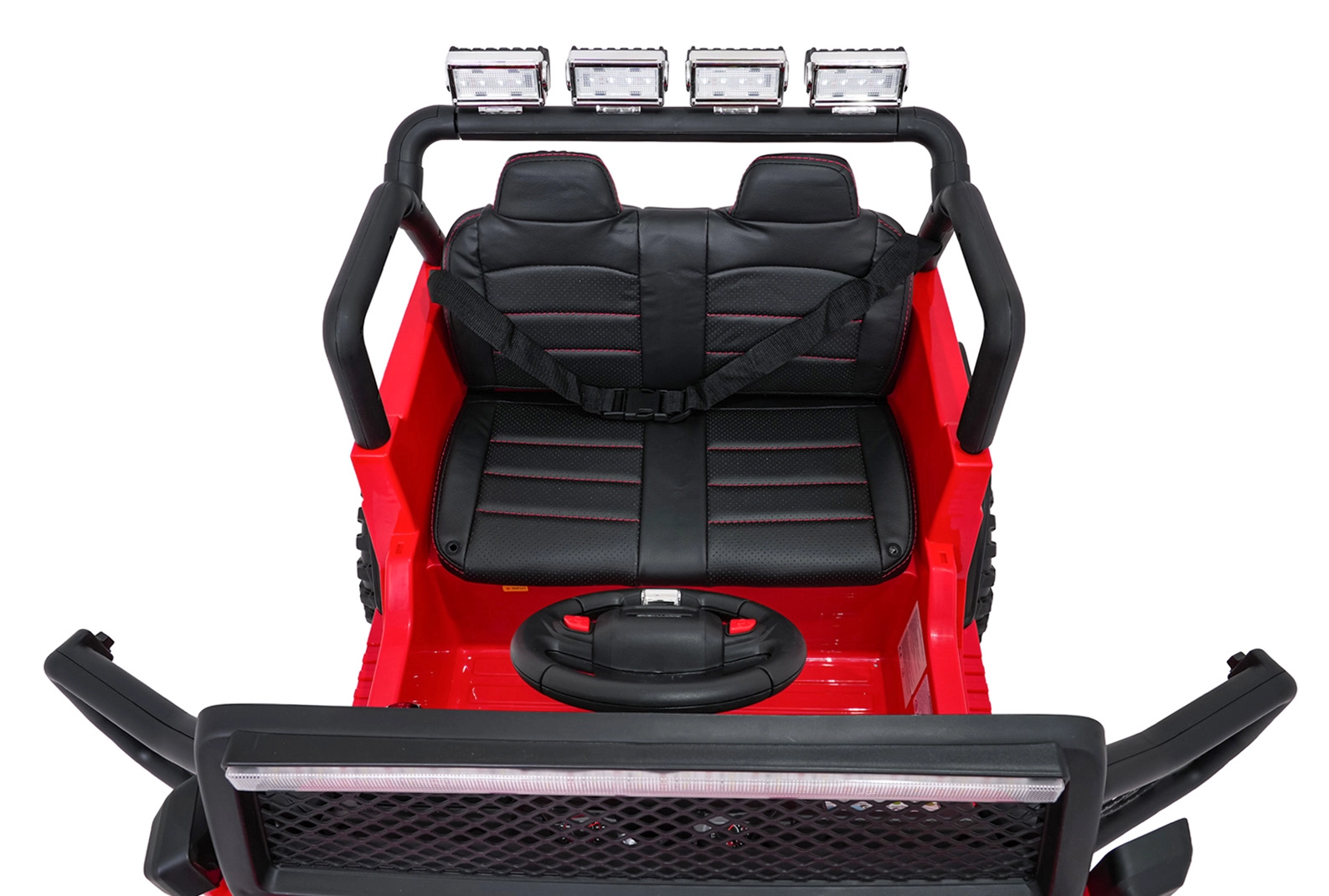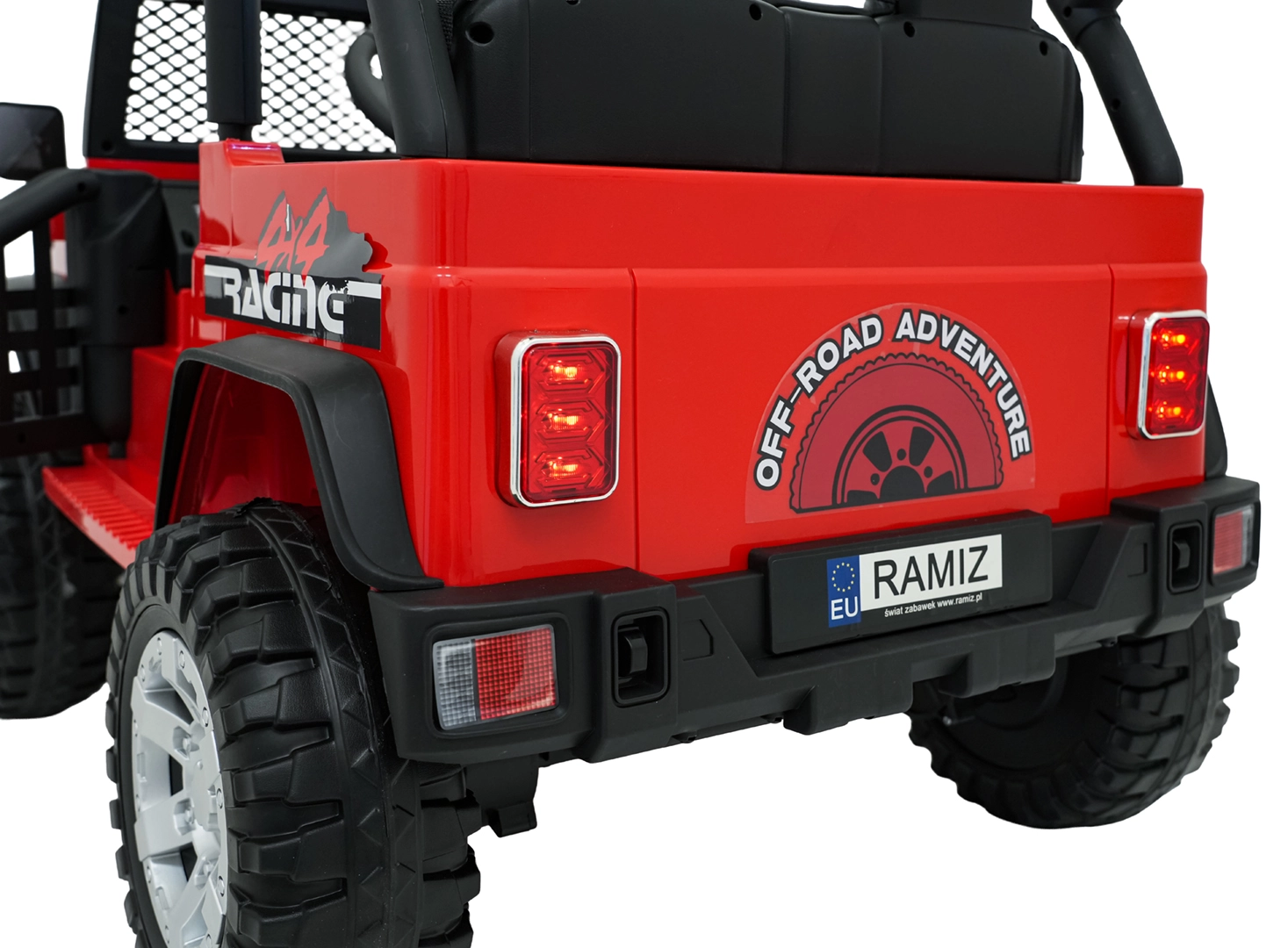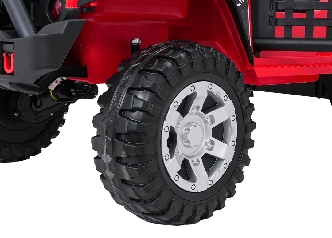 Dieser robuste Kinder-Jeep BEAST 4x4 in Rot ist für kleine Abenteurer gemacht. Vier 45-W-Motoren sorgen auch abseits befestigter Wege für genügend Kraft, während der Doppelakku 2× 12 V 7 Ah Ausflüge maximal verlängert. Weiche EVA-Räder, Federung vorn und hinten sowie sanftes Anfahren gewährleisten eine komfortable und sichere Fahrt.