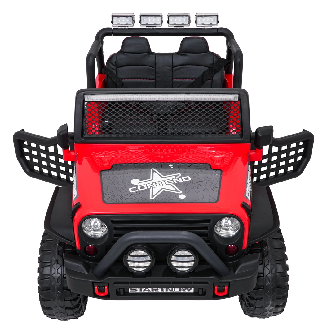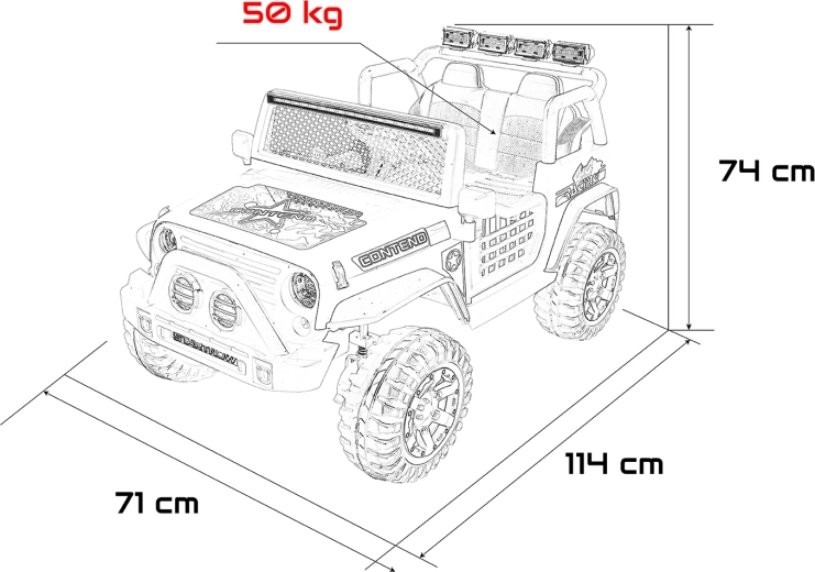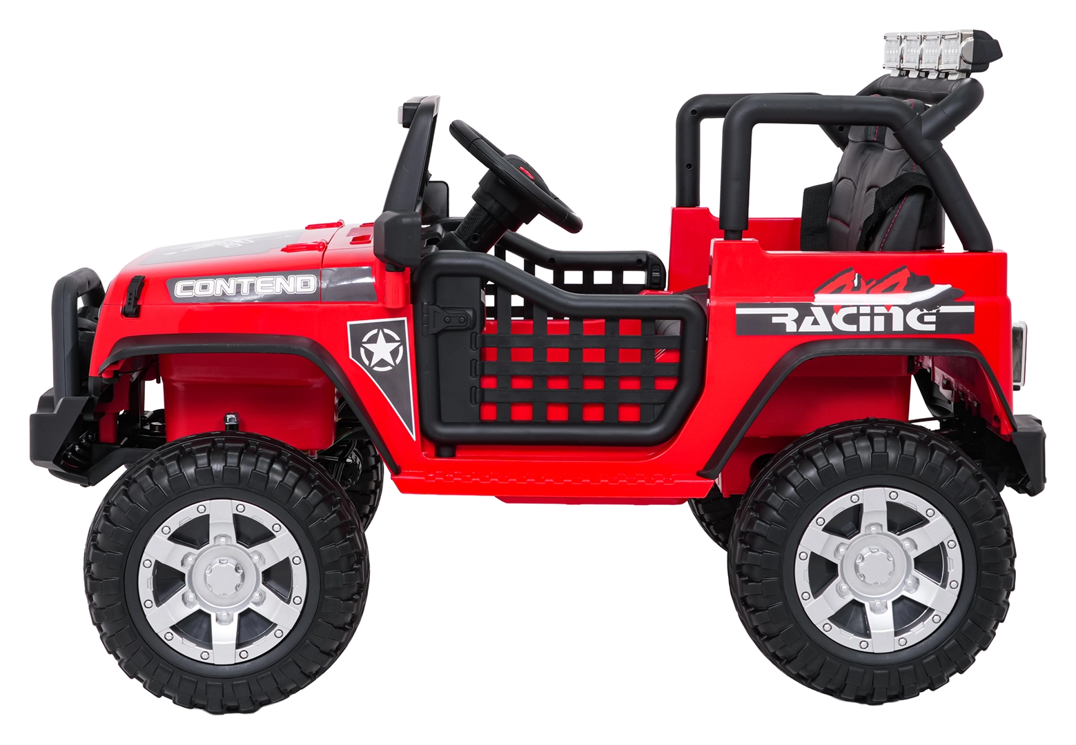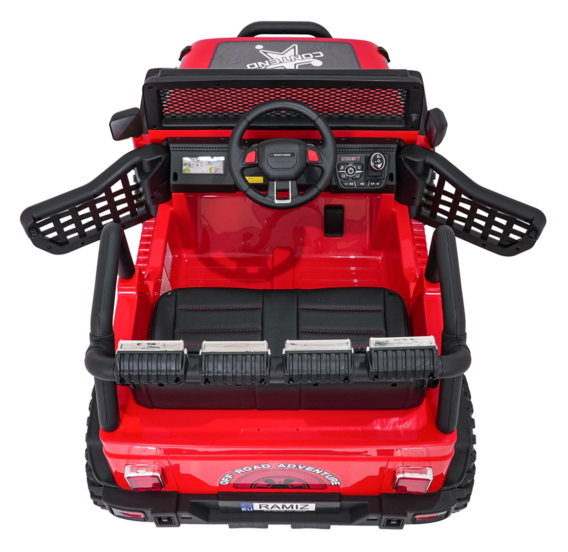 Eltern schätzen die Fernsteuerung mit 2,4 GHz, 3 Geschwindigkeiten und dem Not-Stopp-Knopf. Öffnende Türen, hohe Bodenfreiheit und eine Tragfähigkeit von 50 kg machen dieses Fahrzeug zur idealen Wahl für Hof und leichtes Gelände.