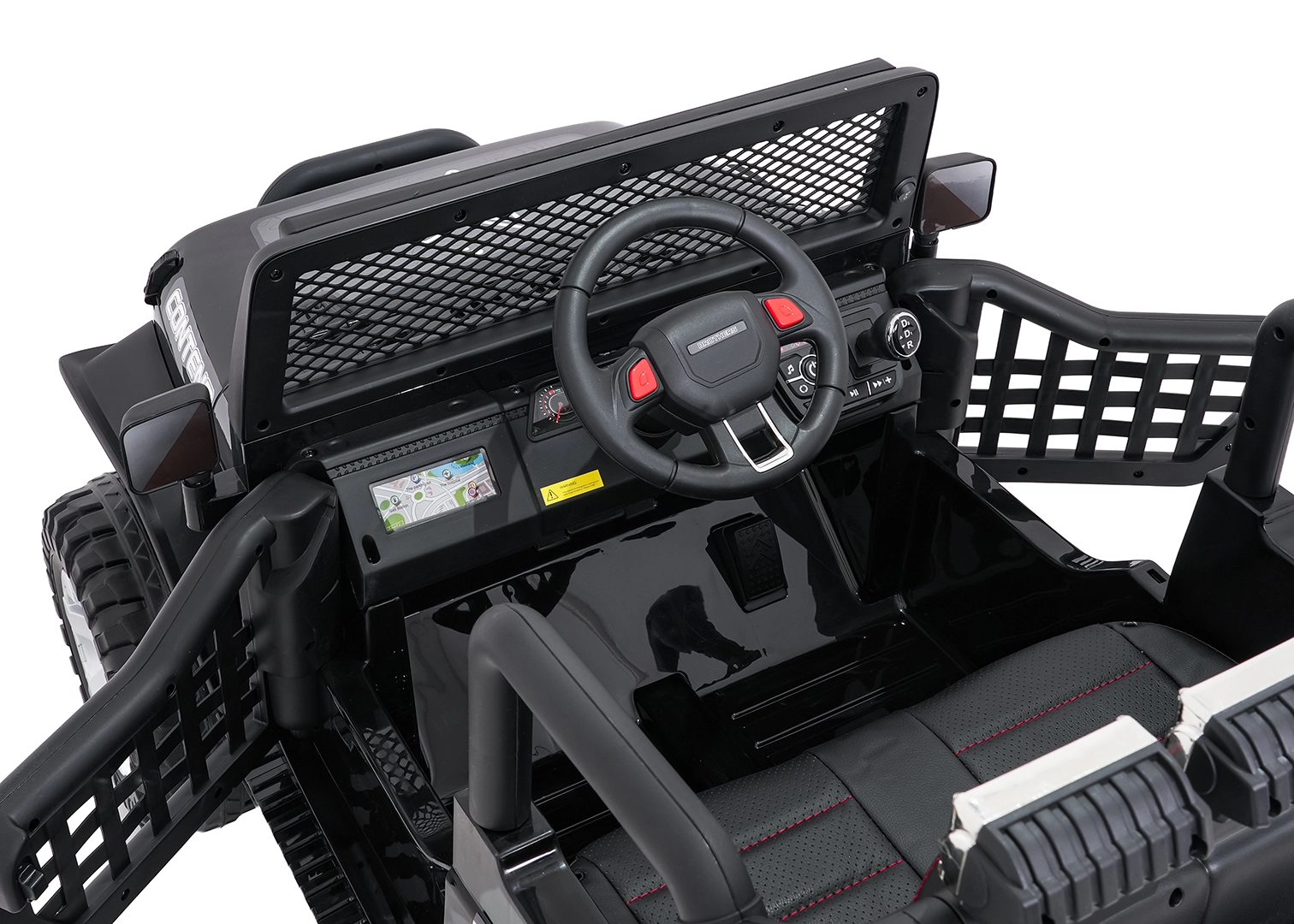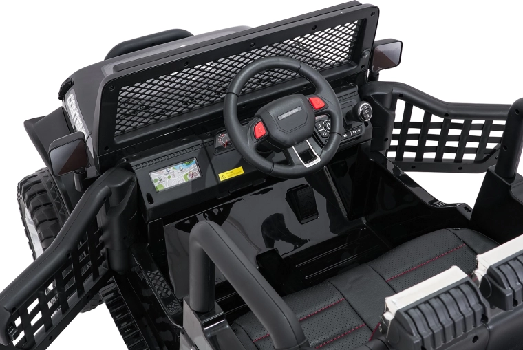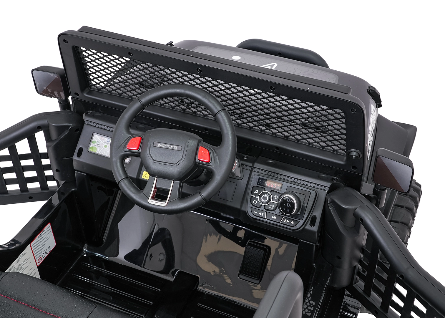 Der doppelte Sitz aus Kunstleder mit Sicherheitsgurten bietet Platz und Komfort. Eltern schätzen die 2,4‑GHz‑Fernbedienung mit drei Geschwindigkeiten und Not‑Stop‑Taste. Kleine Fahrer freuen sich über das Multimedia-Panel mit FM‑Radio, MP3, USB, AUX und Bluetooth, Soundtasten und Hupe am Lenkrad sowie die Batteriestandsanzeige.