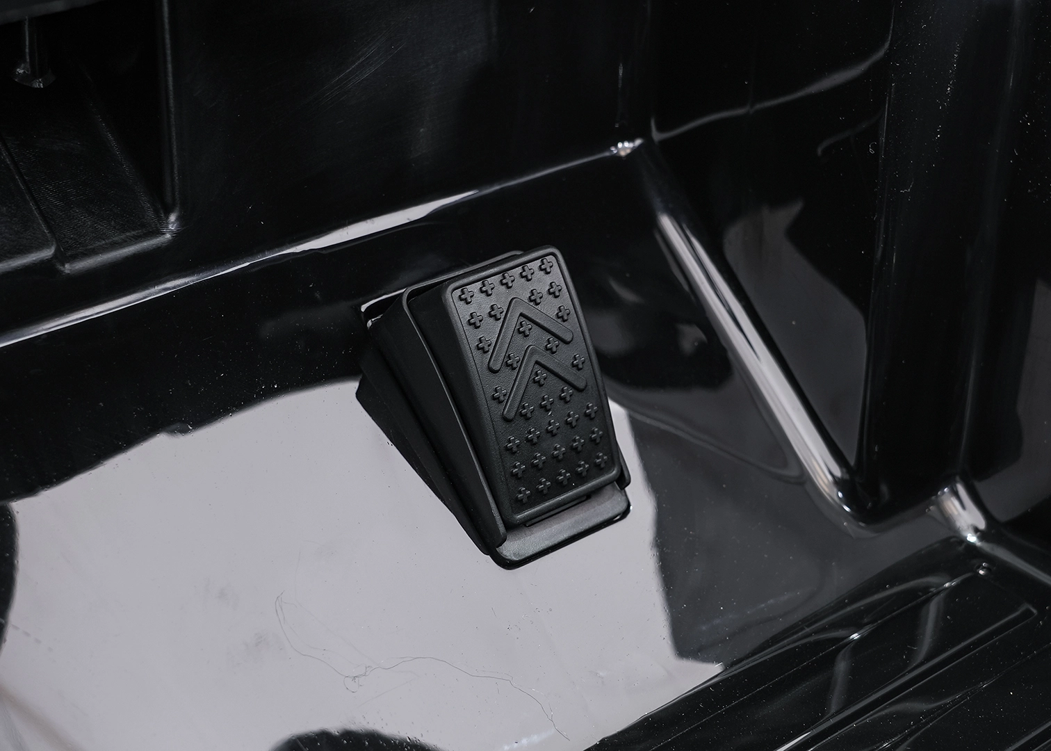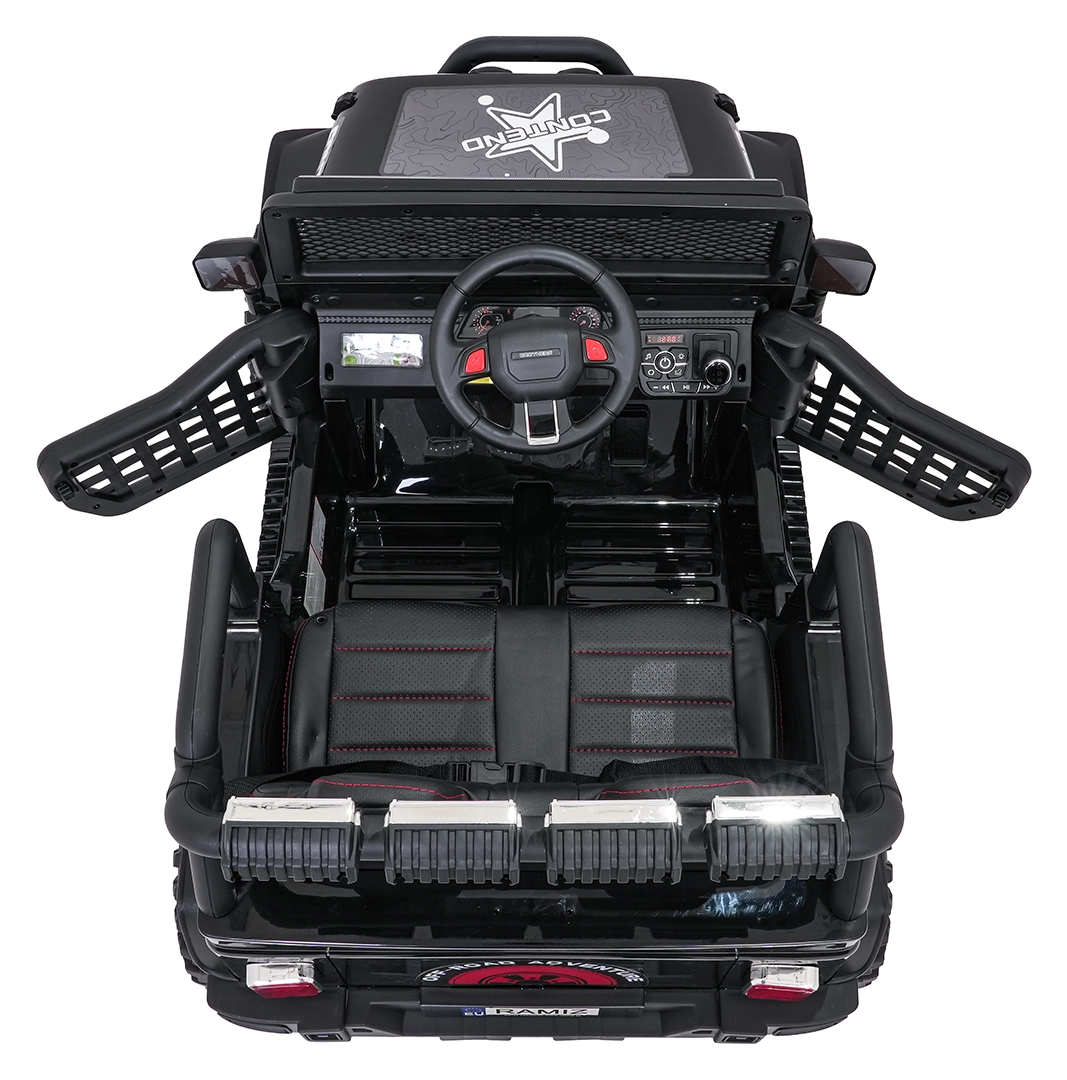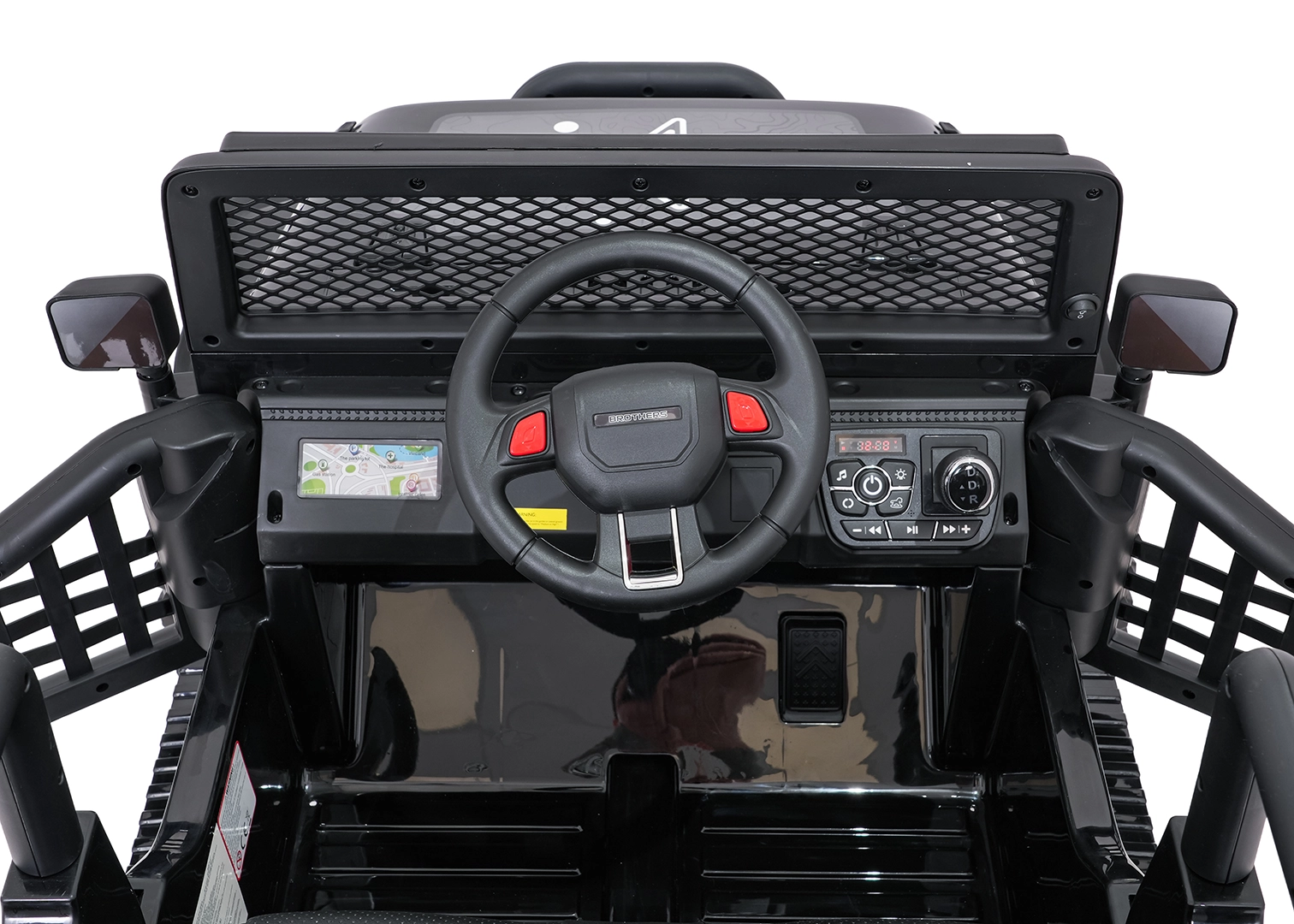 Der doppelte Sitz aus Kunstleder mit Sicherheitsgurten bietet Platz und Komfort. Eltern schätzen die 2,4‑GHz‑Fernbedienung mit drei Geschwindigkeiten und Not‑Stop‑Taste. Kleine Fahrer freuen sich über das Multimedia-Panel mit FM‑Radio, MP3, USB, AUX und Bluetooth, Soundtasten und Hupe am Lenkrad sowie die Batteriestandsanzeige.
