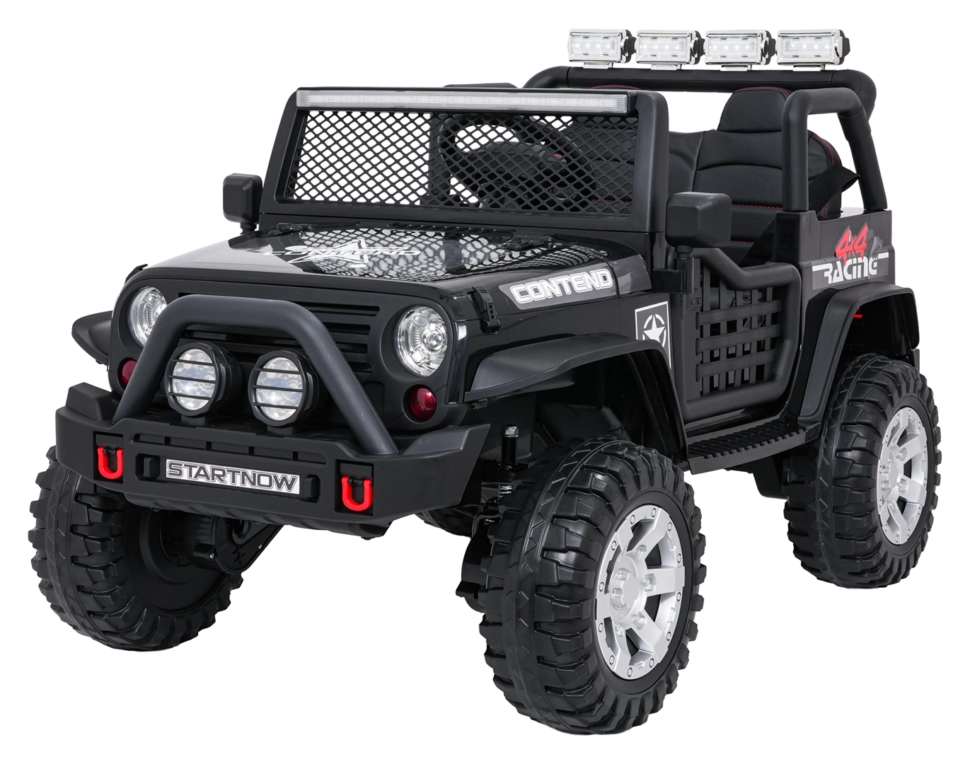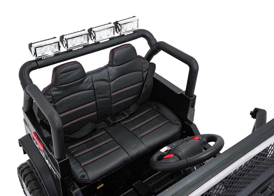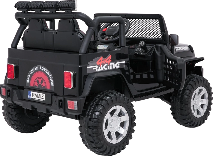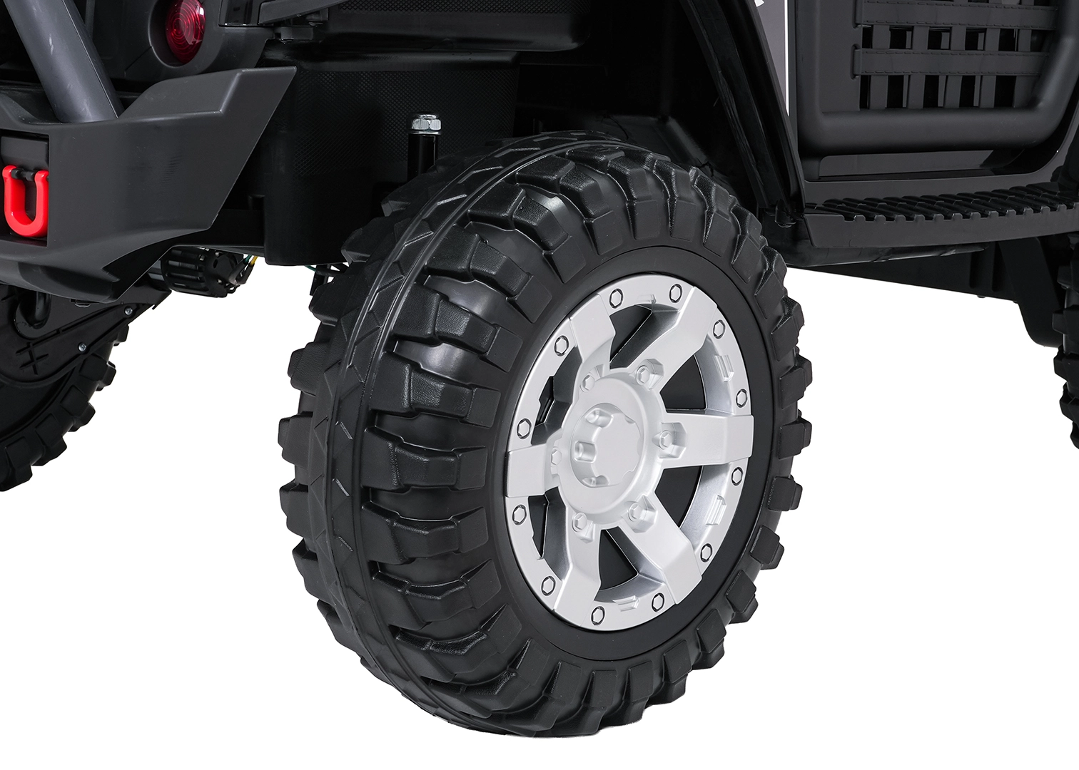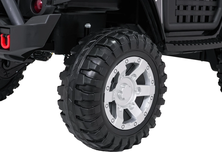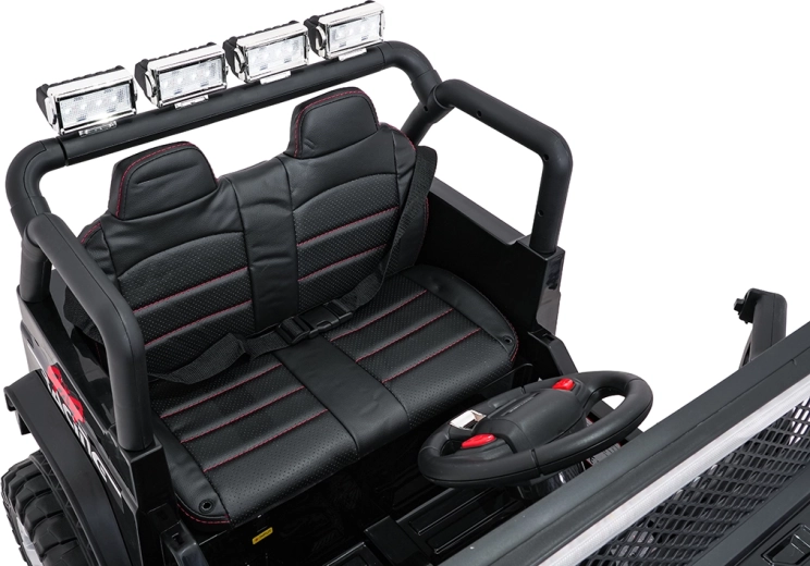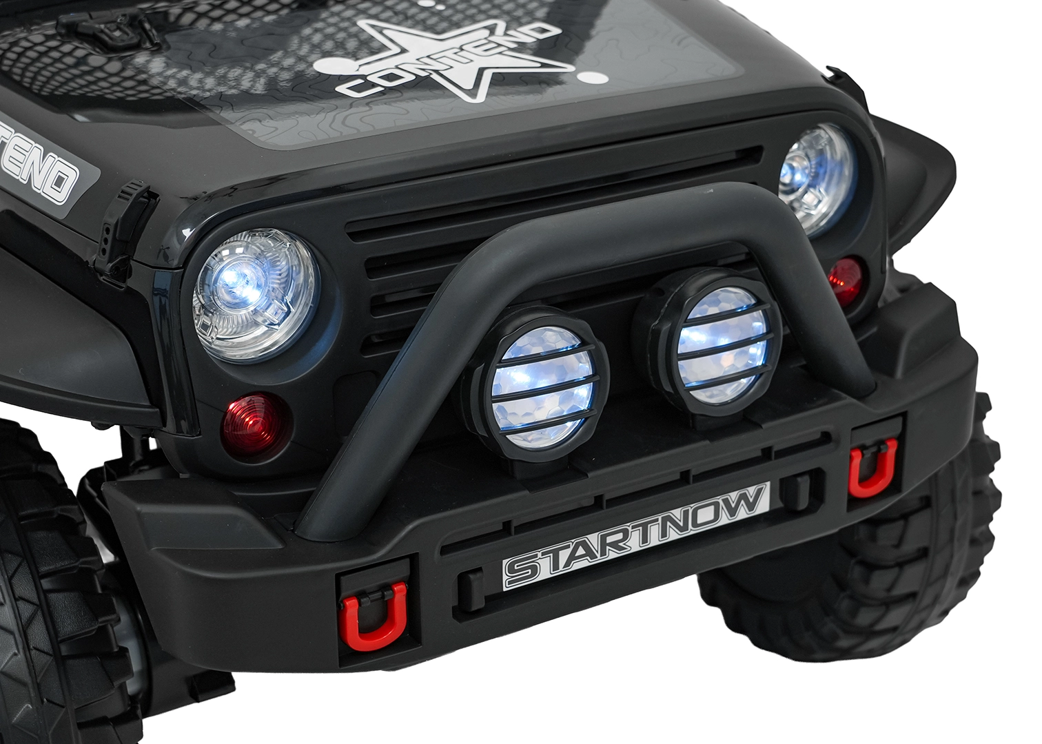 Dieser schwarze Offroad-Champion ist für Abenteuer gemacht. Dank Allradantrieb 4x4, hoher Bodenfreiheit und weichen EVA-Rädern meistert er Unebenheiten und Gartengelände. Sanftes Anfahren, zwei Geschwindigkeiten sowie Vorwärts-/Rückwärtsfahrt sorgen für komfortable und sichere Bedienung. Die LED-Beleuchtung (vorne, hinten und Dachlichtleiste) verleiht einen realistischen Look und bessere Sichtbarkeit.