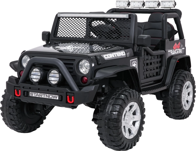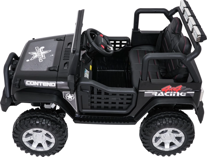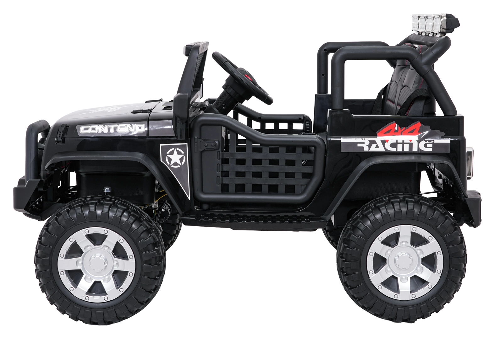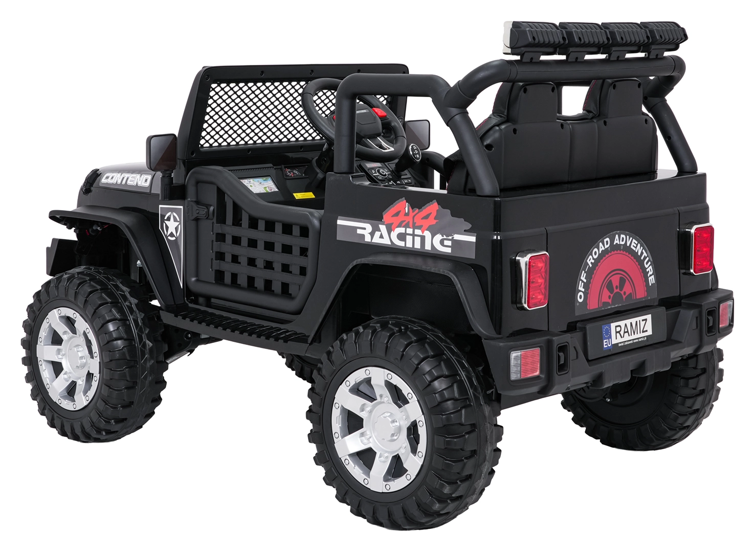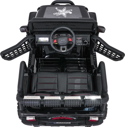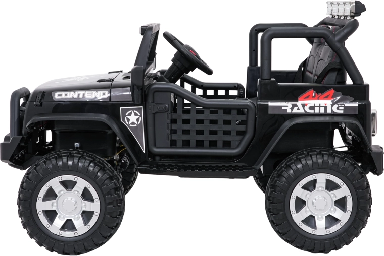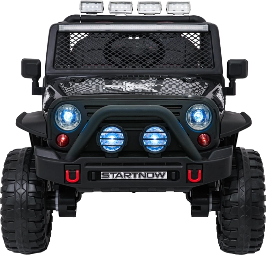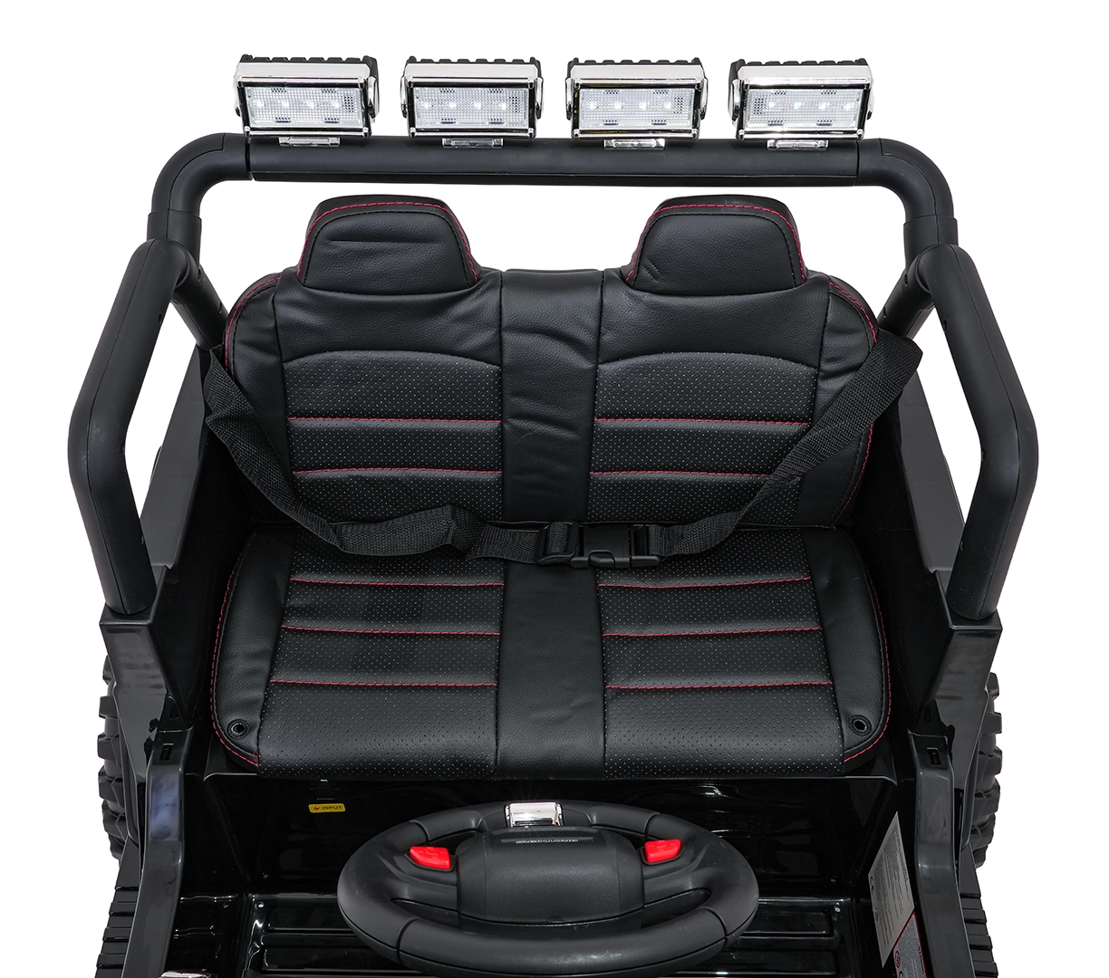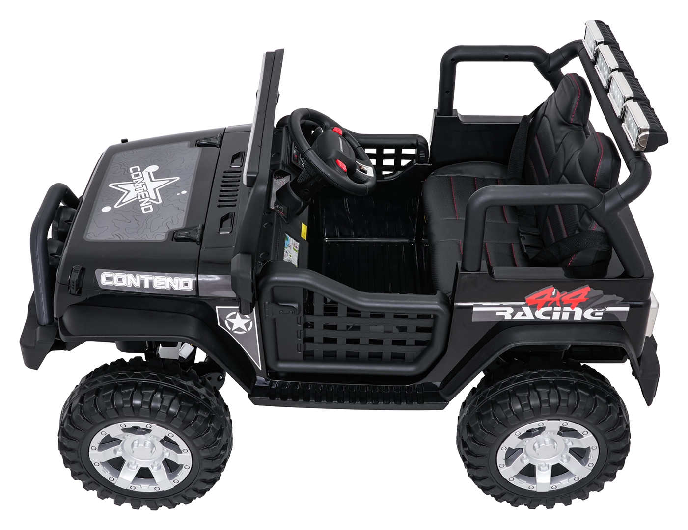 Dieser schwarze Offroad-Champion ist für Abenteuer gemacht. Dank Allradantrieb 4x4, hoher Bodenfreiheit und weichen EVA-Rädern meistert er Unebenheiten und Gartengelände. Sanftes Anfahren, zwei Geschwindigkeiten sowie Vorwärts-/Rückwärtsfahrt sorgen für komfortable und sichere Bedienung. Die LED-Beleuchtung (vorne, hinten und Dachlichtleiste) verleiht einen realistischen Look und bessere Sichtbarkeit.